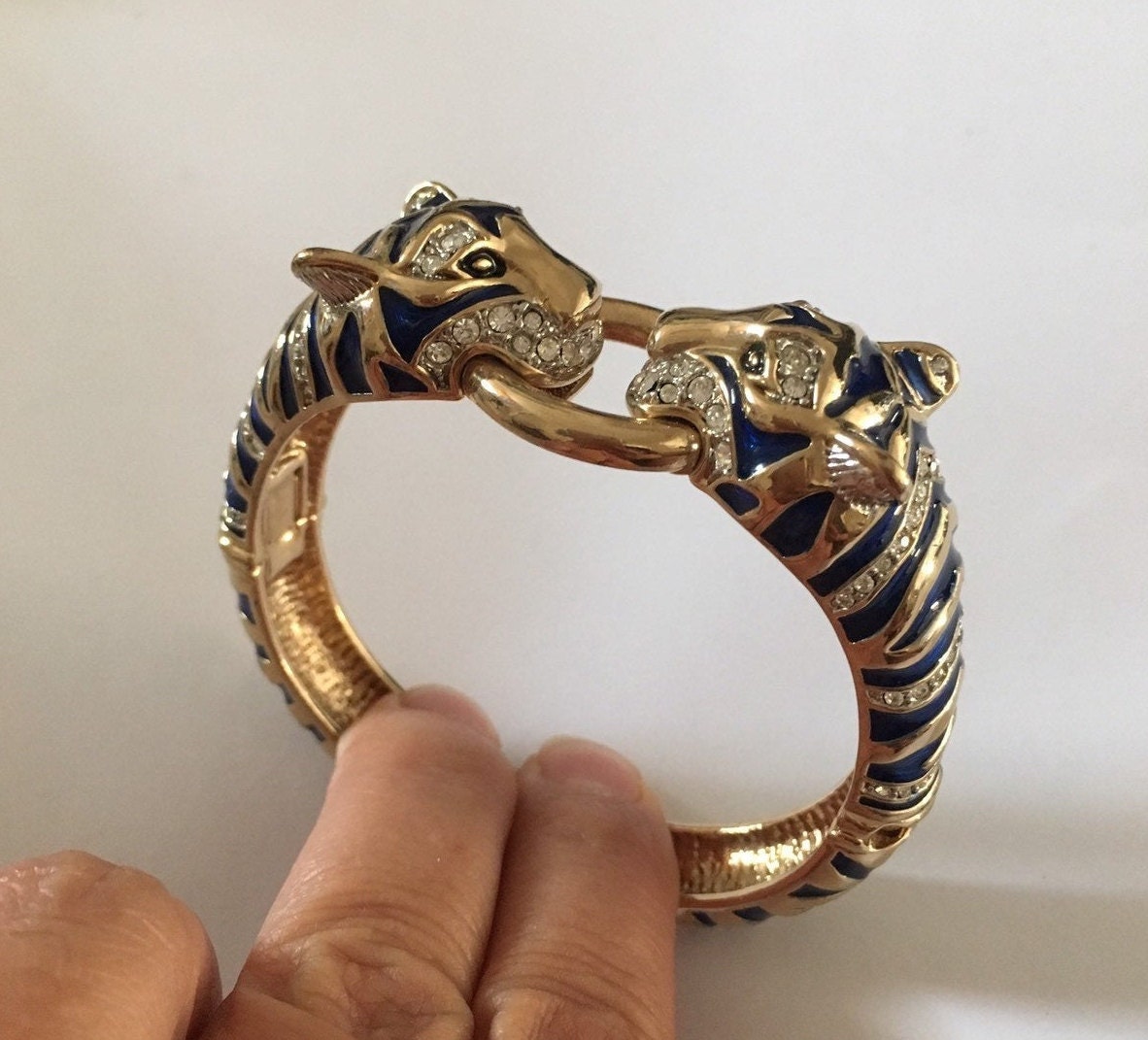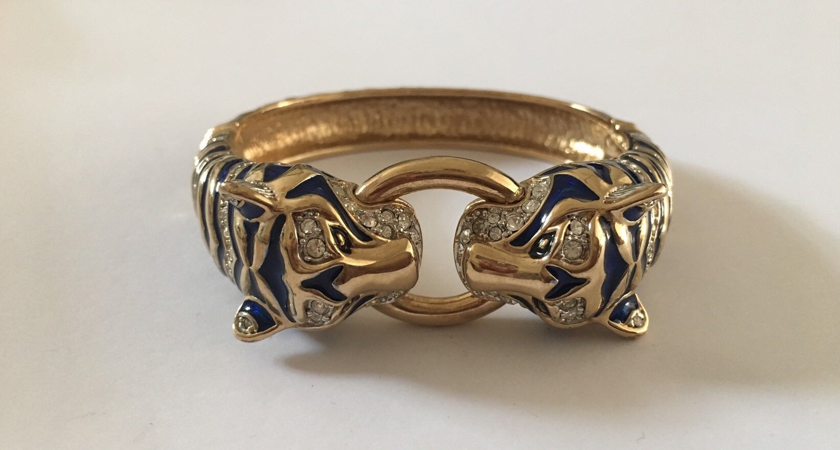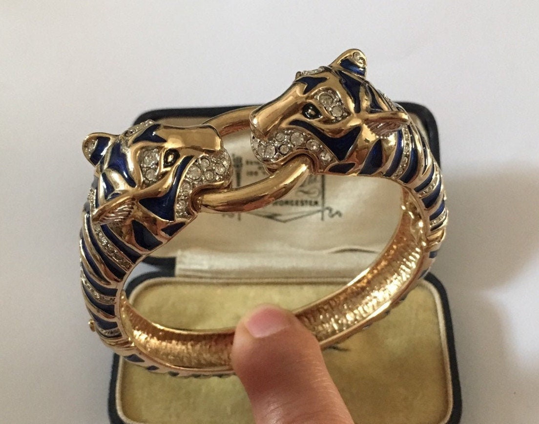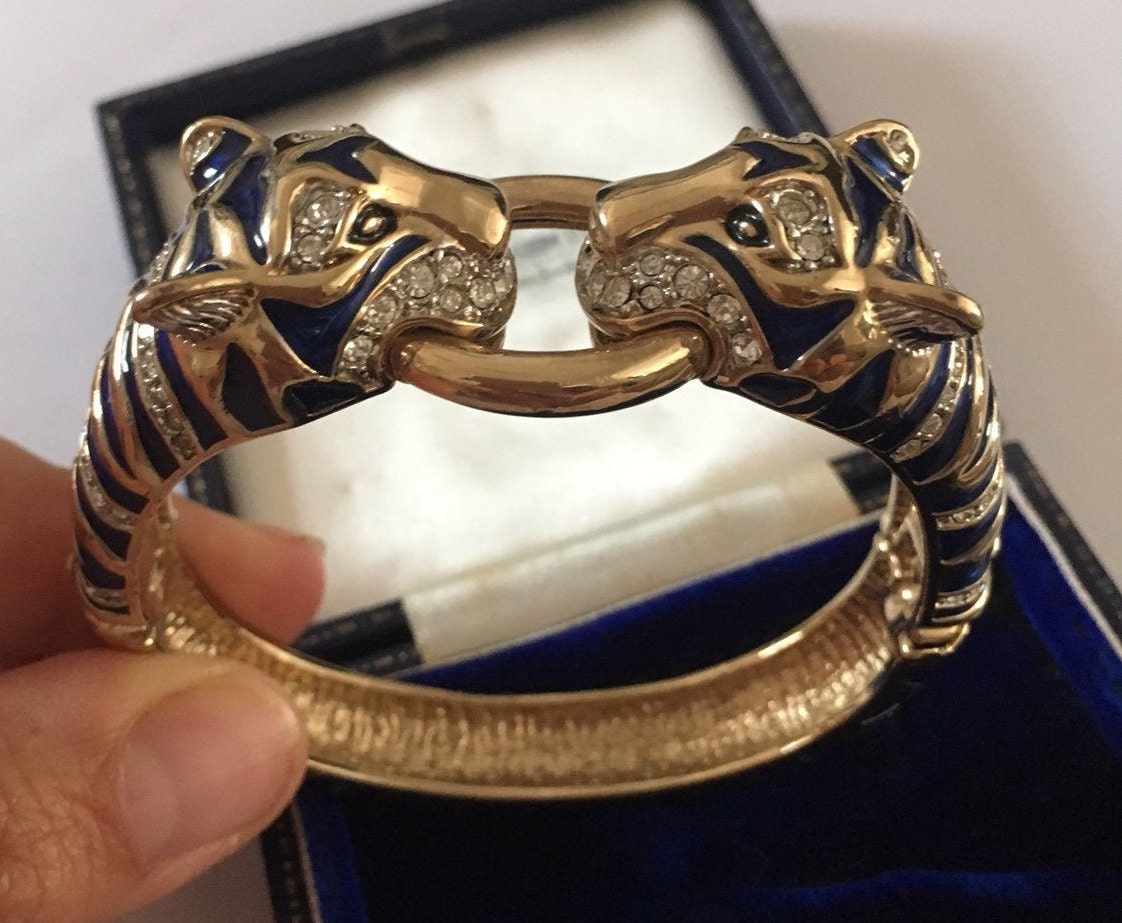I don't know where to start with this piece. Its utterly divine. Superb Vintage Panther Costume bracelet with Exquisite Rhinestones and Crystals with breath taking Enamelled craftsman ship. Great detail in the face with lovely movement and design. The Quality is wonderful. Extremely rare one in a million piece.