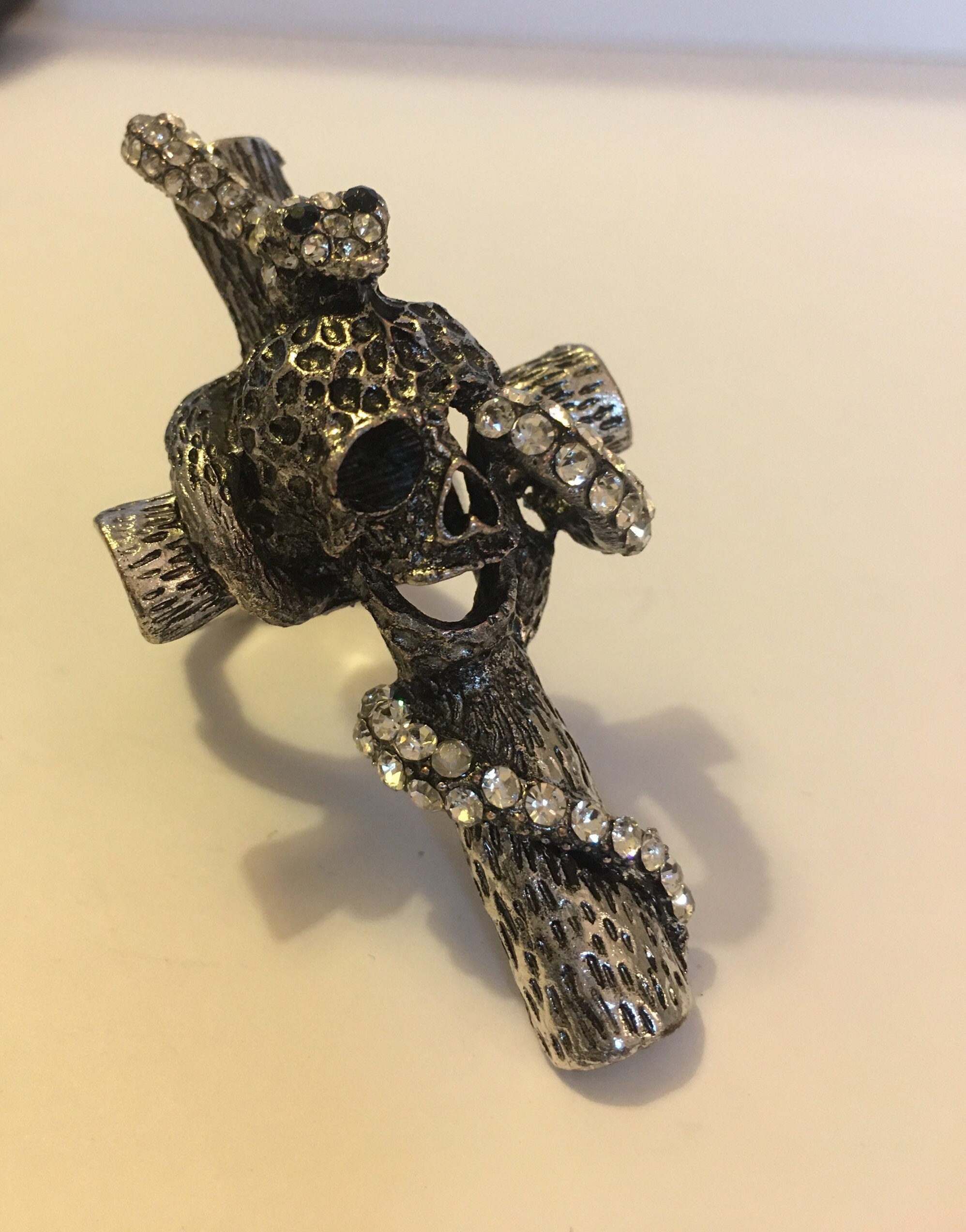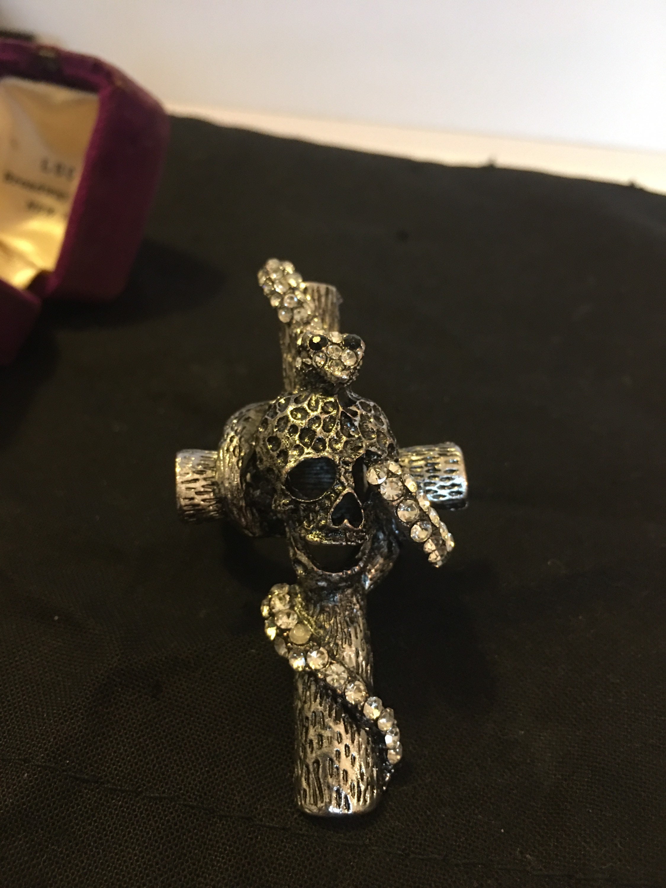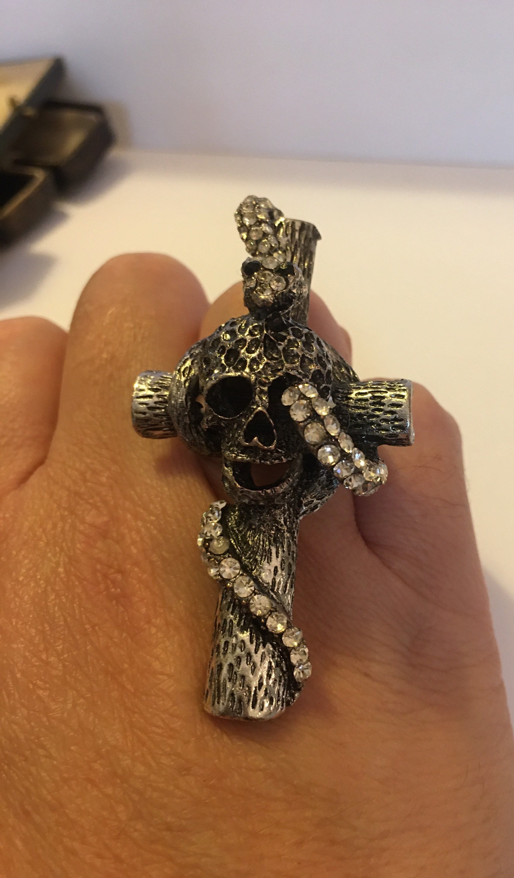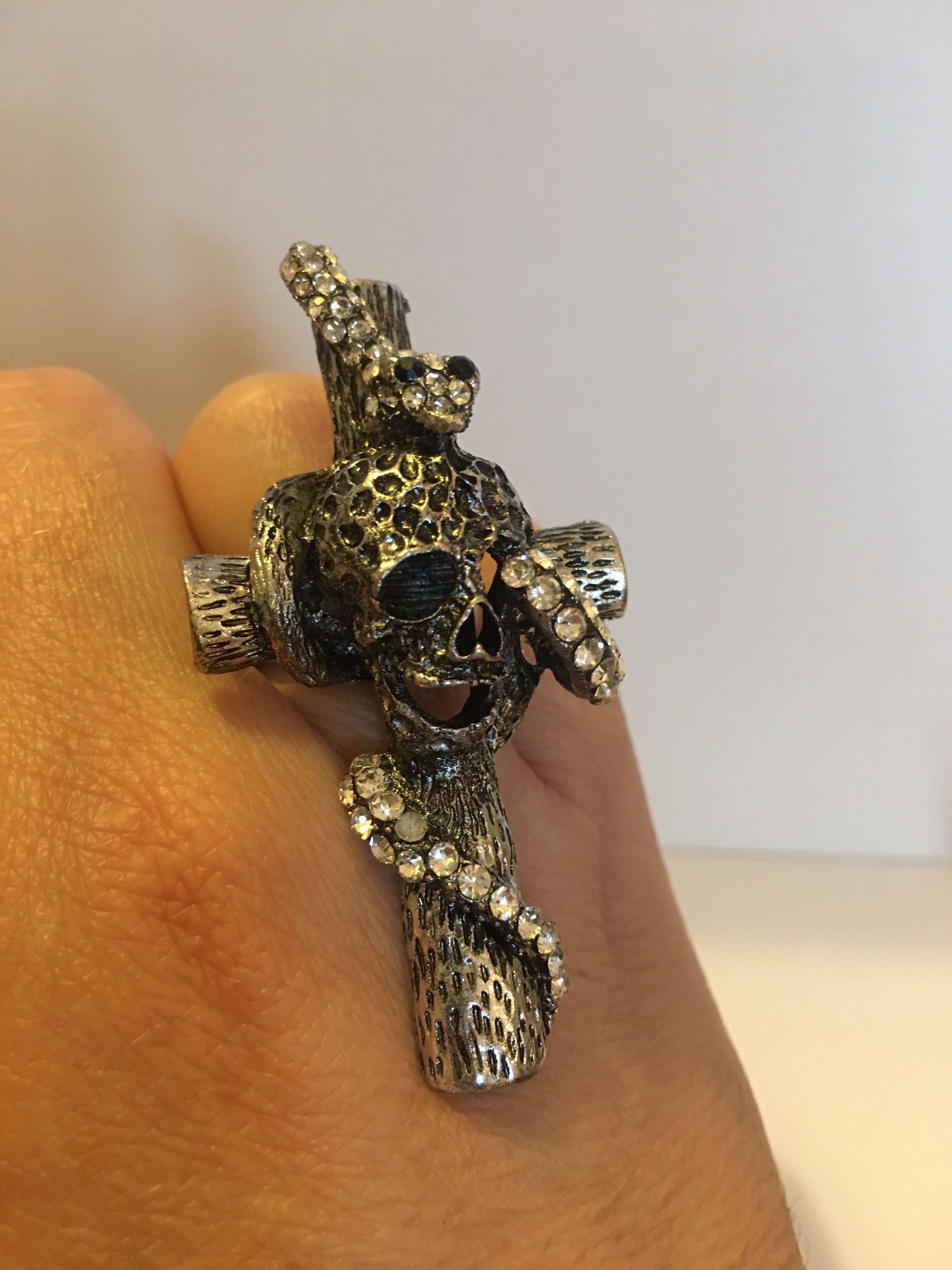 A divine Costume fantastic design Skull ring with fabulous rhinestone detail and exquisite cross and snake design. Adjustable so it moves and fits any size finger perfectly. Great quality. Looks so cool on. Fantastic statement piece for any skull lover.