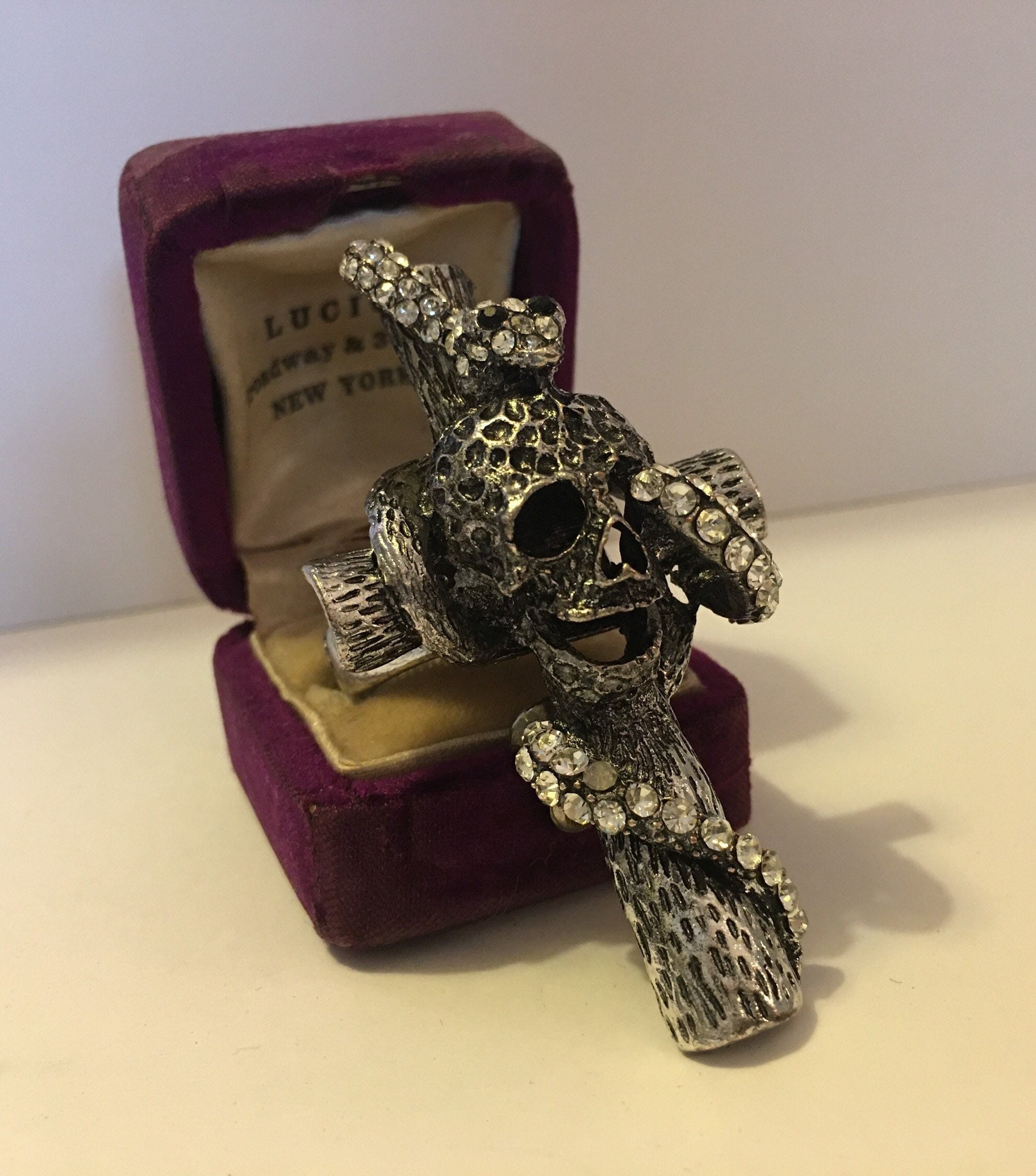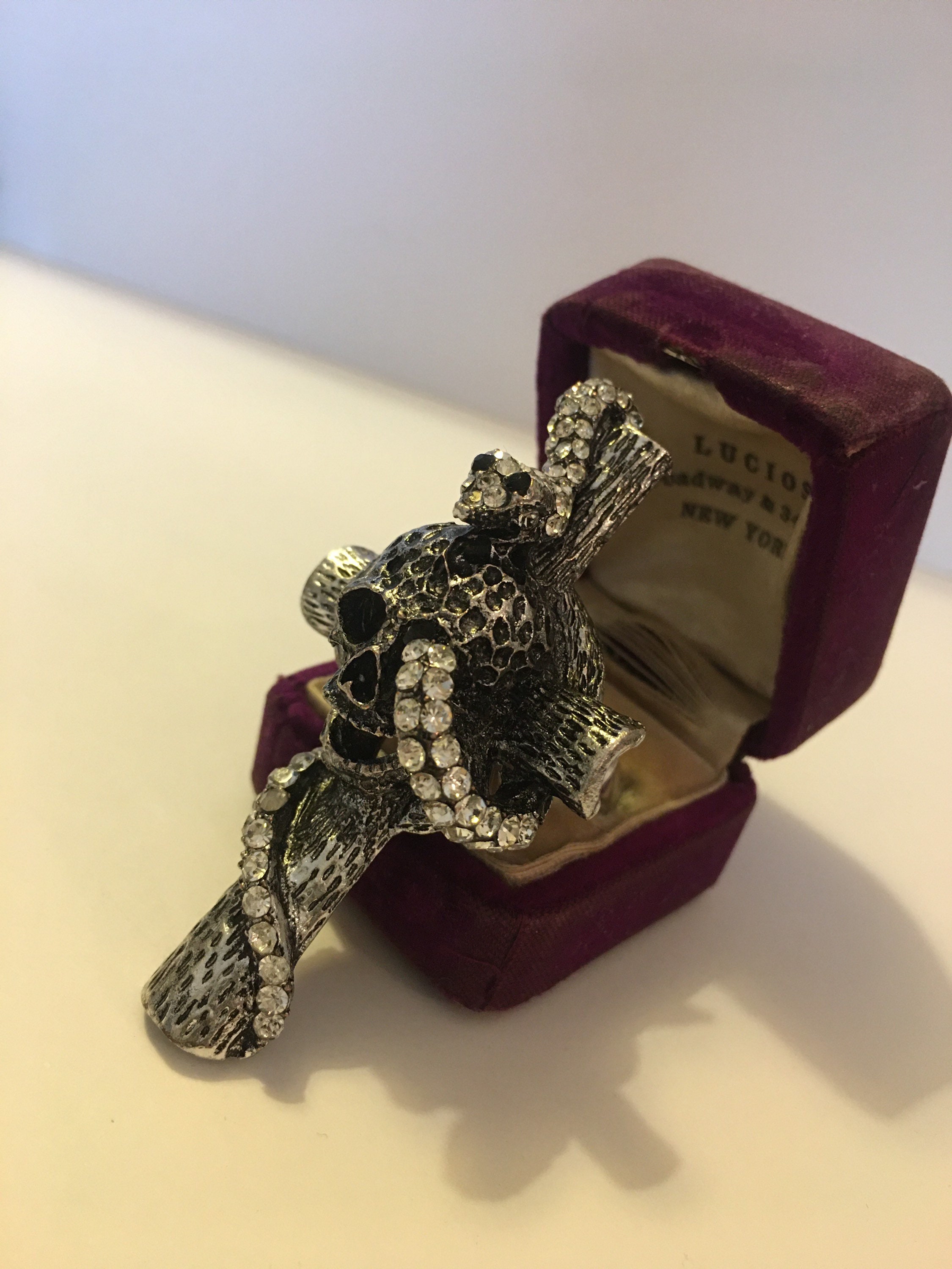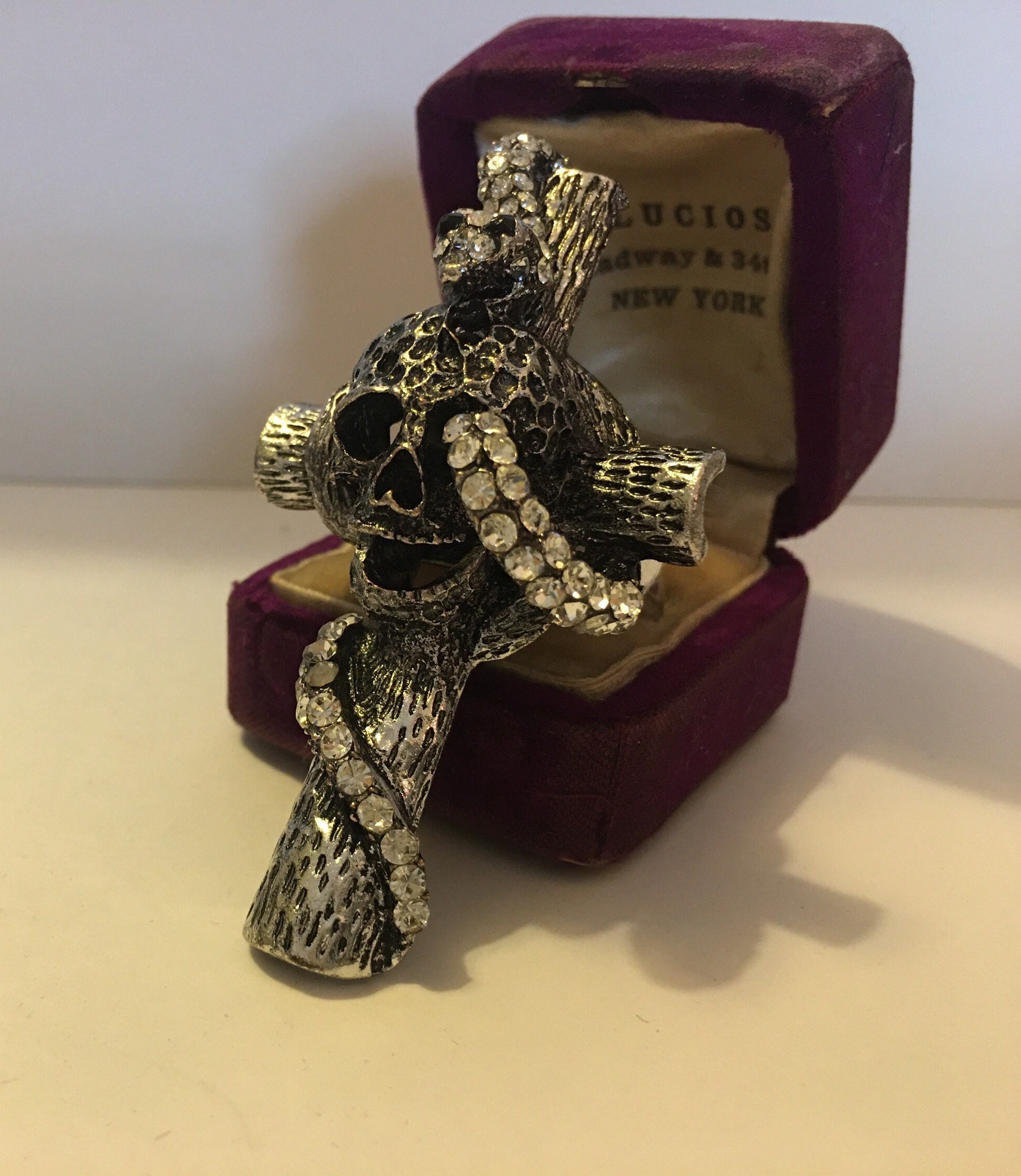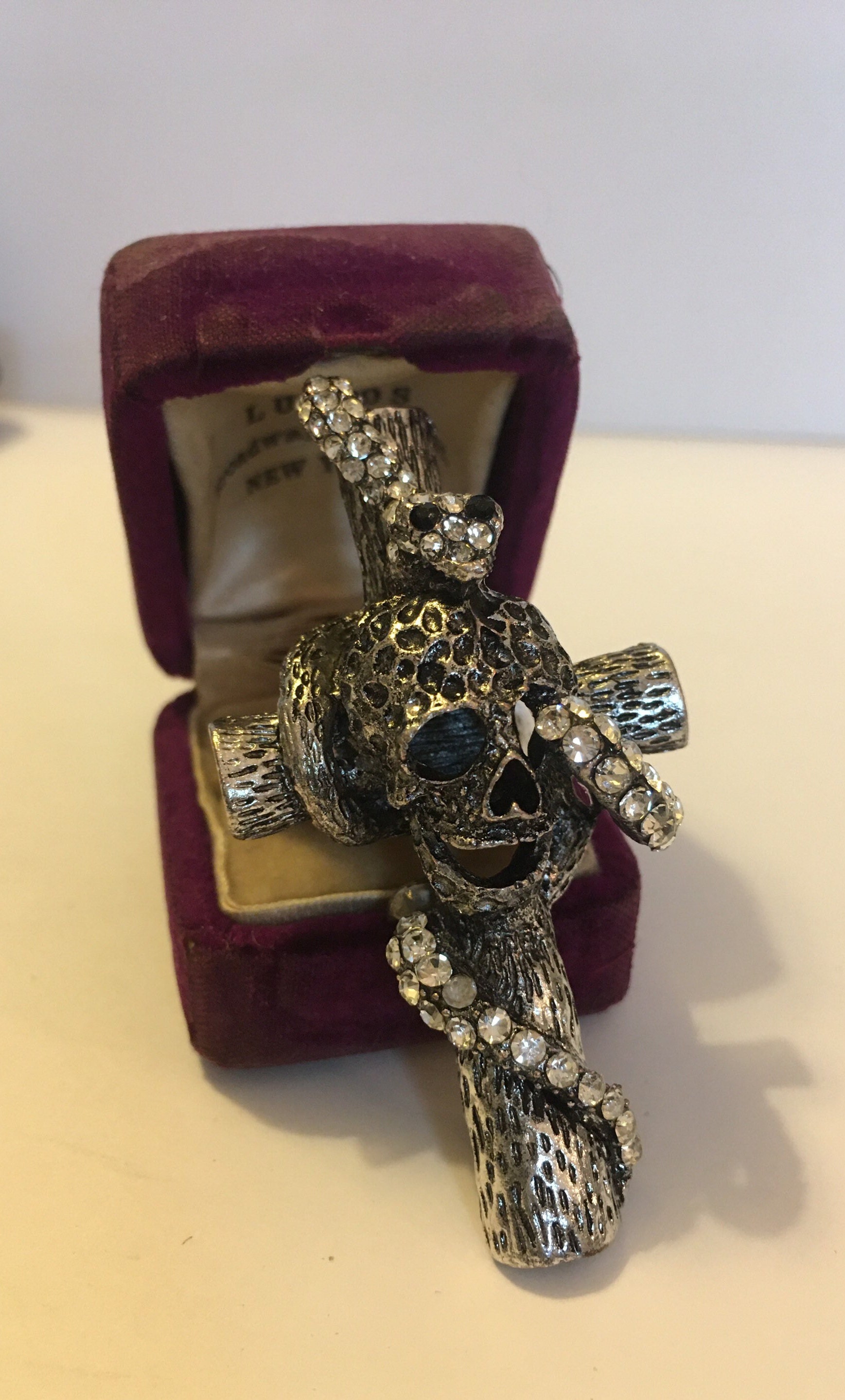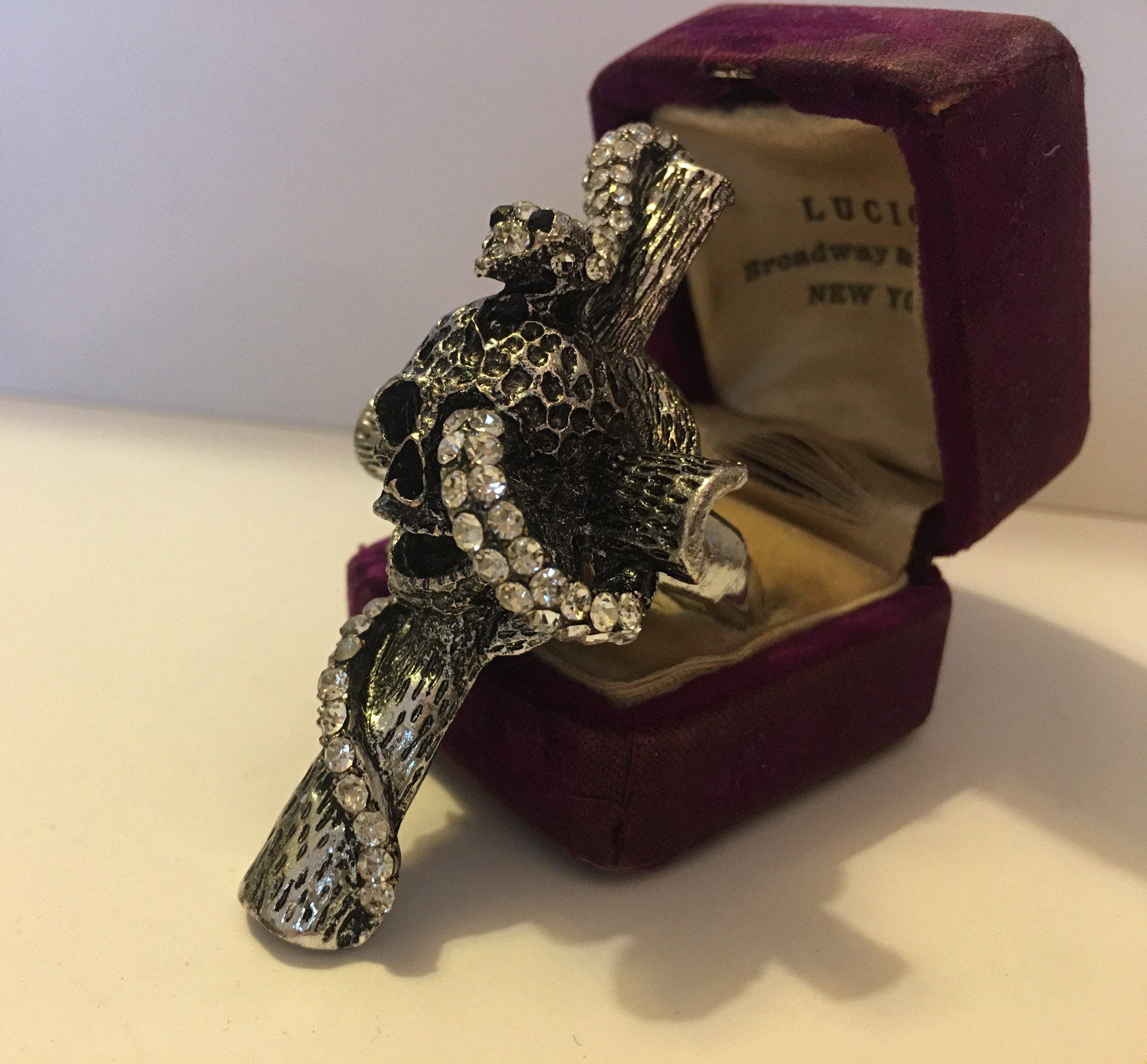 A divine Costume fantastic design Skull ring with fabulous rhinestone detail and exquisite cross and snake design. Adjustable so it moves and fits any size finger perfectly. Great quality. Looks so cool on. Fantastic statement piece for any skull lover.