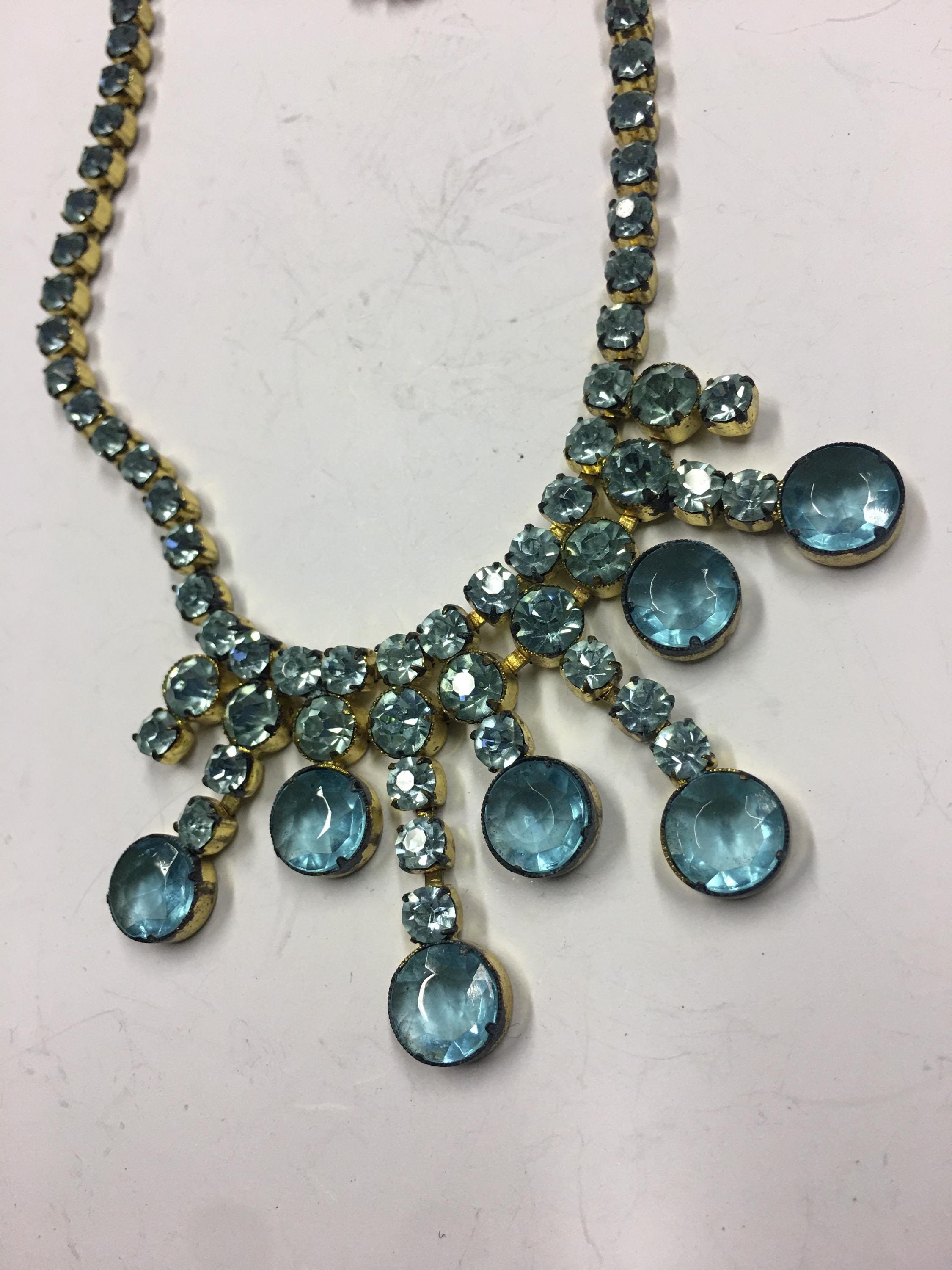 A beautiful Vintage costume necklace set with gorgeous Aquamarine colour rhinestones design. The sparkly colour is divine. Wonderful very rare statement piece. The perfect set to add some sparkle to any outfit. I love this set.