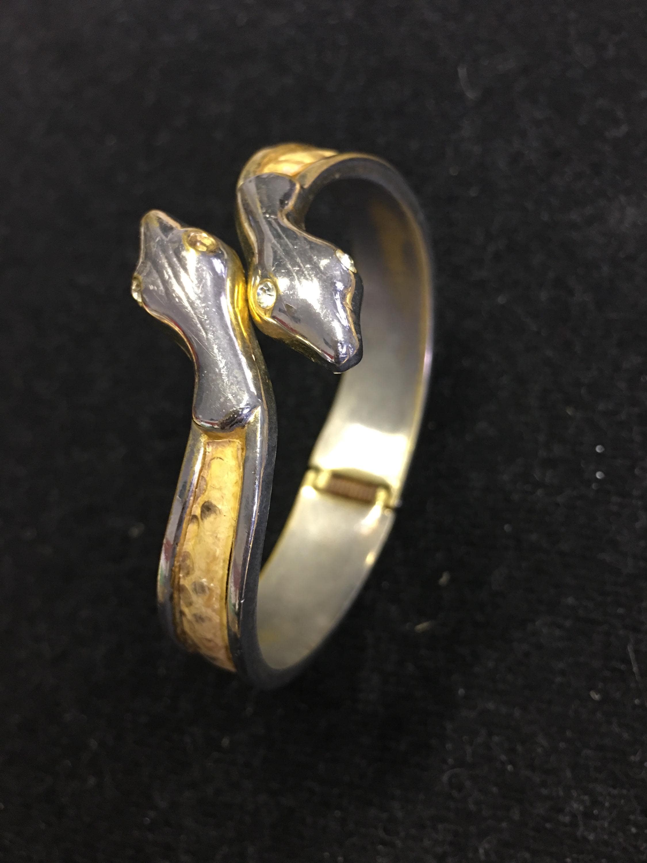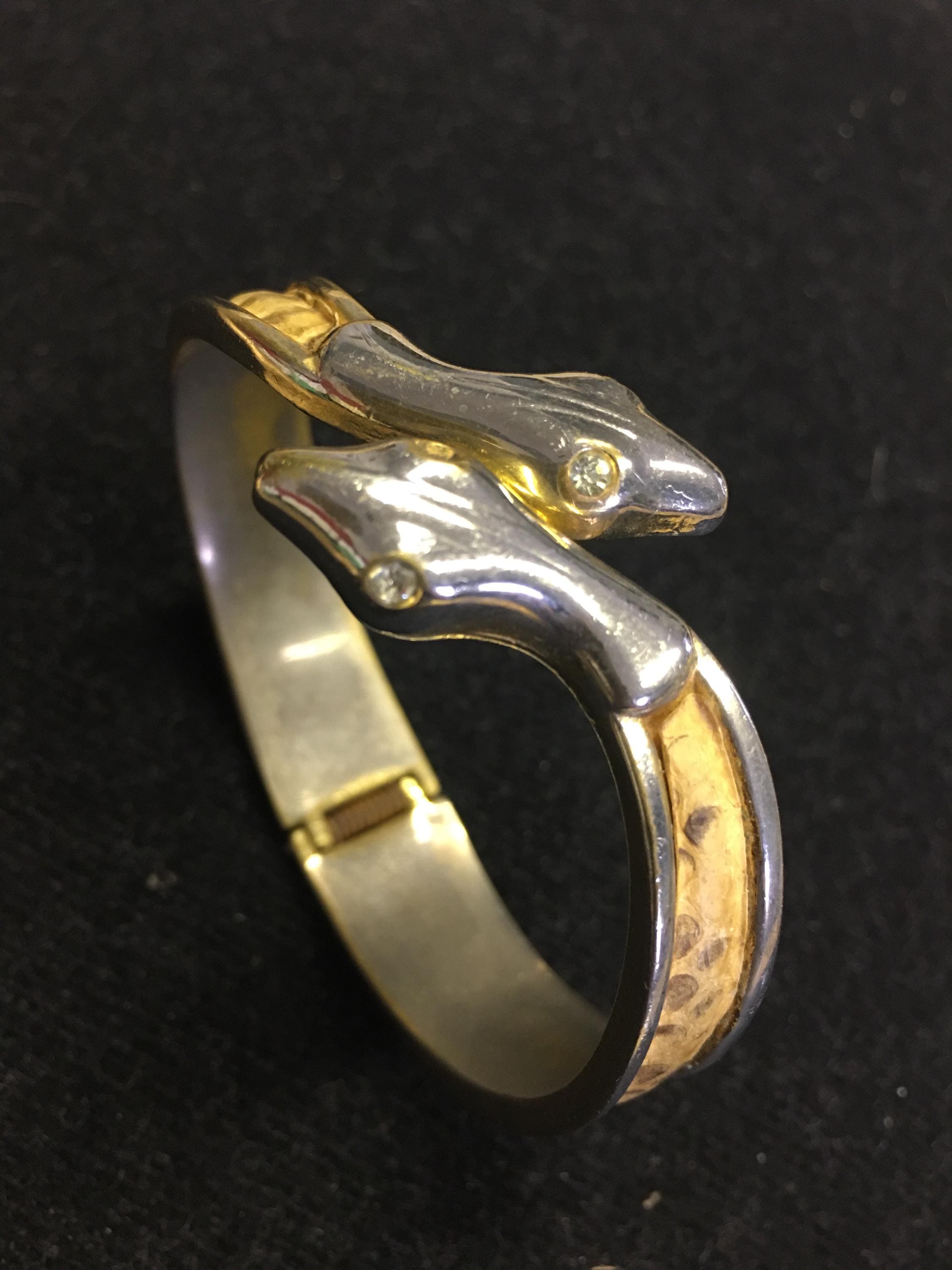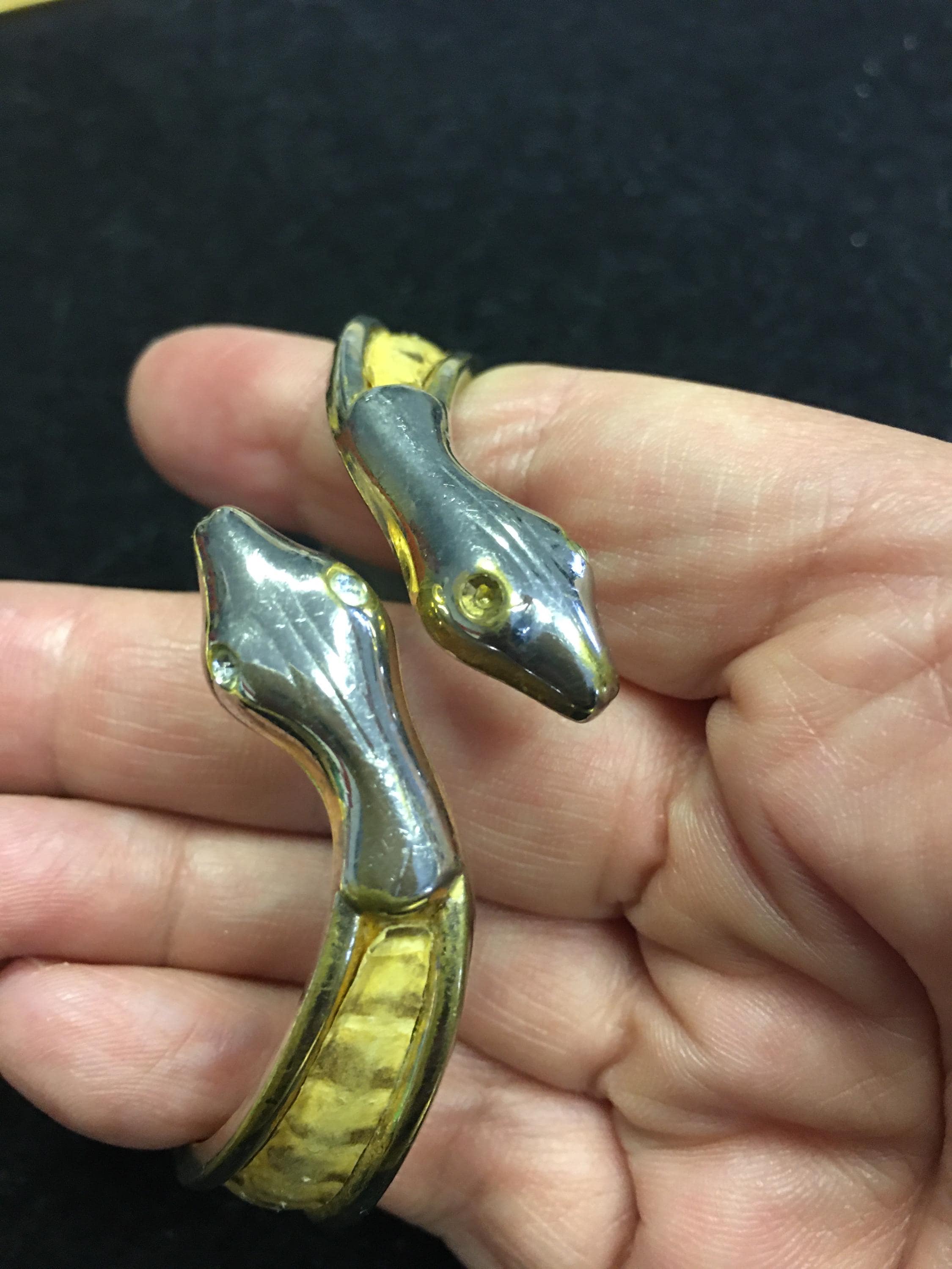 Vintage Snake cuff bracelet with beautiful Rhinestone detail and design. Striking piece. One rhinestone eye missing doesn't detract very hard to see. Looks fantastic on.