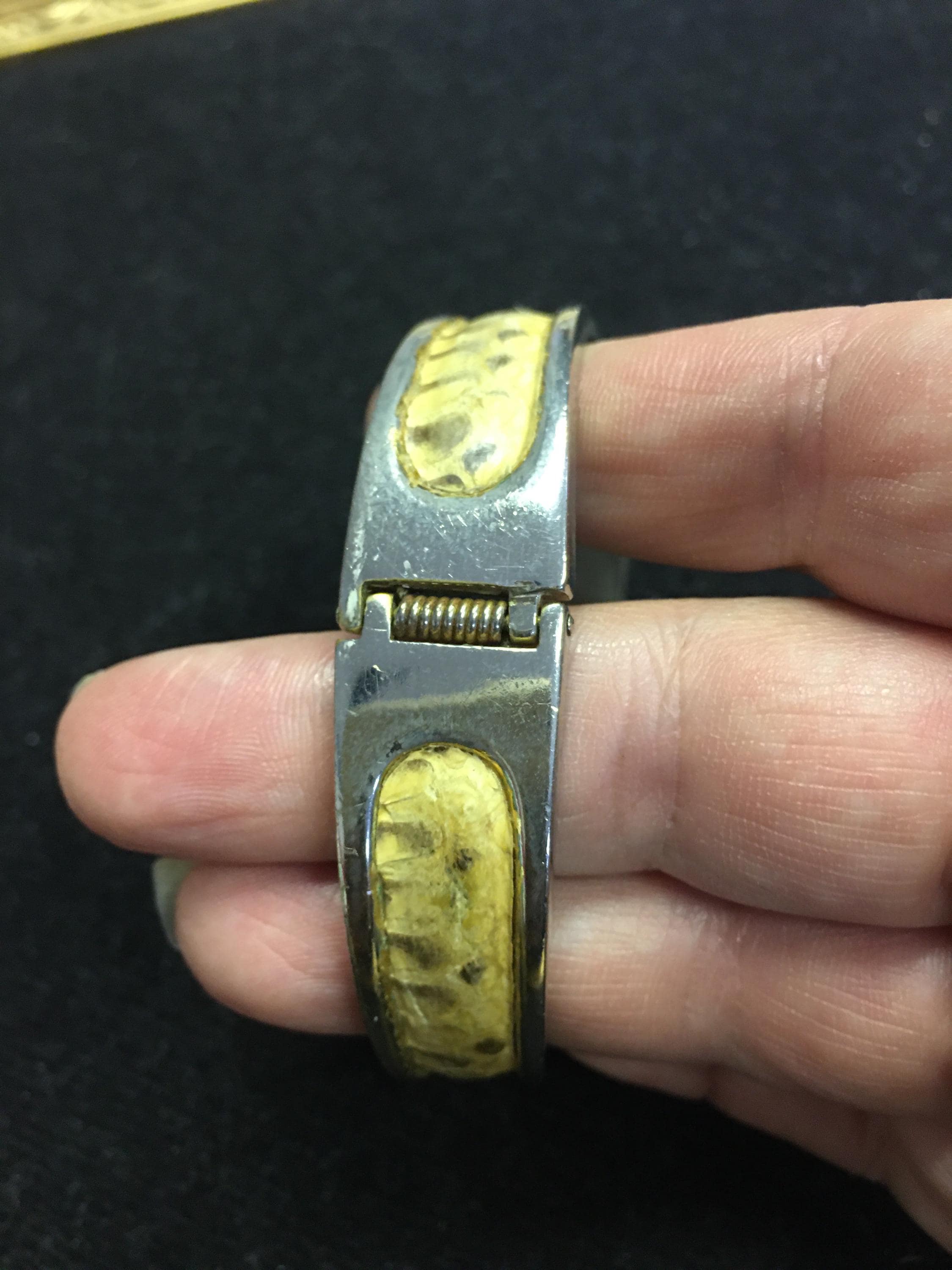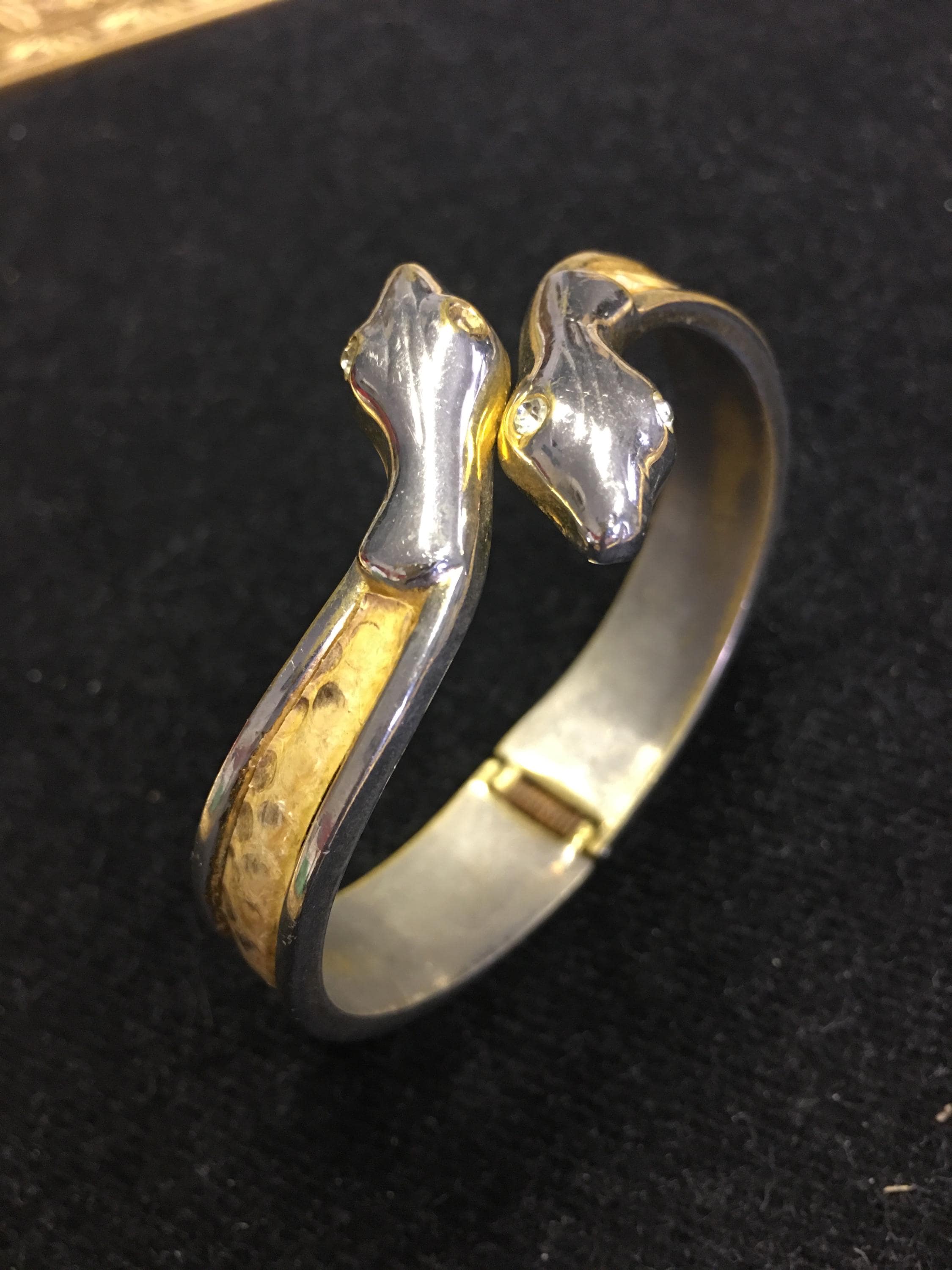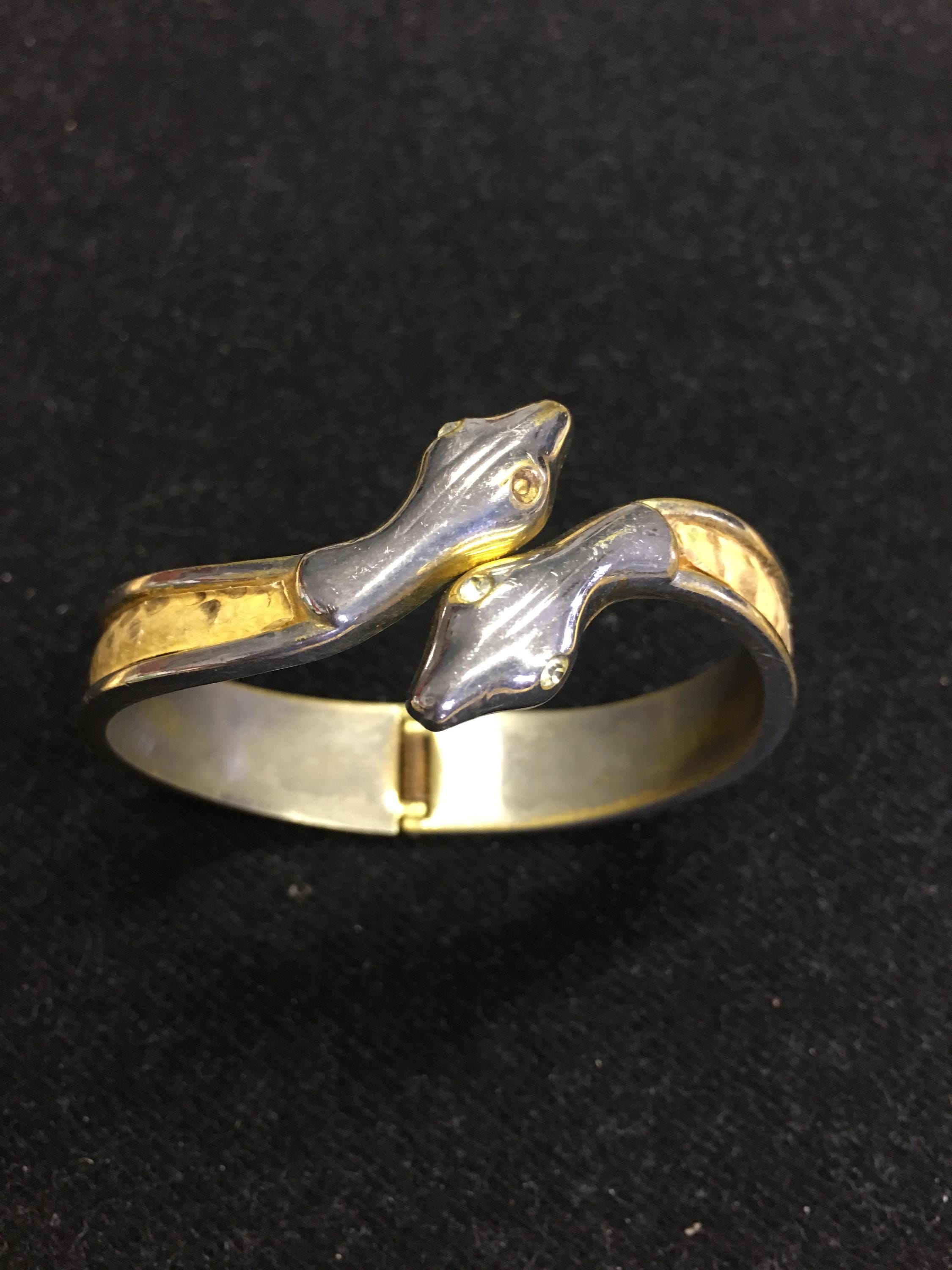 Vintage Snake cuff bracelet with beautiful Rhinestone detail and design. Striking piece. One rhinestone eye missing doesn't detract very hard to see. Looks fantastic on.