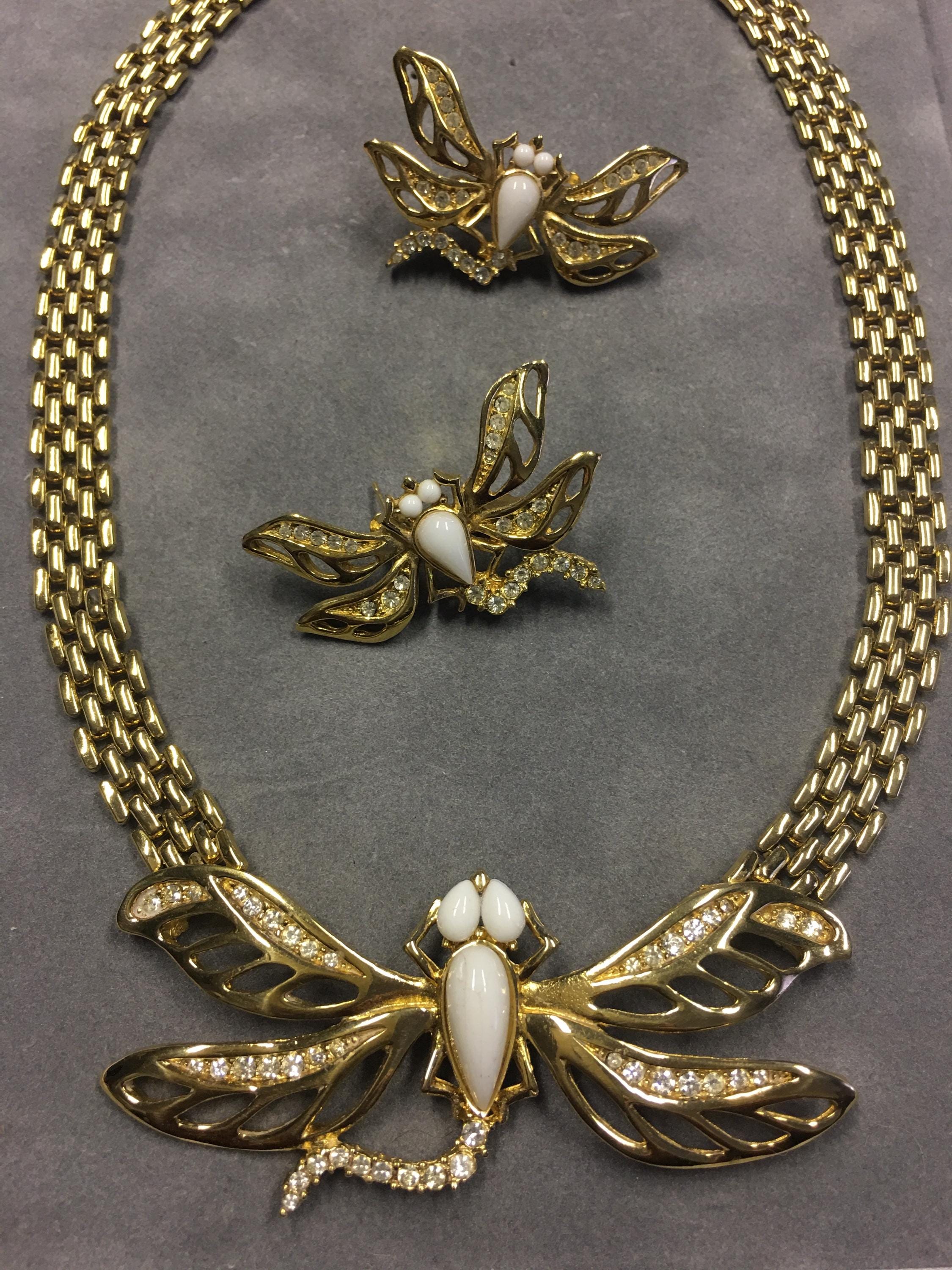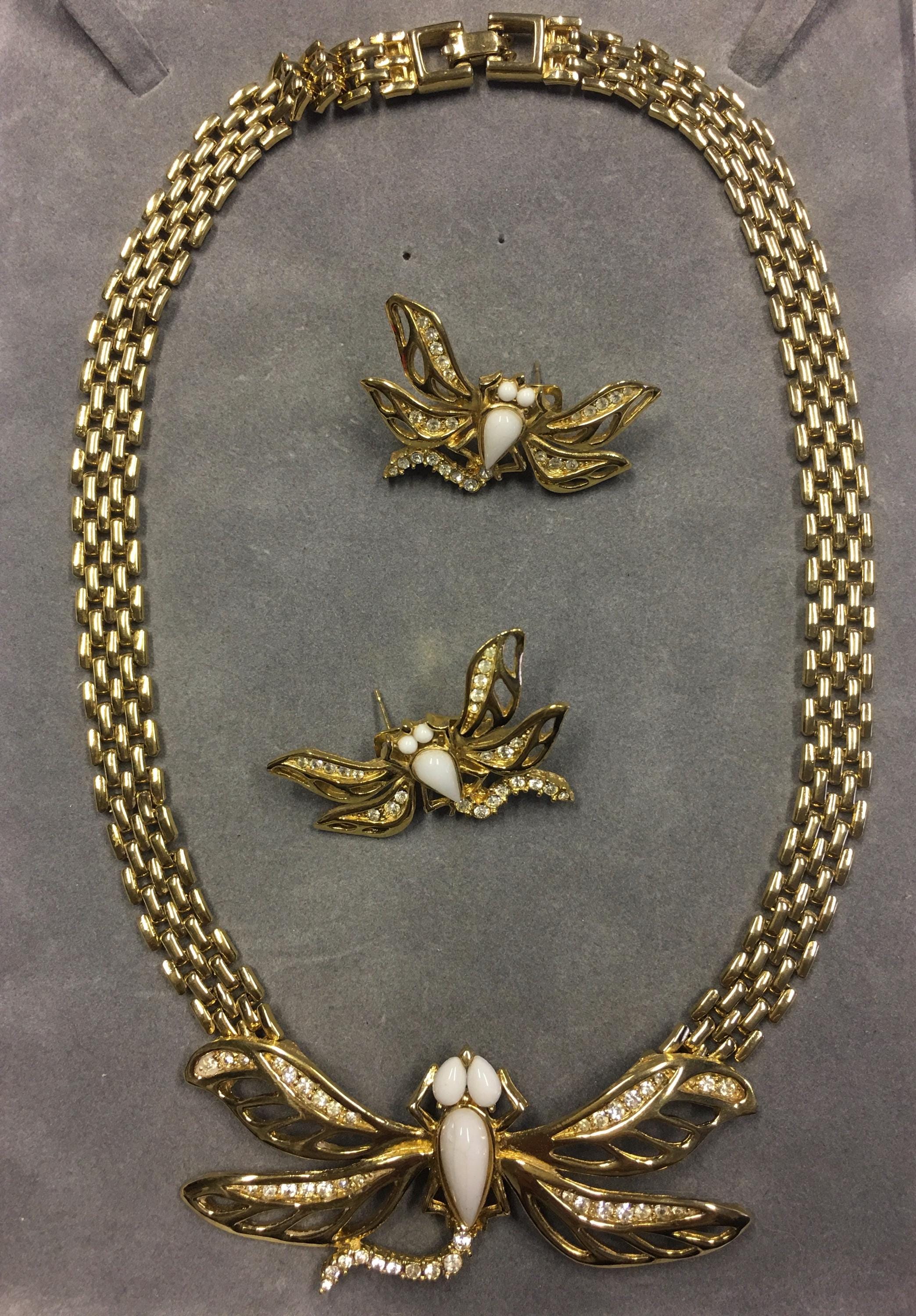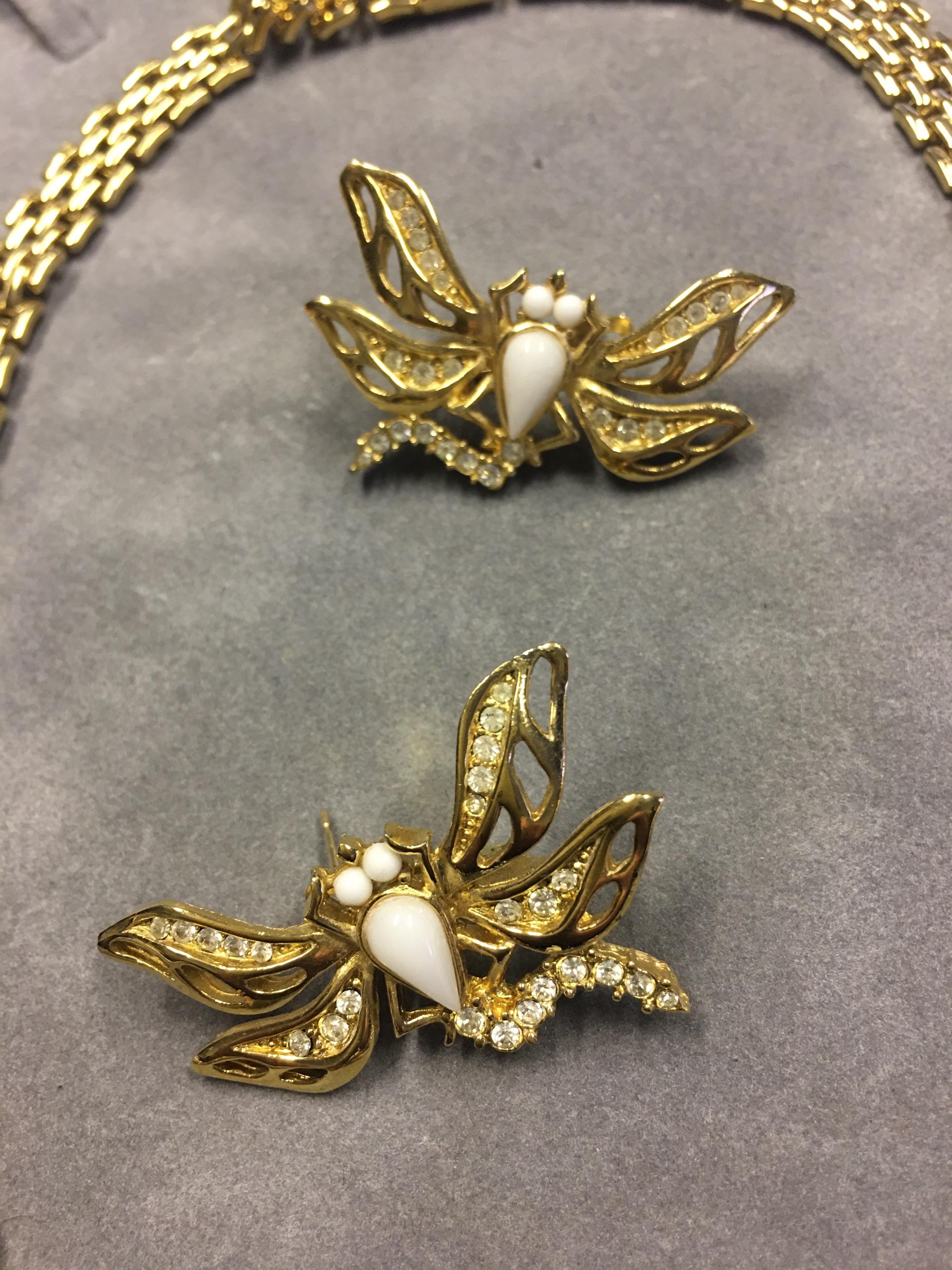 This Vintage Givenchy statement necklace and earring set is a rare and divine piece inspired by insects. Crafted in France with breath taking fine yellow gold plated metal, the set features a signature and hallmark from Givenchy, making it a valuable addition to any jewellery collection. The unique animal and insect theme adds a playful touch to the classic elegance of the design, making it a standout statement piece for any vintage lover. Very rare one in a million set.