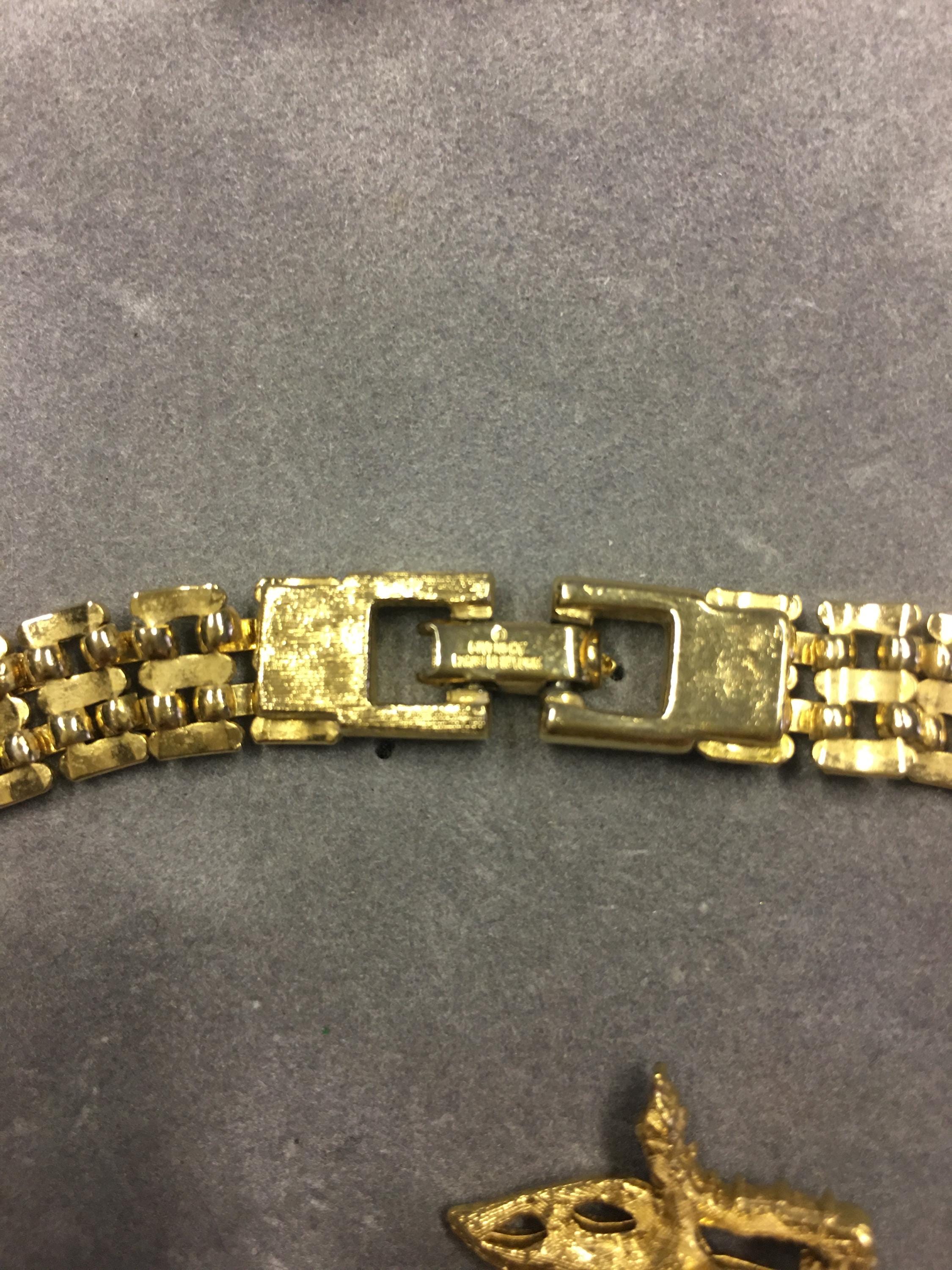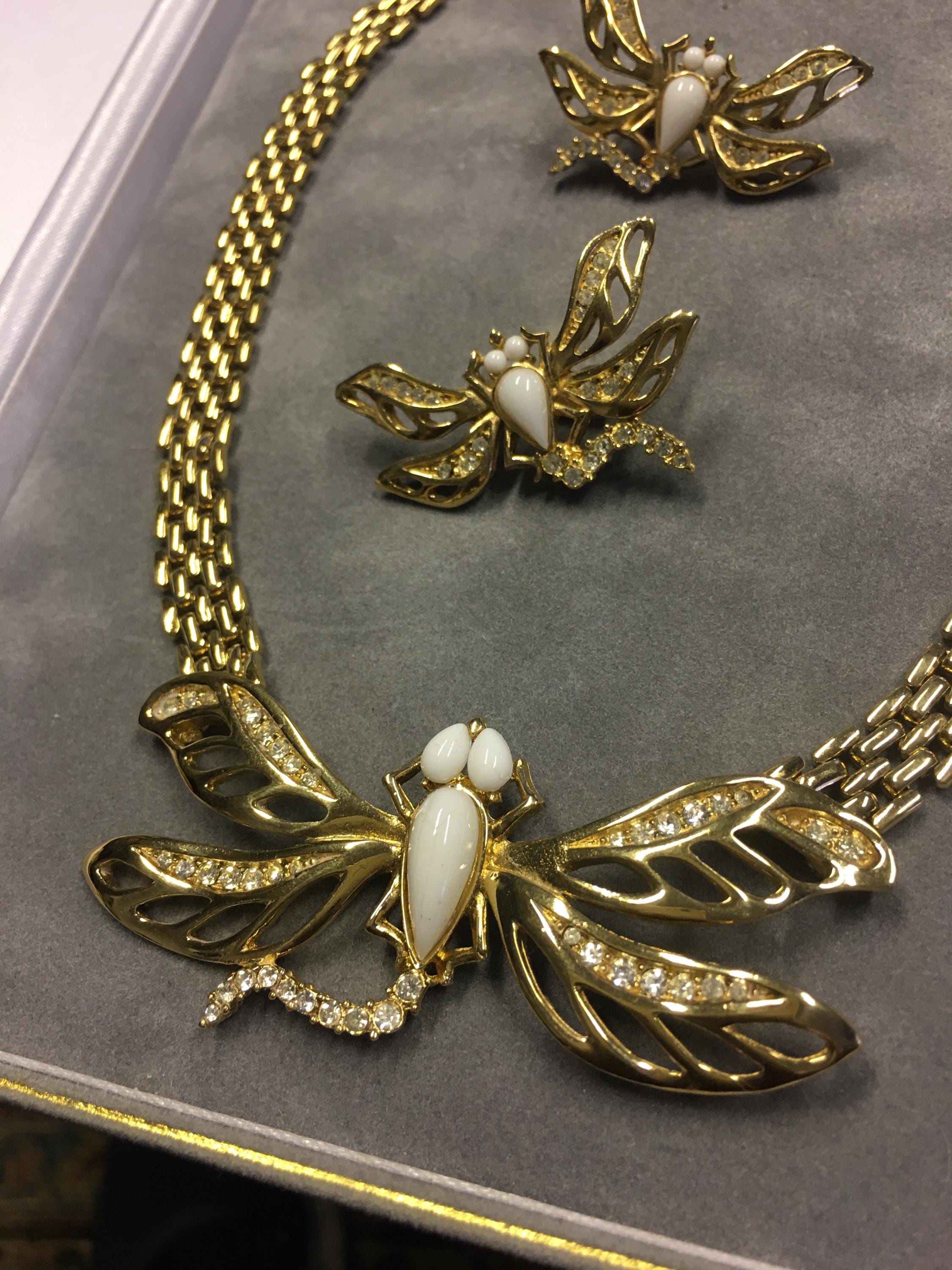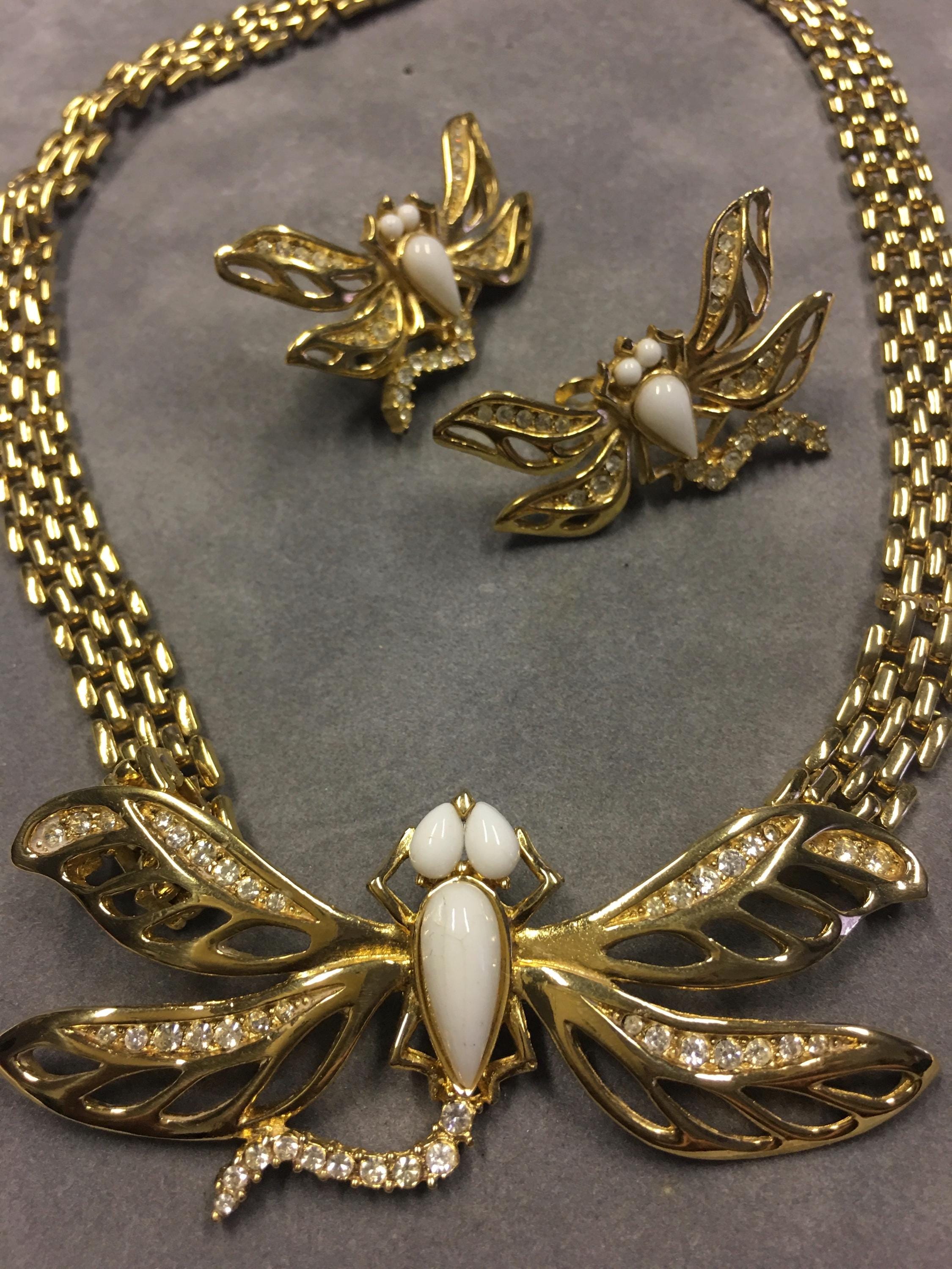 This Vintage Givenchy statement necklace and earring set is a rare and divine piece inspired by insects. Crafted in France with breath taking fine yellow gold plated metal, the set features a signature and hallmark from Givenchy, making it a valuable addition to any jewellery collection. The unique animal and insect theme adds a playful touch to the classic elegance of the design, making it a standout statement piece for any vintage lover. Very rare one in a million set.