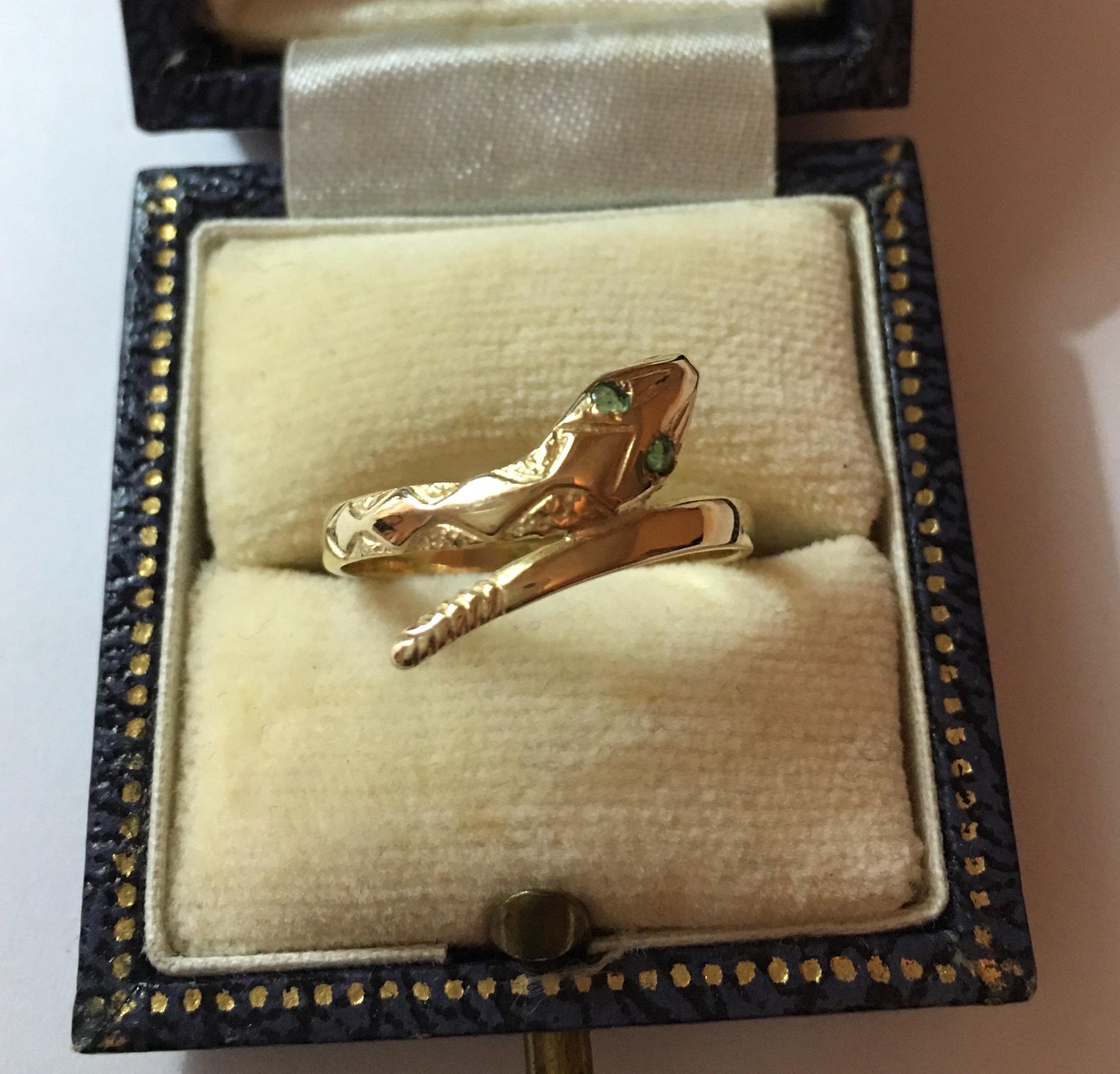 An exquisite Vintage 9 Carat Gold Snake Ring Set with divine Emerald Eyes. The snake has wonderful movement and design. A breath taking example of an extremely rare snake piece. These good quality rings are getting very hard to source. Looks wonderful on.