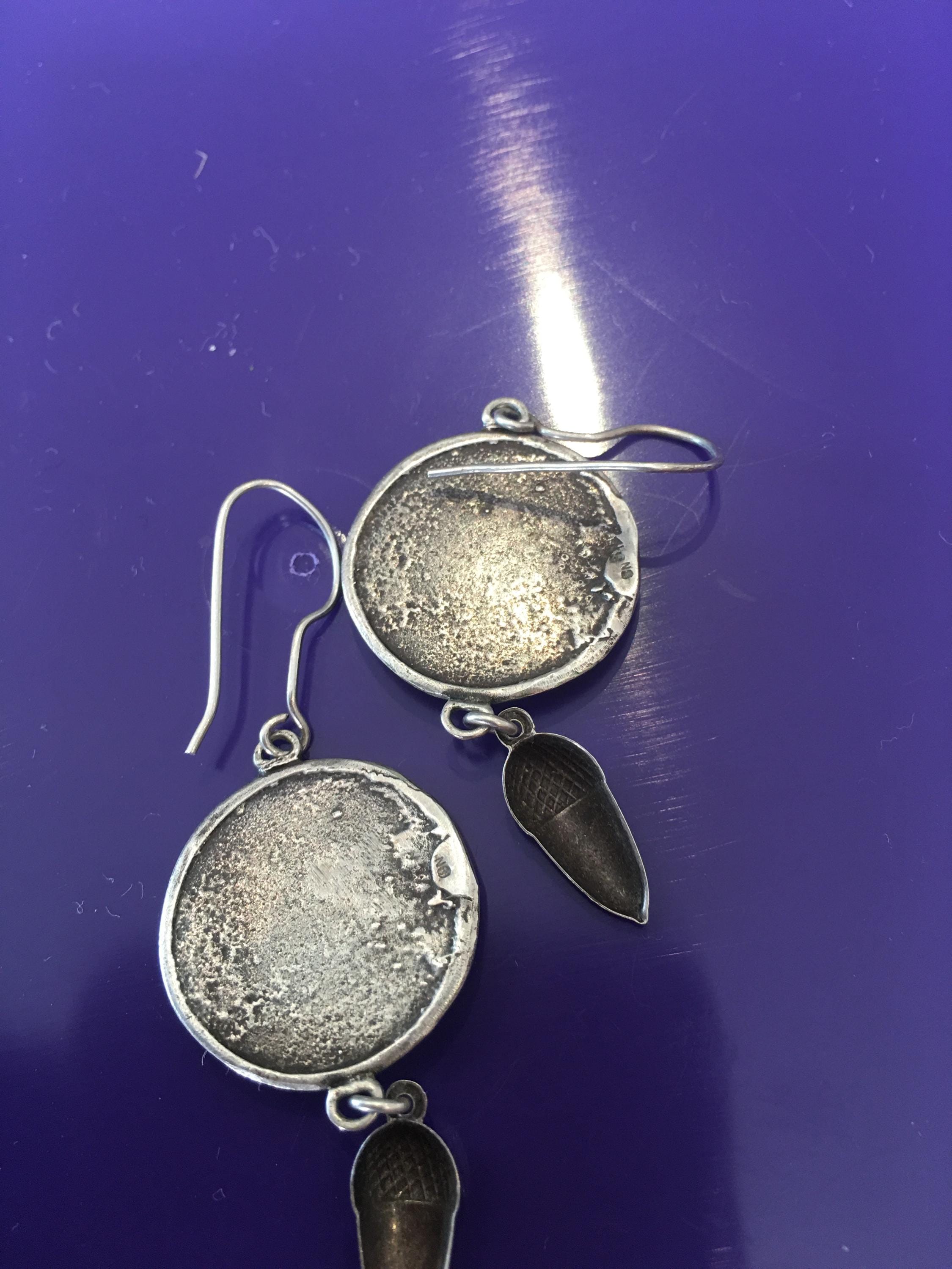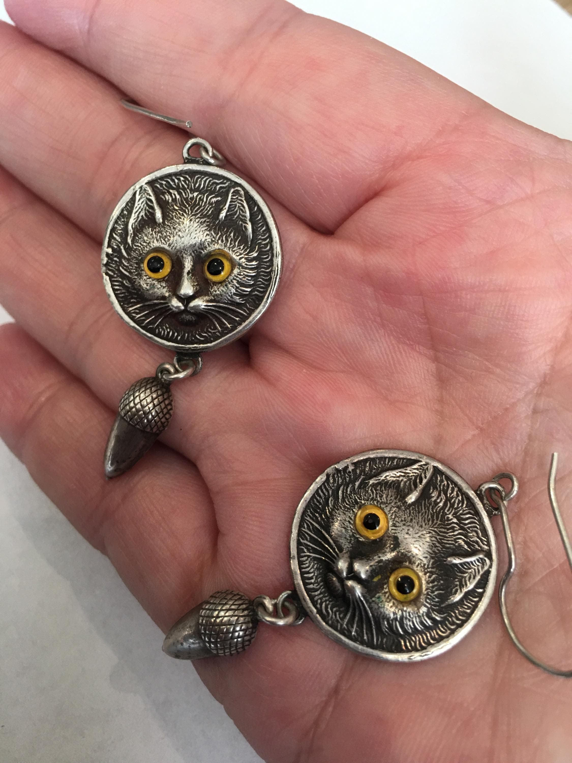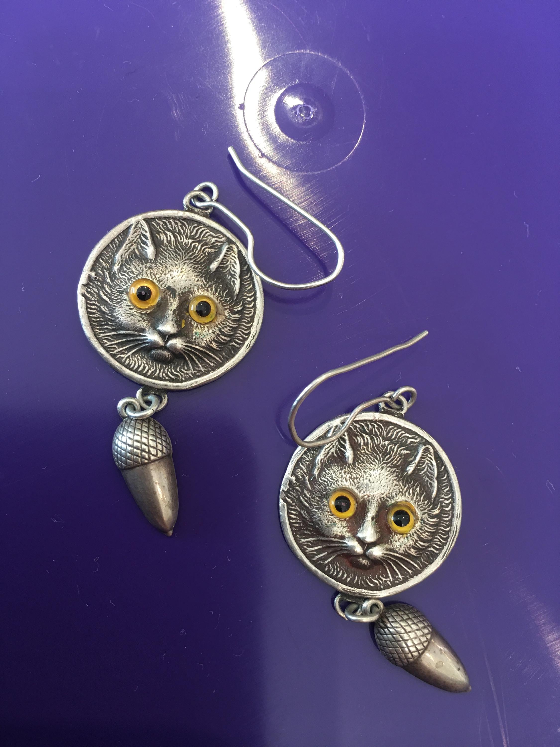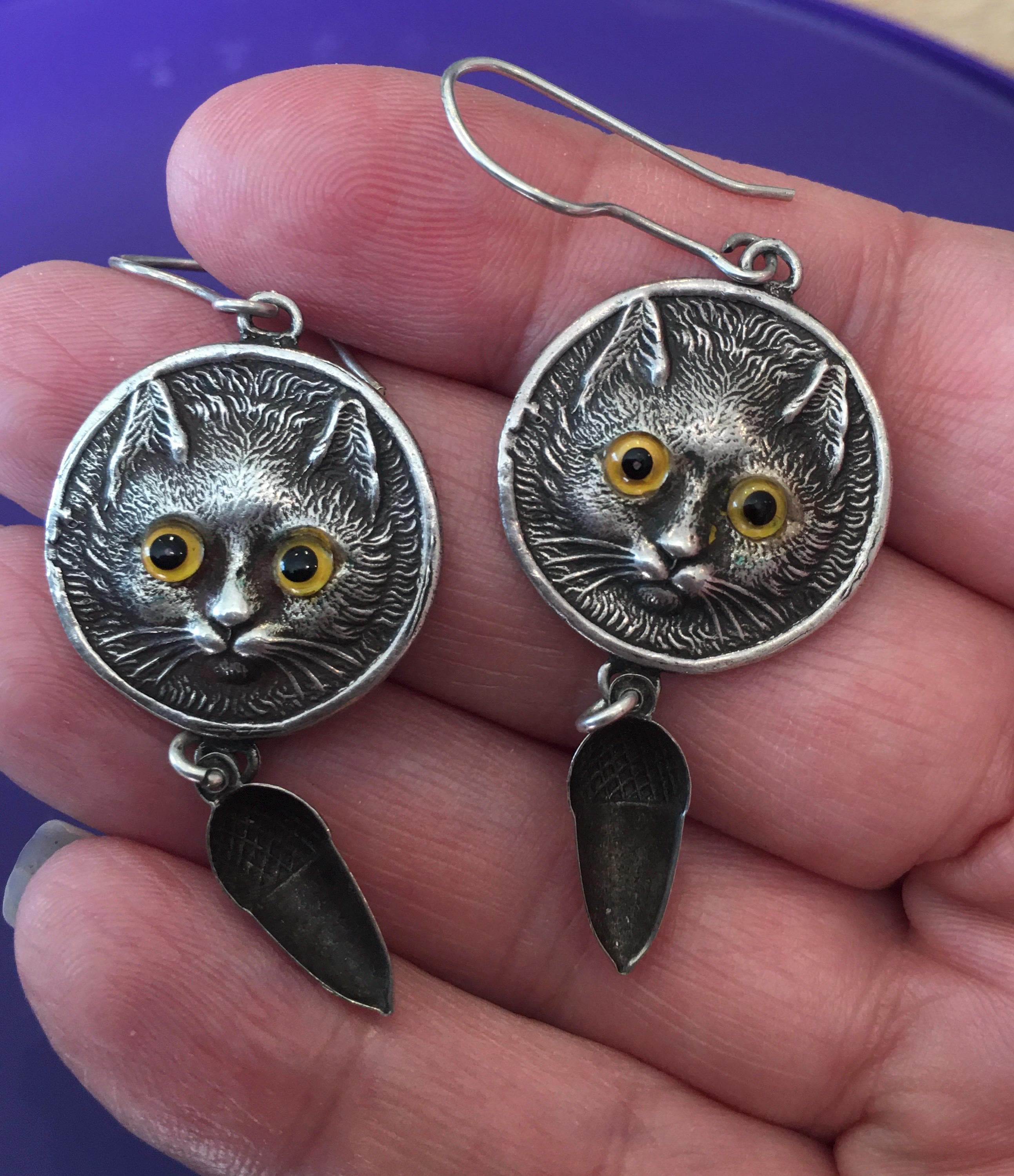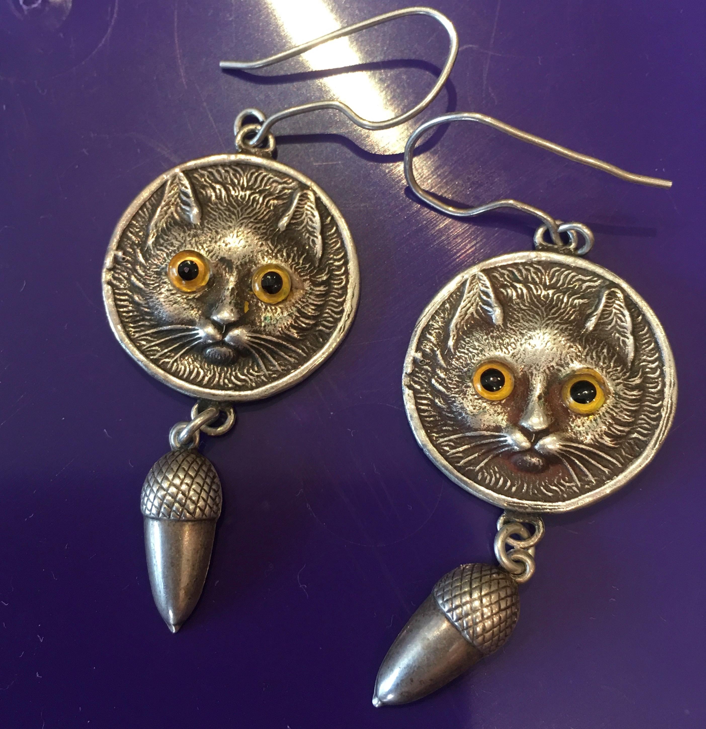 A very interesting pair of Vintage sterling Silver delightful cat and acorn design Earrings with great design. Beautifully detailed silver work with divine craftsman ship. Perfect for any cat lover.