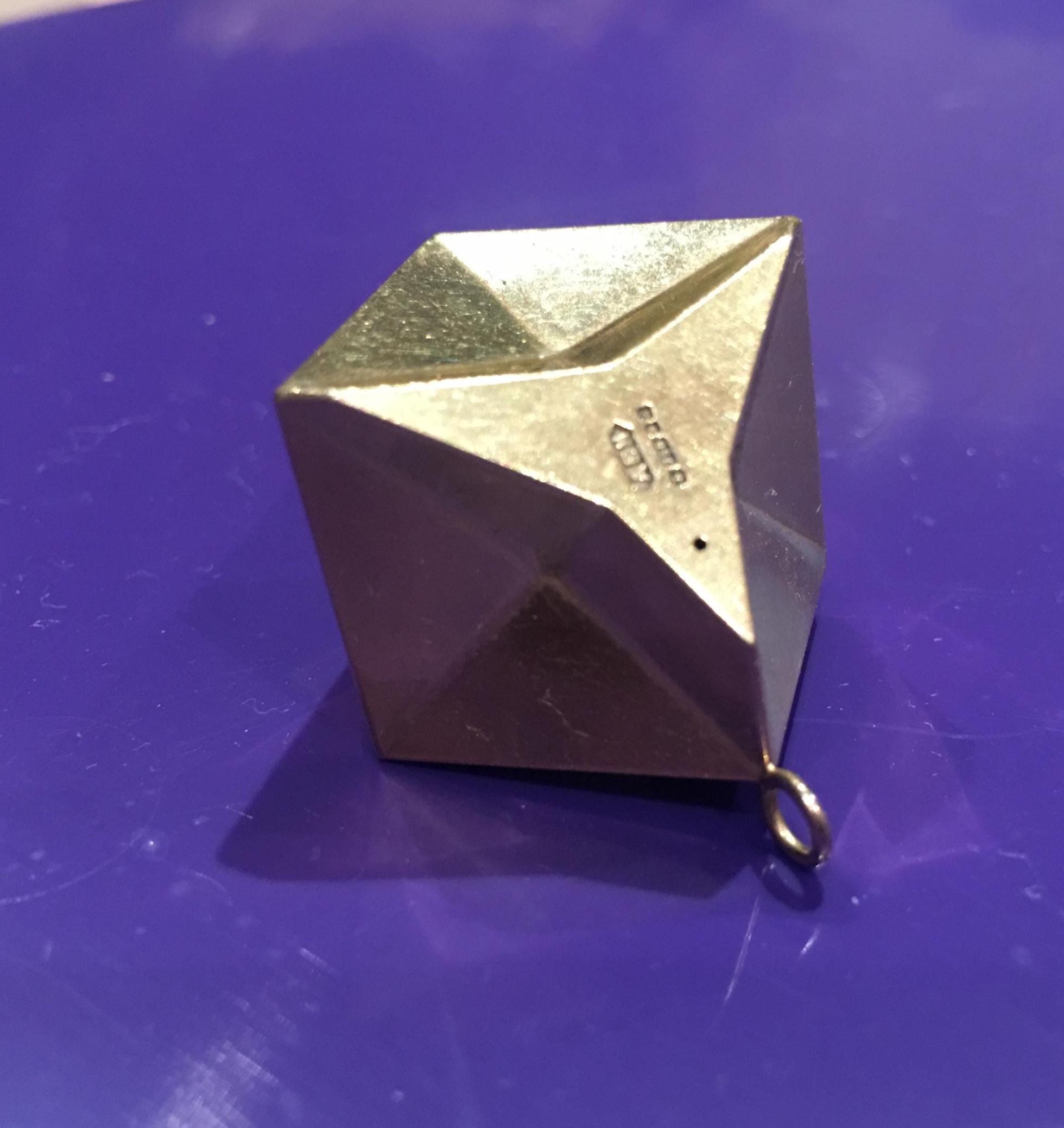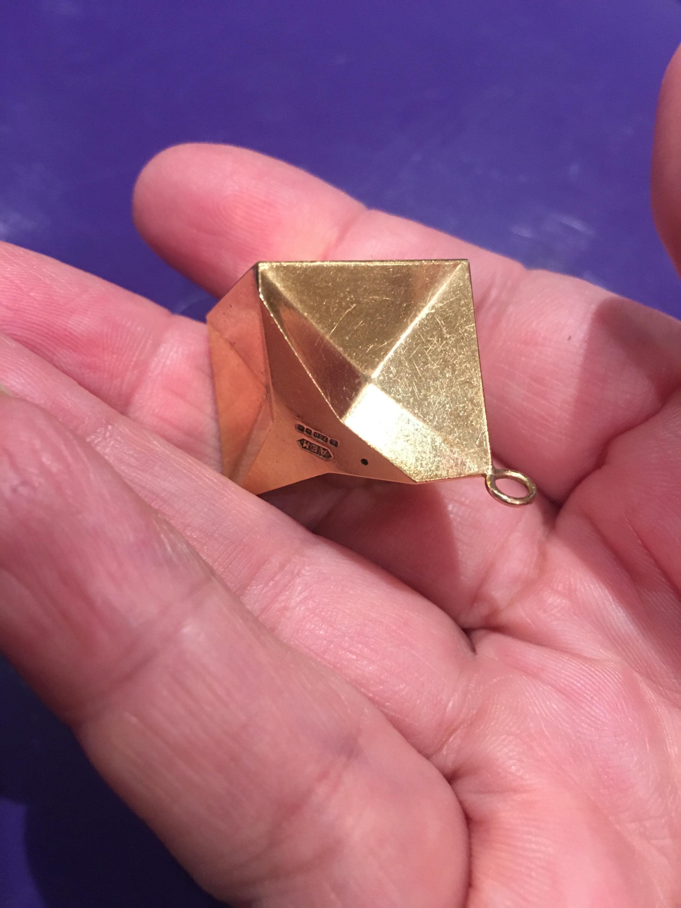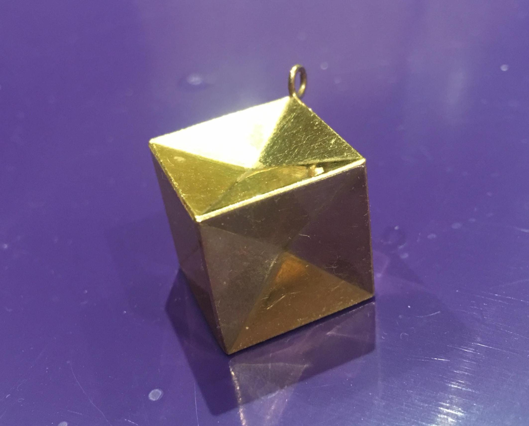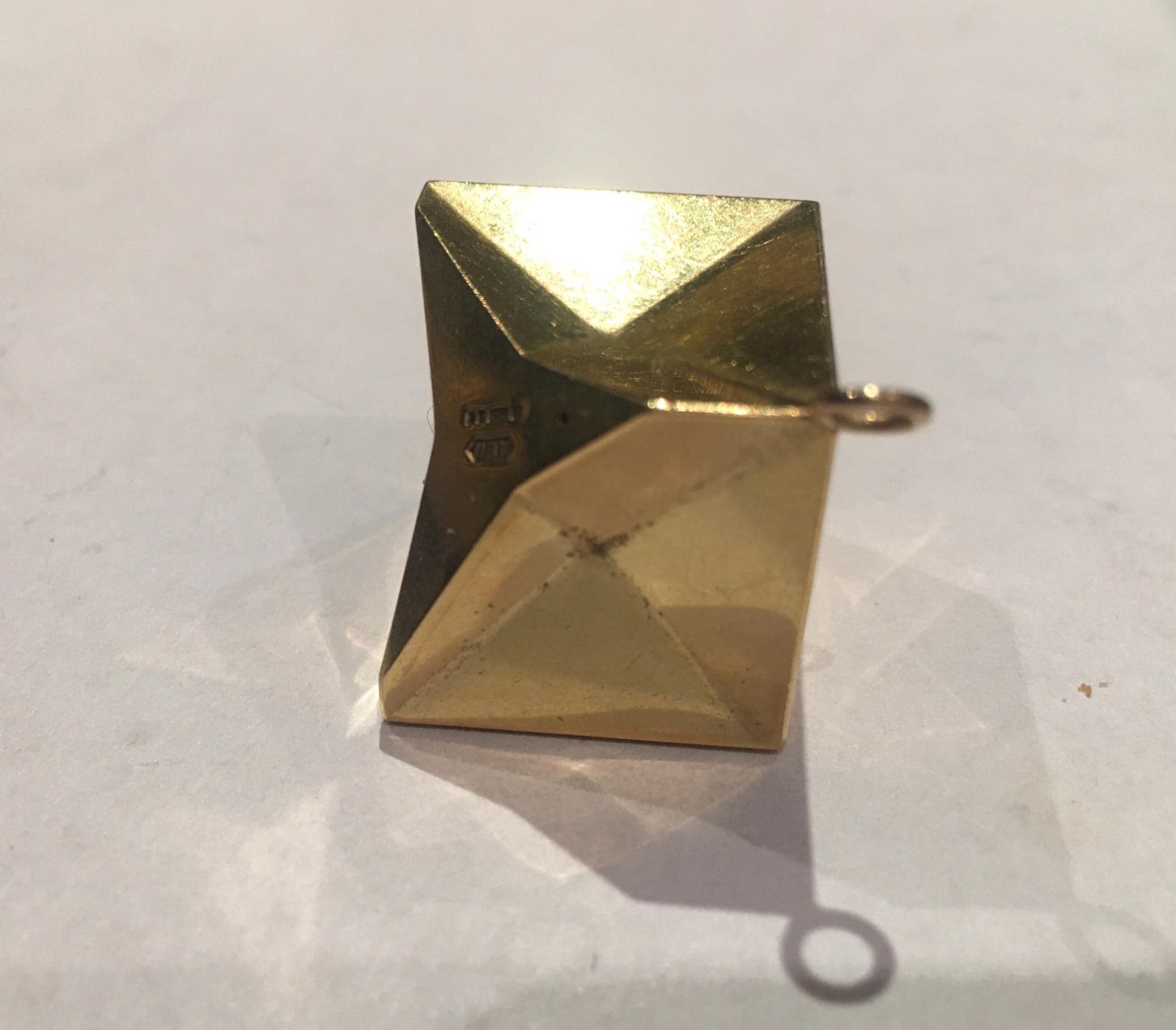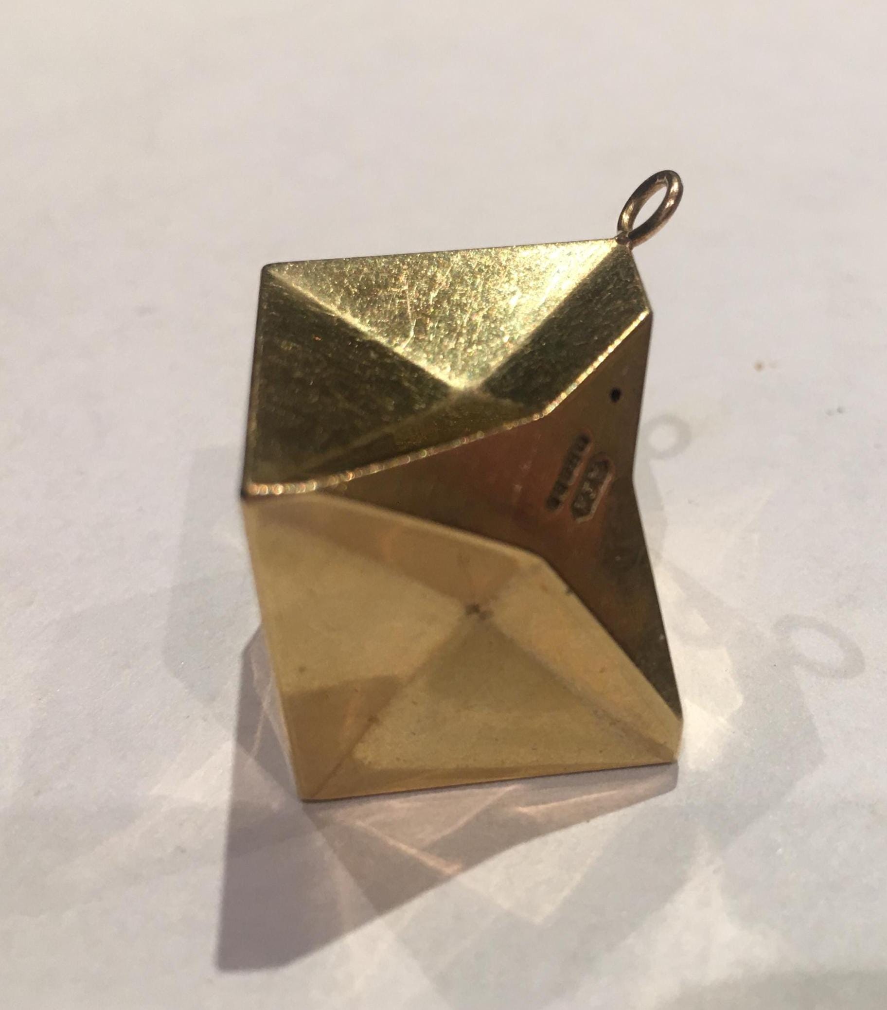 A Marvellous rare 18 Ct gold cube pendant from 1985 features geometric concave sides, making it a unique statement piece. Fully hallmarked dated London 1985. Signed by Audrey E Harris. This craftsman ship is divine and exudes a bohemian style with a touch of artistry and awareness, making it a standout accessory for any outfit. Lovel love love love!