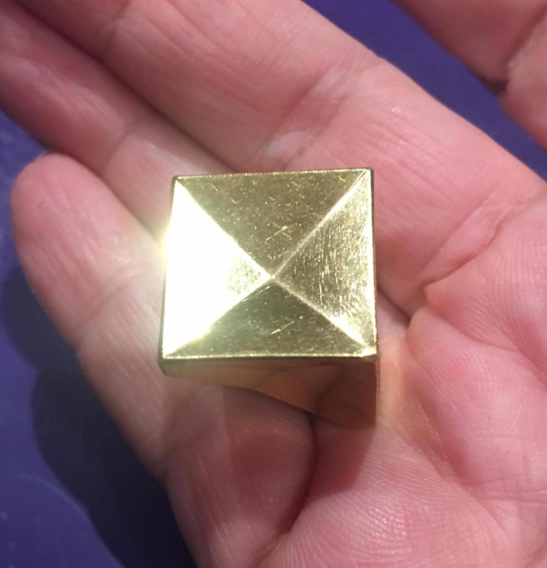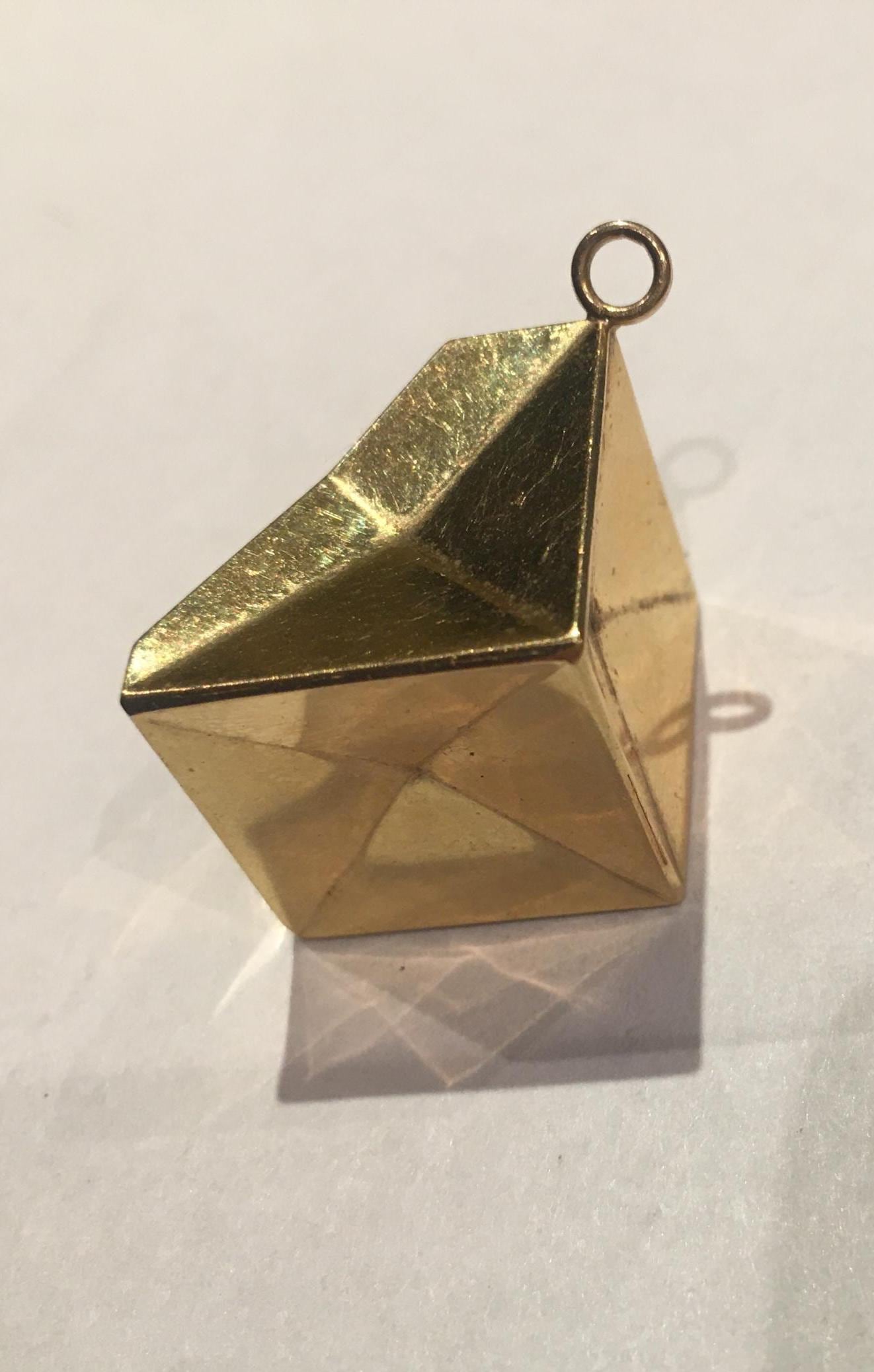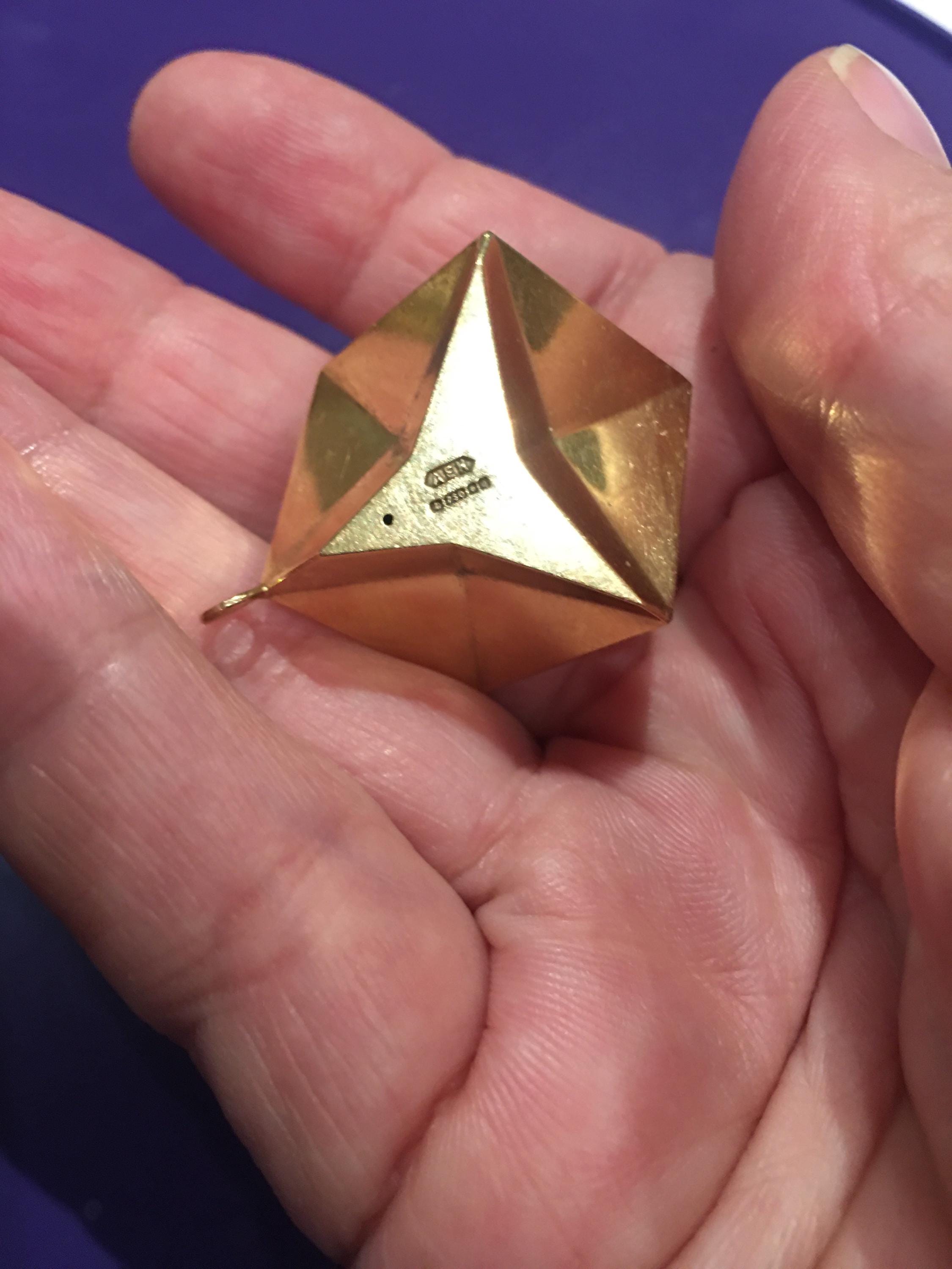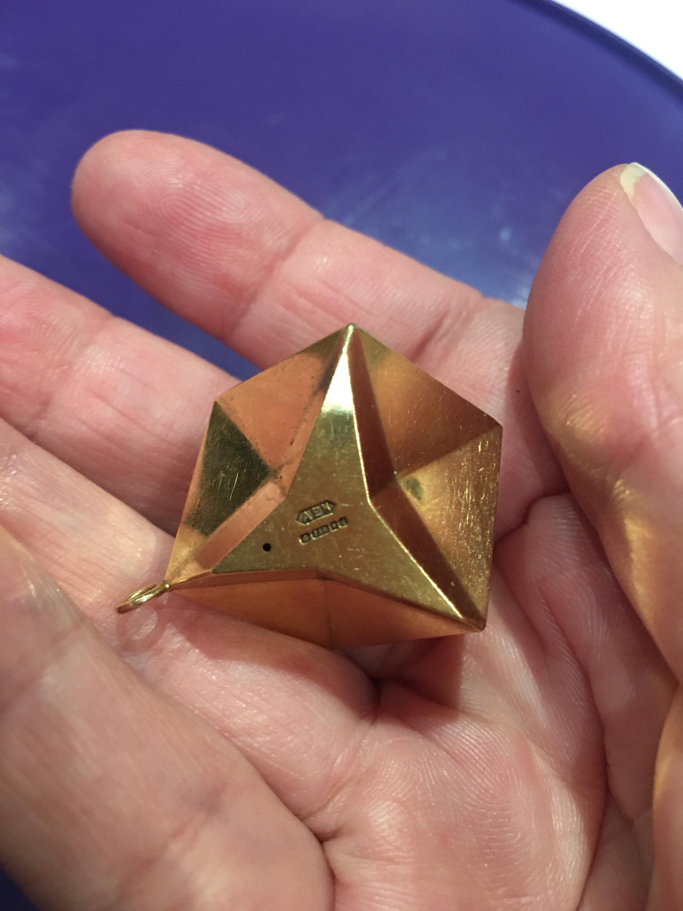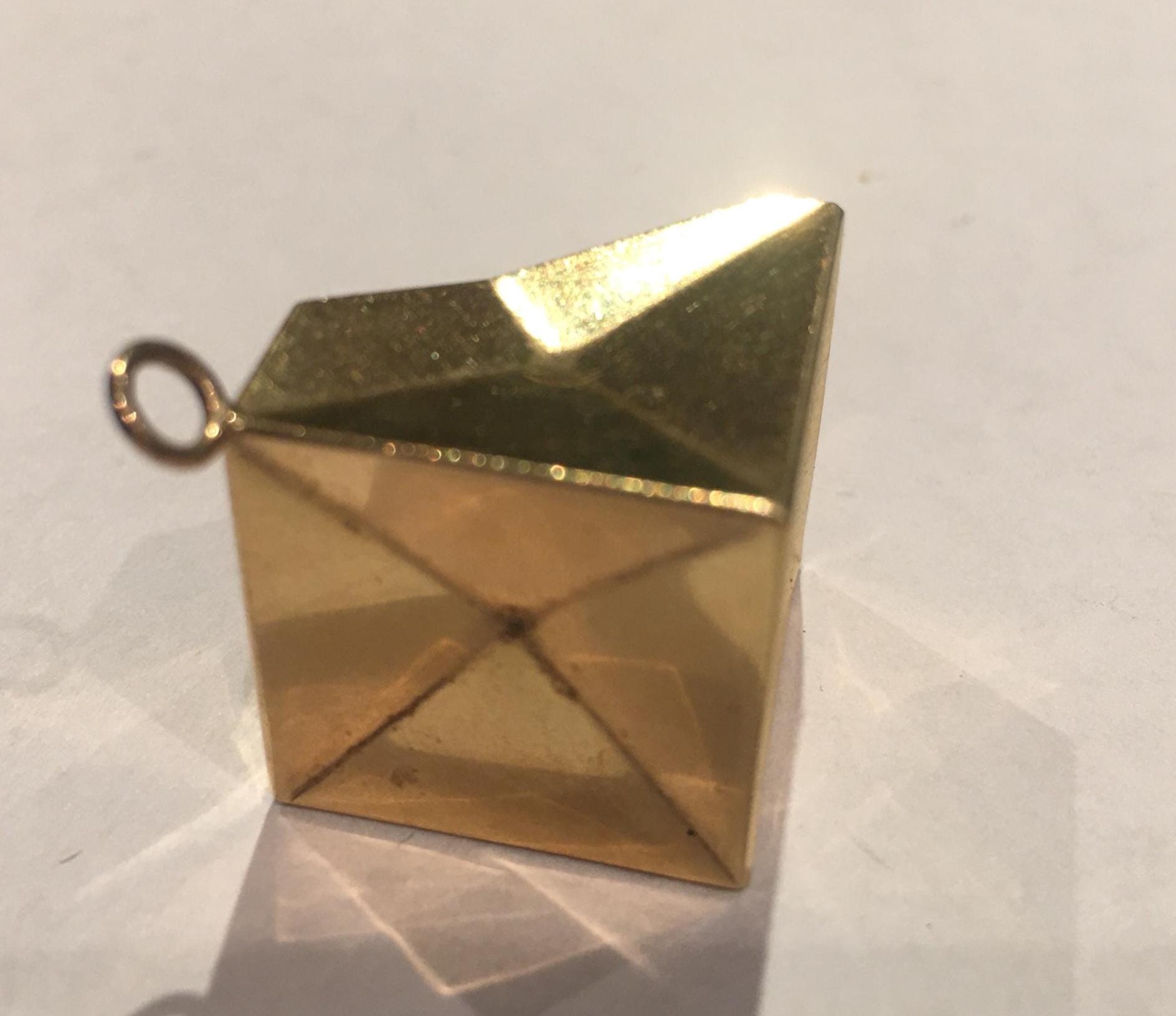 A Marvellous rare 18 Ct gold cube pendant from 1985 features geometric concave sides, making it a unique statement piece. Fully hallmarked dated London 1985. Signed by Audrey E Harris. This craftsman ship is divine and exudes a bohemian style with a touch of artistry and awareness, making it a standout accessory for any outfit. Lovel love love love!