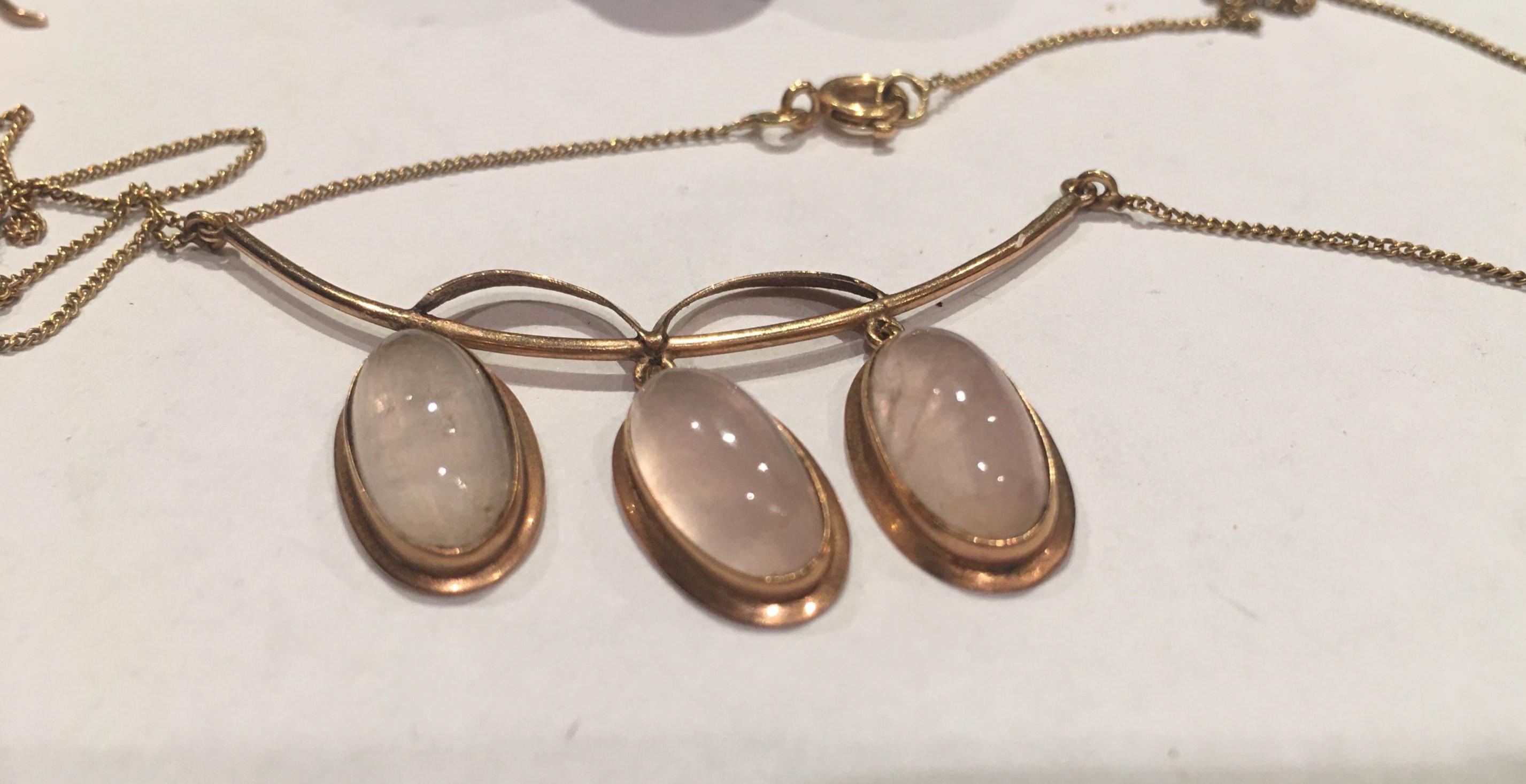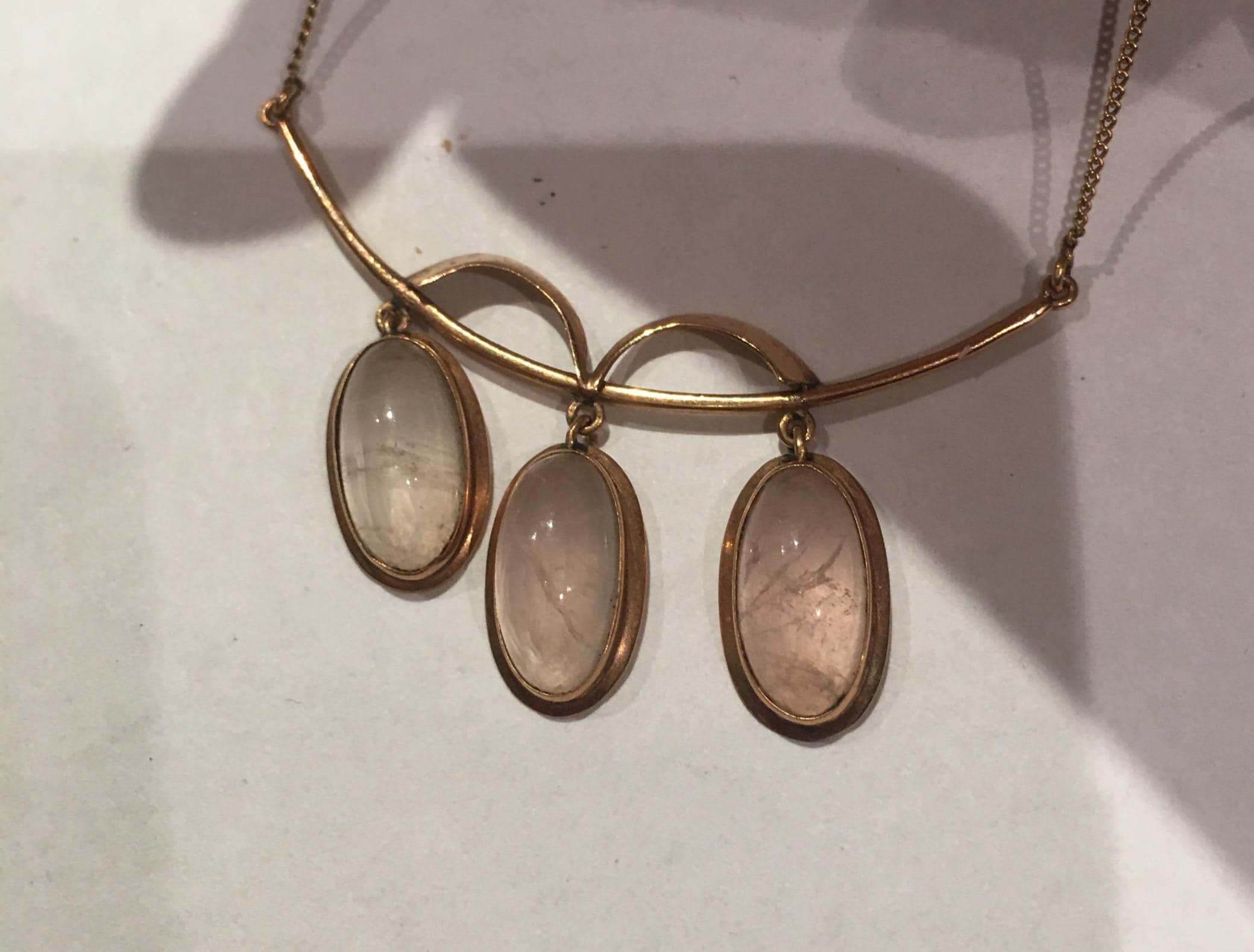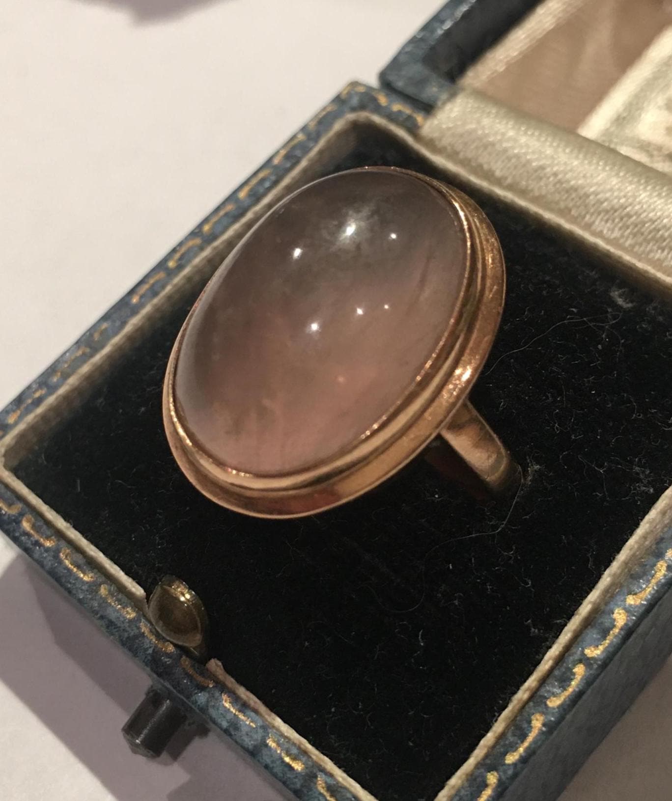 A marvellous rare vintage 14ct gold jewellery set featuring beautiful rose quartz stones. The set includes a necklace, earrings, and a ring, all crafted in yellow gold with an exquisite colour hue from the rose quartz stones. Fully hallmarked date c 1950's. This set is very rare and would make a luxurious addition to any jewellery collection, perfect for special occasions or everyday wear for those who appreciate fine jewellery. Would be wonderful for a bridal set.