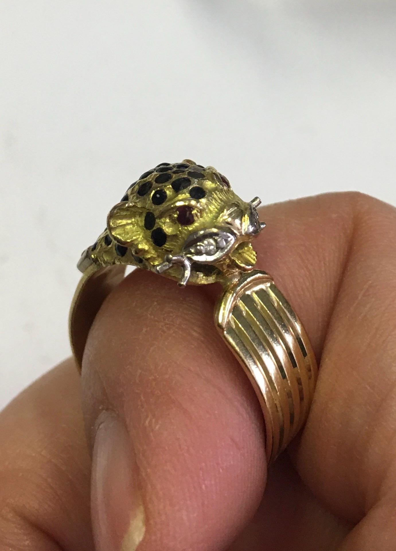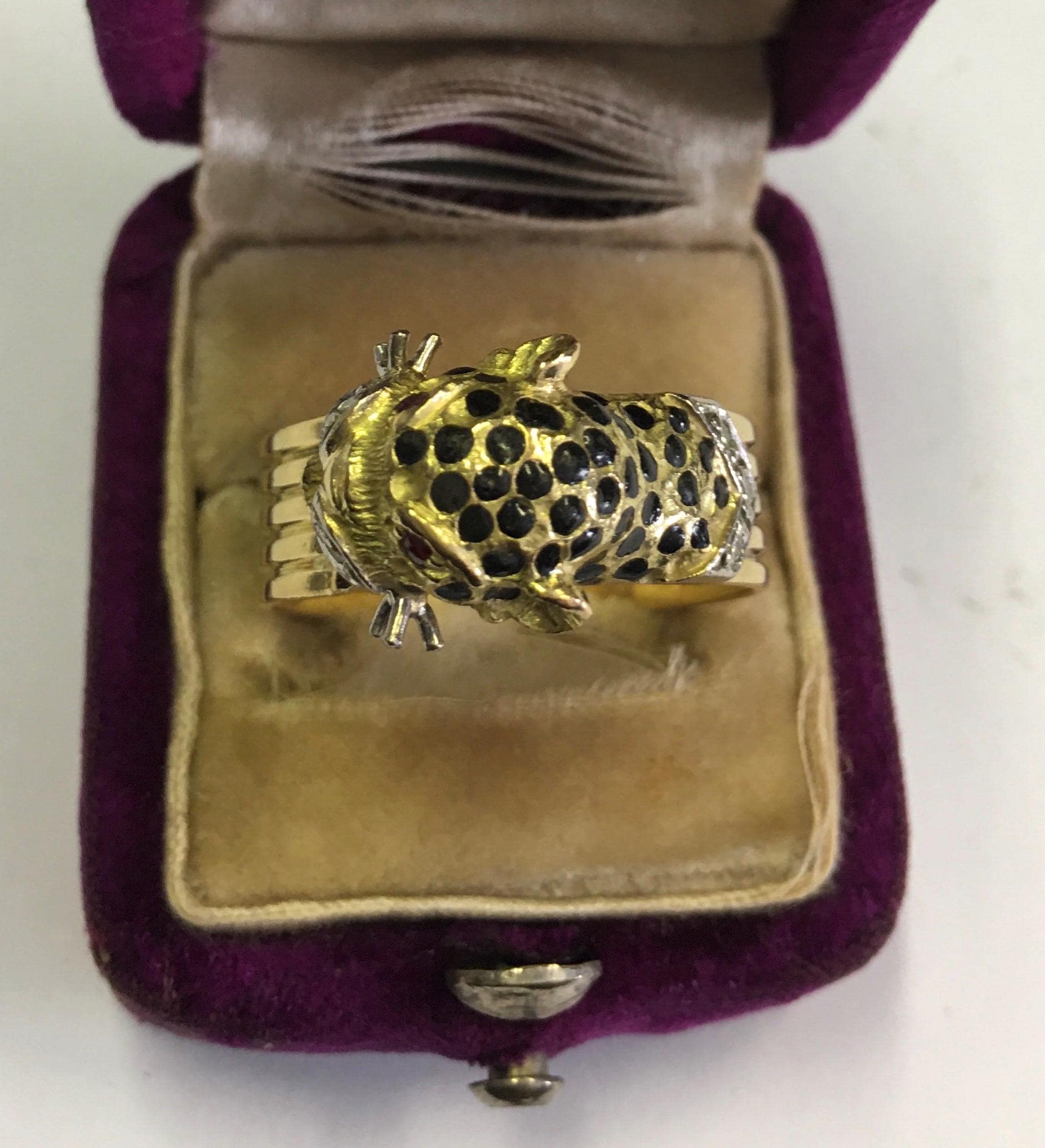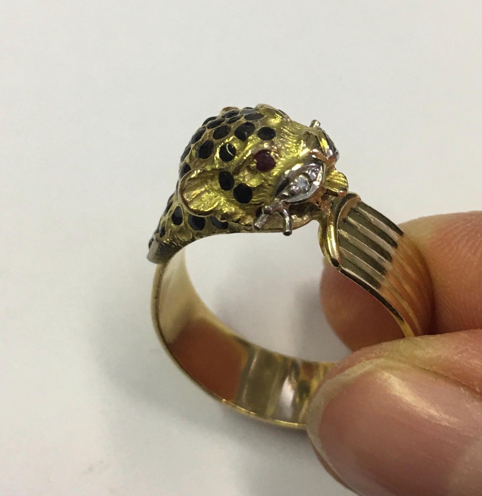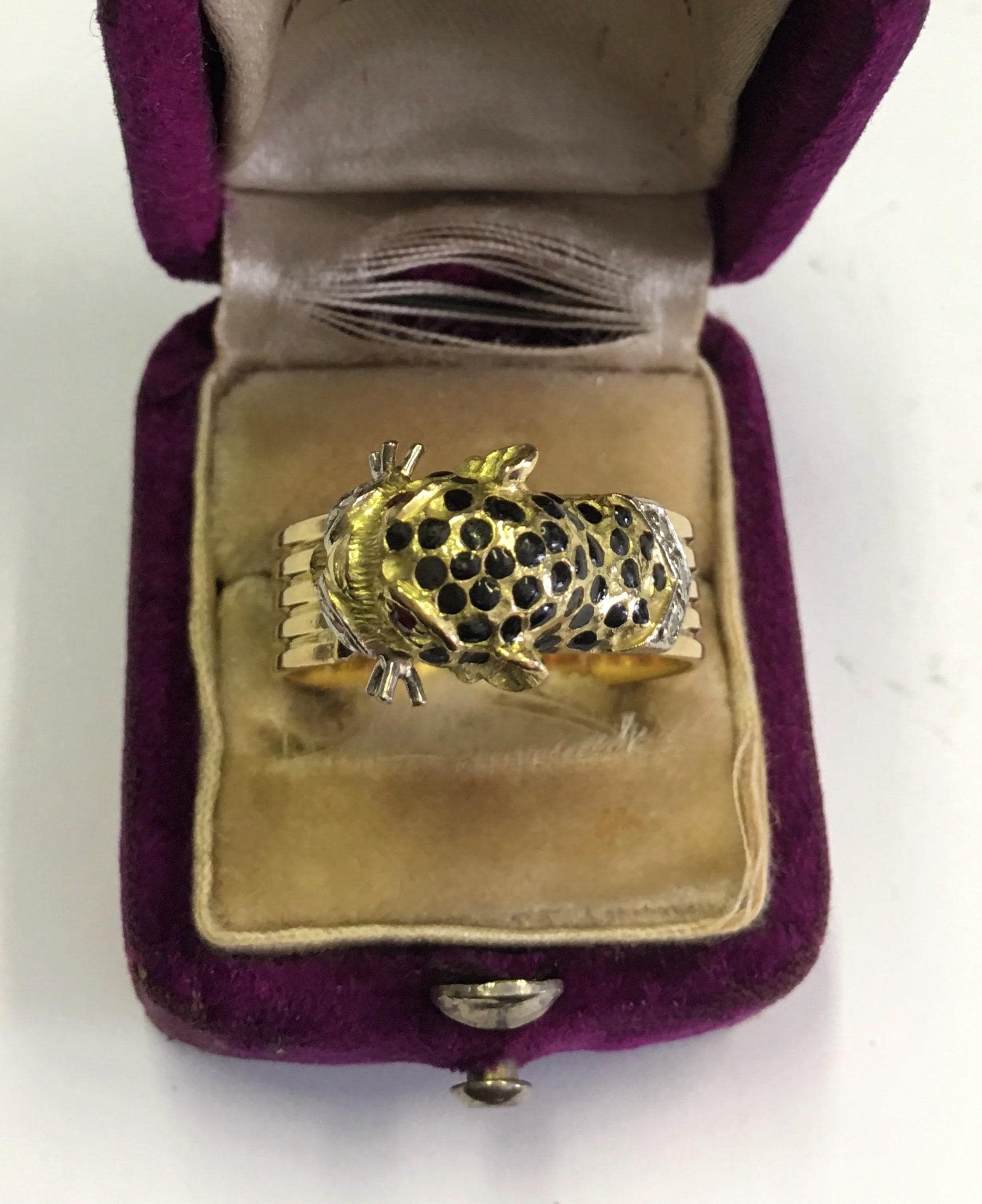 Superb vintage 18 Ct Gold delightful Panther ring adorned with exquisite Diamonds and Ruby eyes. Wonderful enamelled detail with lovely movement and design. The craftsman ship is breath taking. Very rare one in a million piece, looks divine on. Love love love this ring.