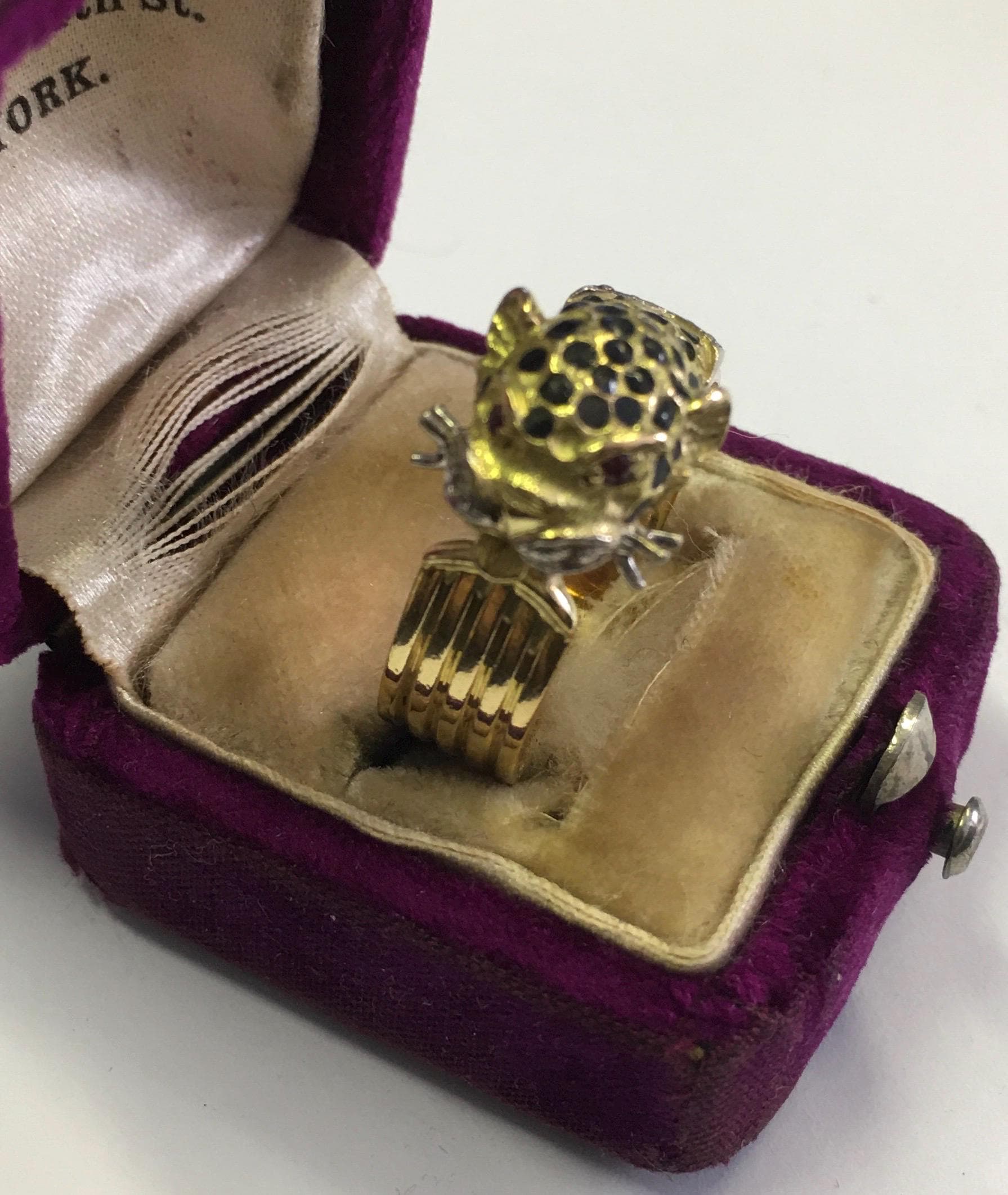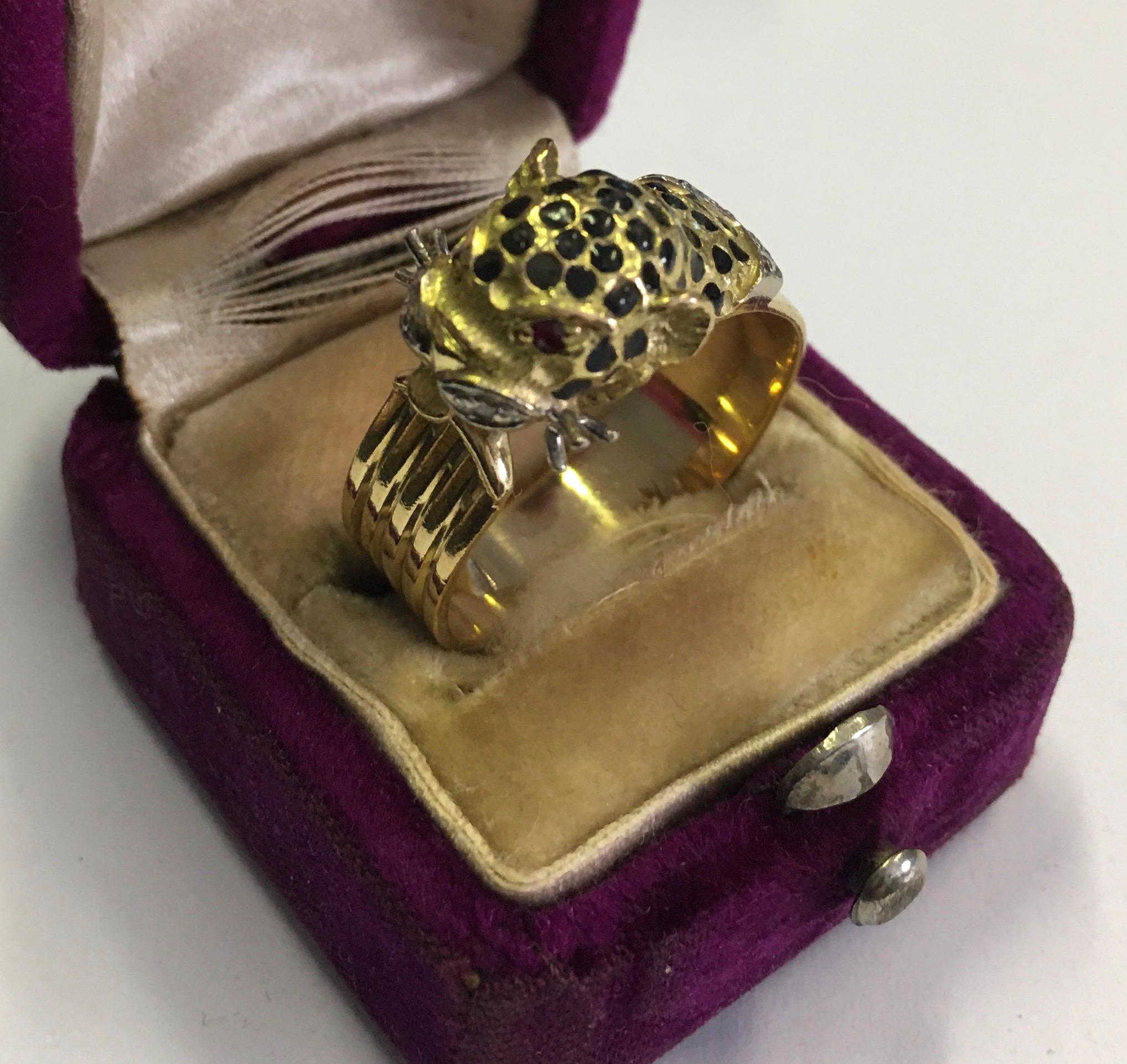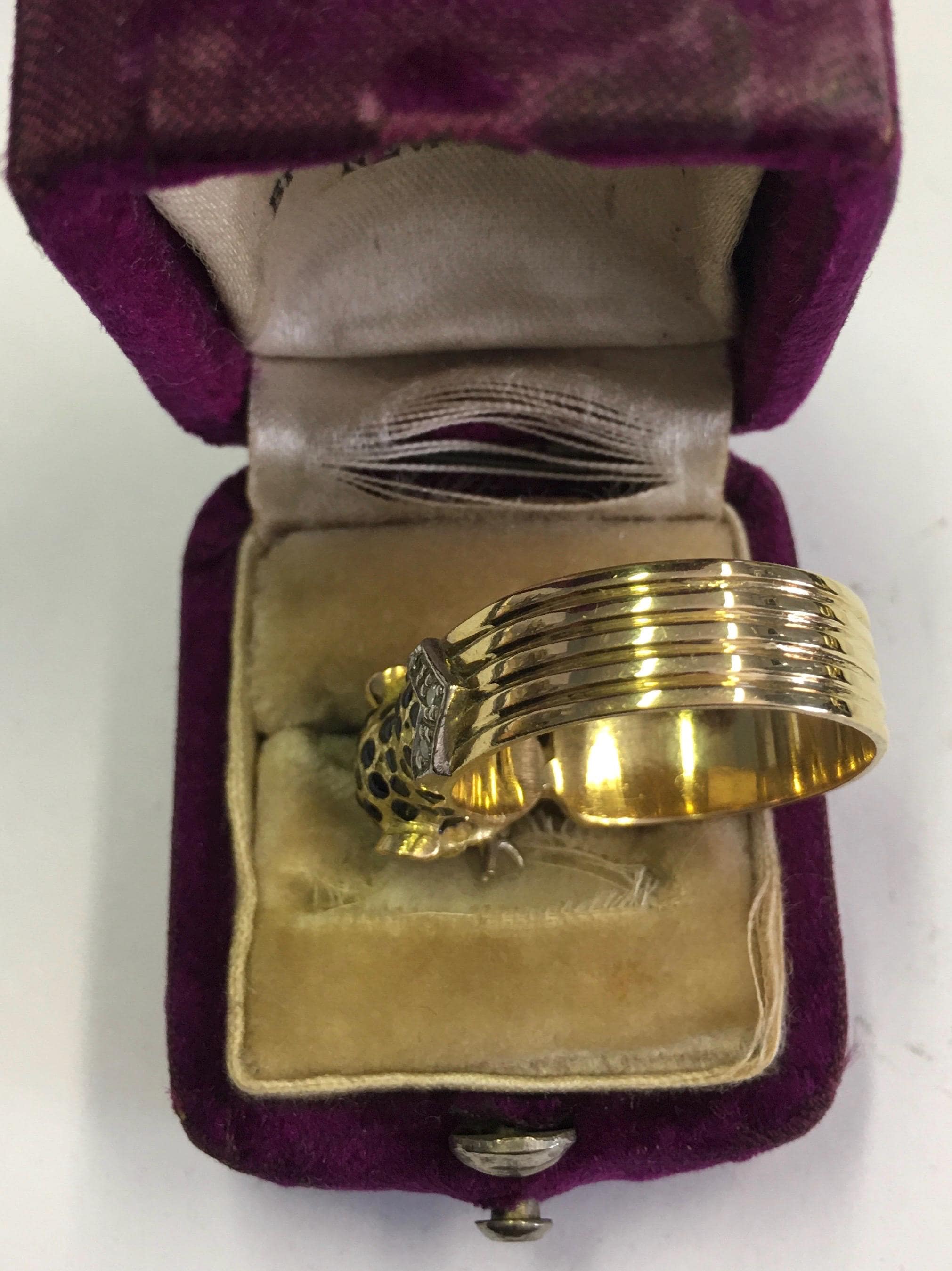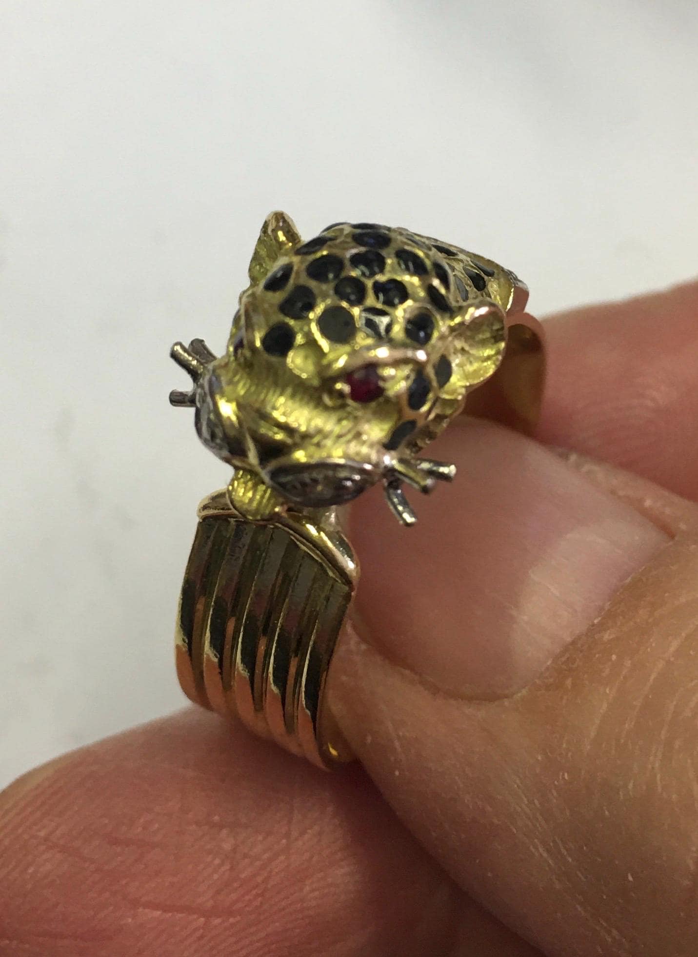 Superb vintage 18 Ct Gold delightful Panther ring adorned with exquisite Diamonds and Ruby eyes. Wonderful enamelled detail with lovely movement and design. The craftsman ship is breath taking. Very rare one in a million piece, looks divine on. Love love love this ring.