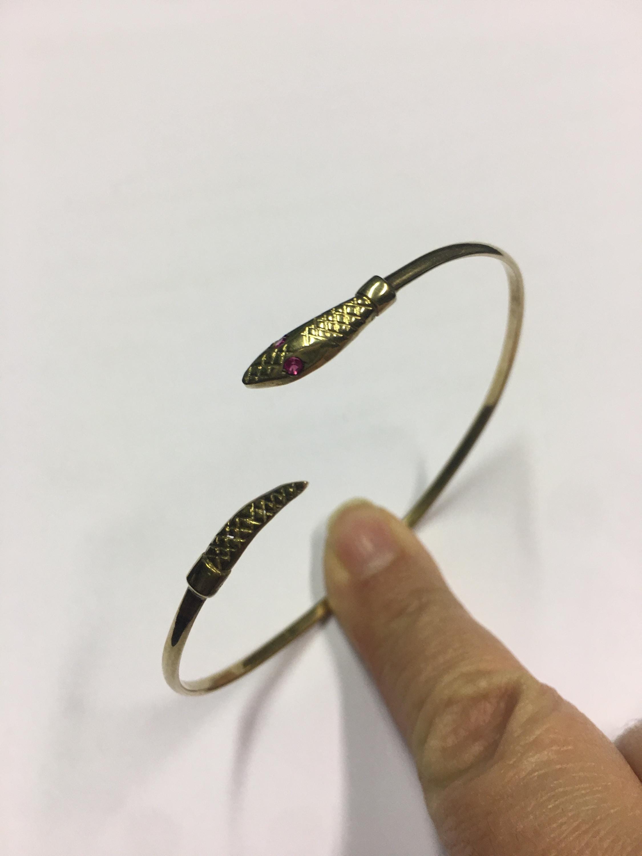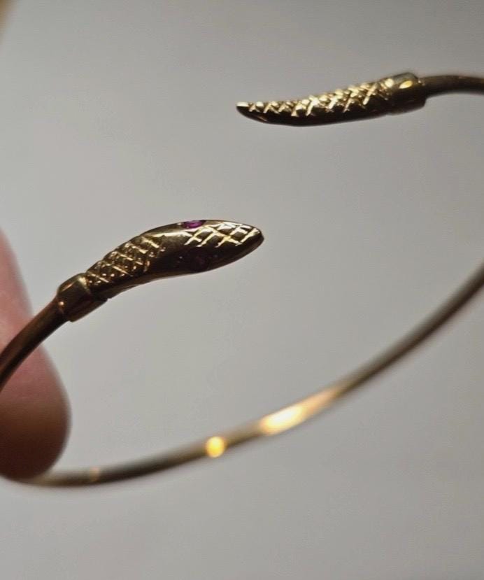 A very Rare Vintage 9 Ct Gold Snake bangle. Great detail and design. The snake head has fantastic craftsmanship set with exquisite Ruby Eyes. Fantastic Movement. Divine piece.