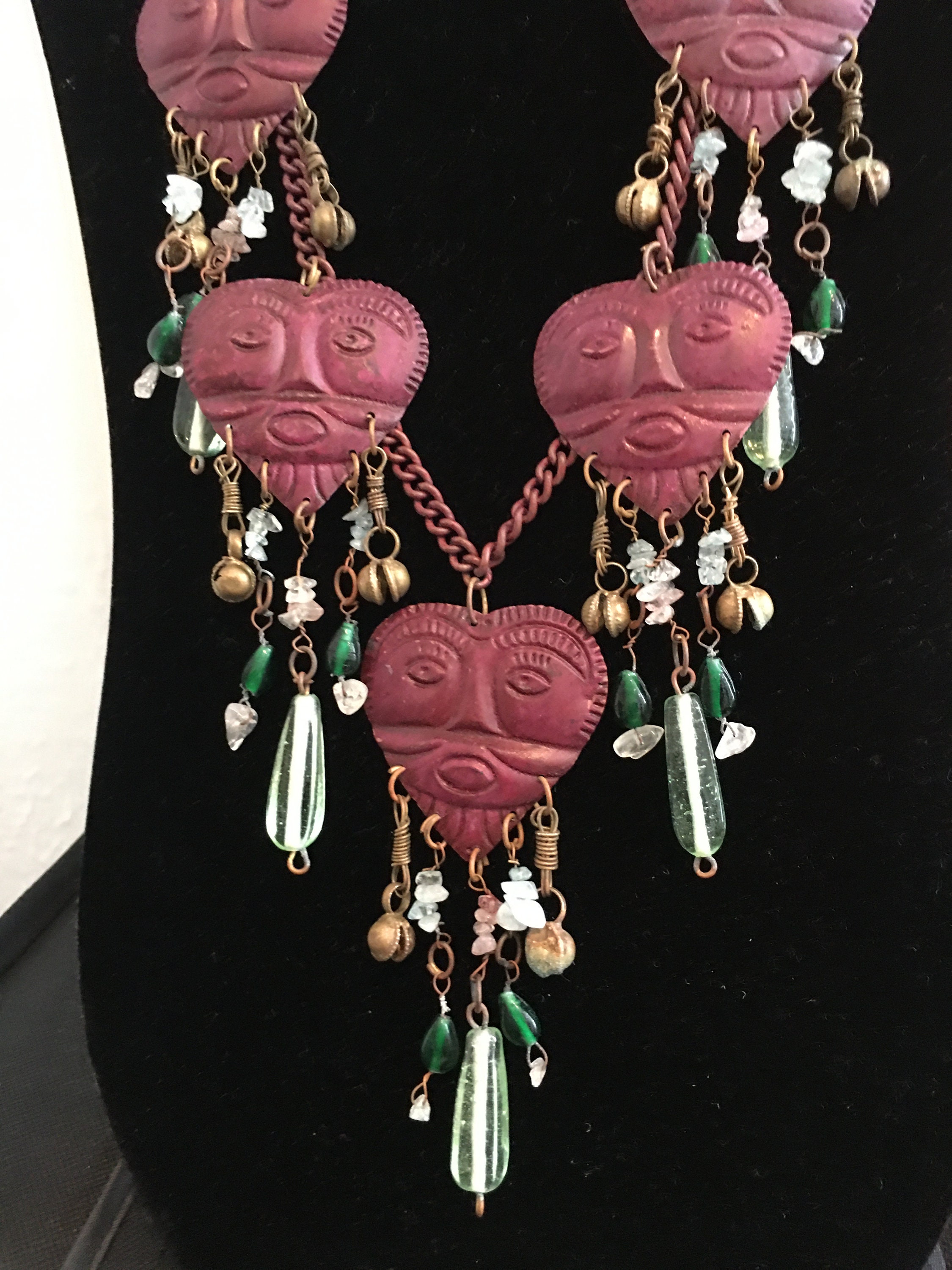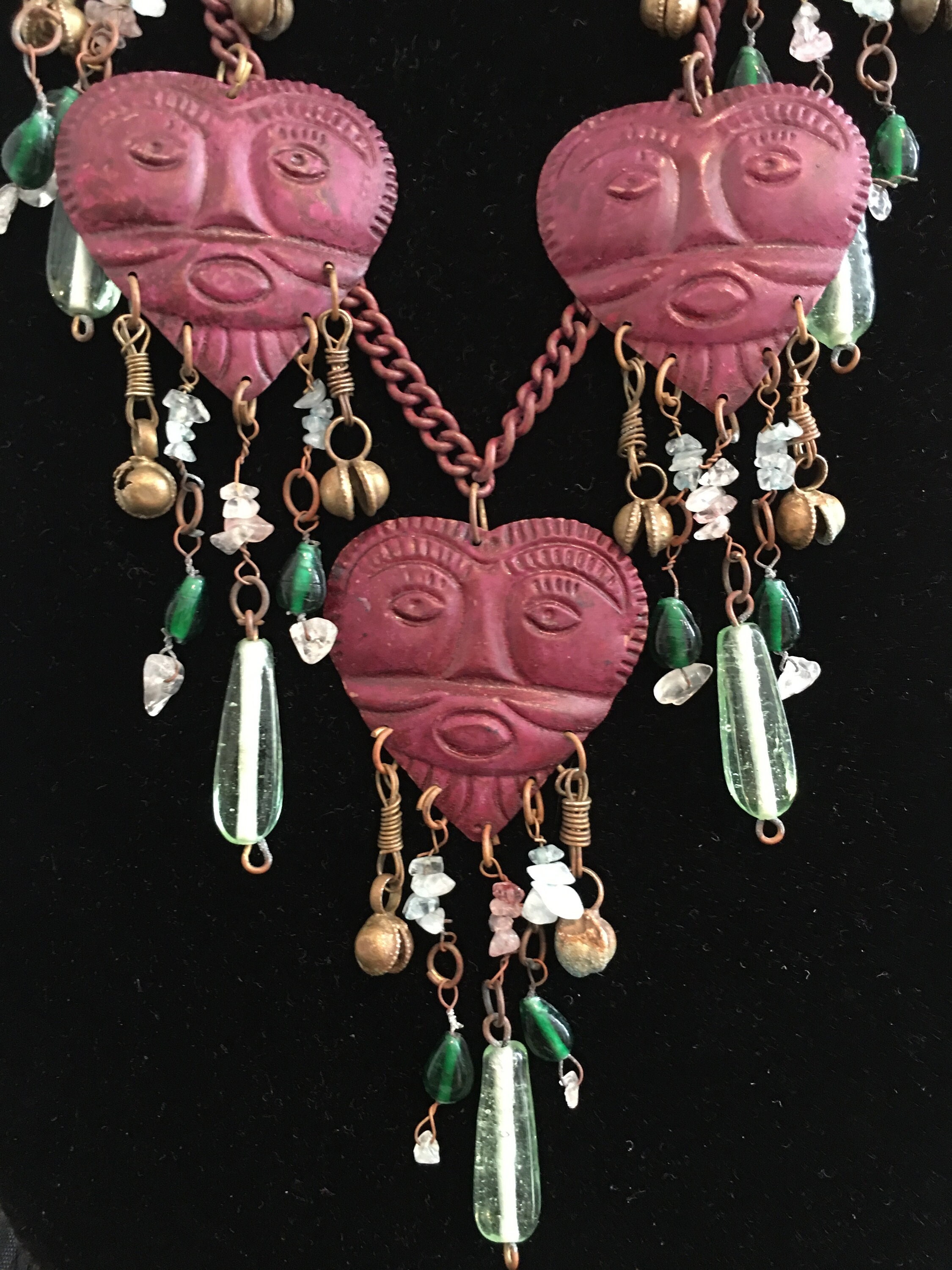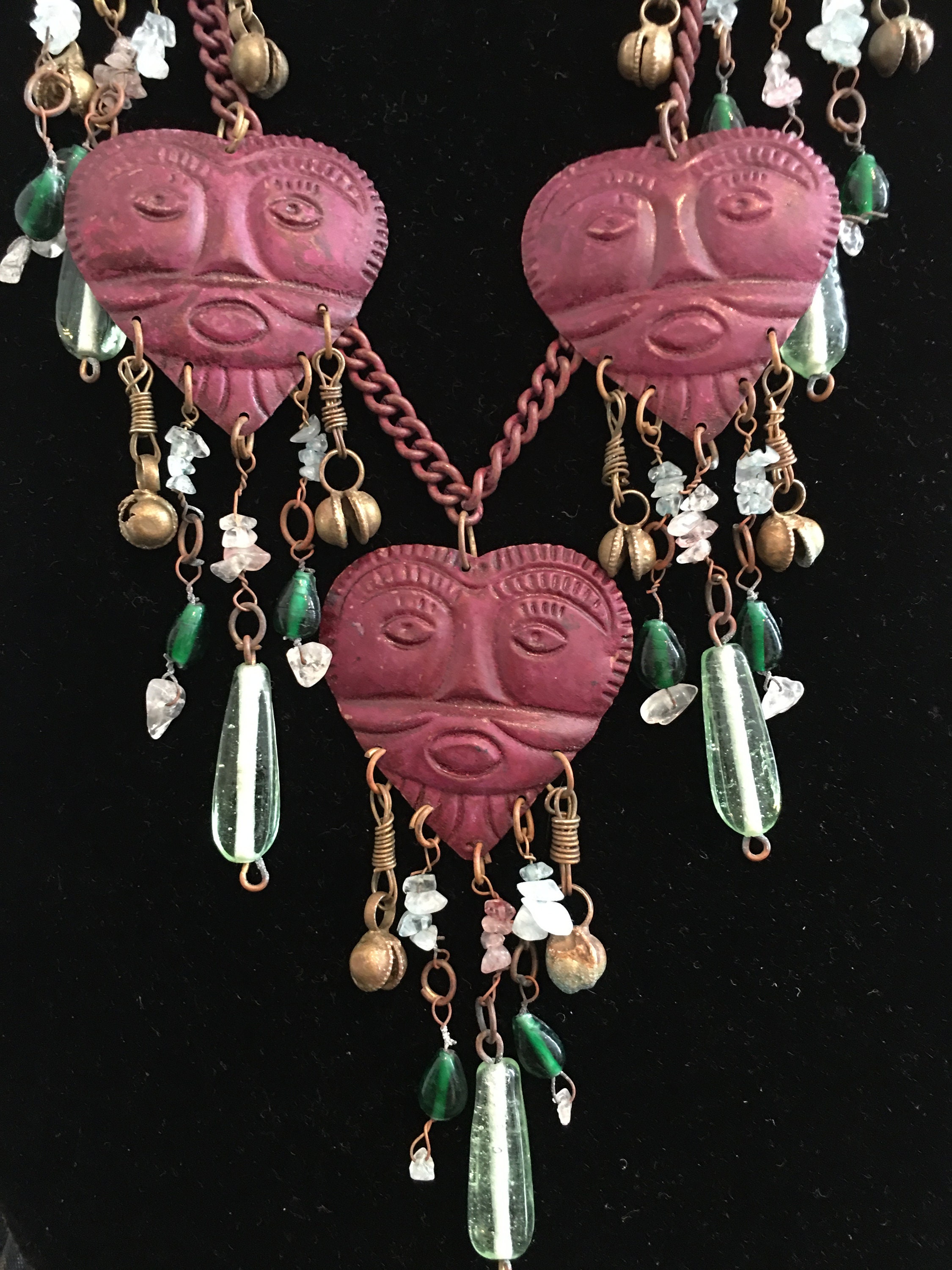 A magnificent vintage rare heart face statement necklace with fantastic design. Featuring four burgundy heart pendants with abstract style faces, decorated with crystals, glass beads and charms, on a burgundy chain. Very rare one in a million piece, makes me smile every time.