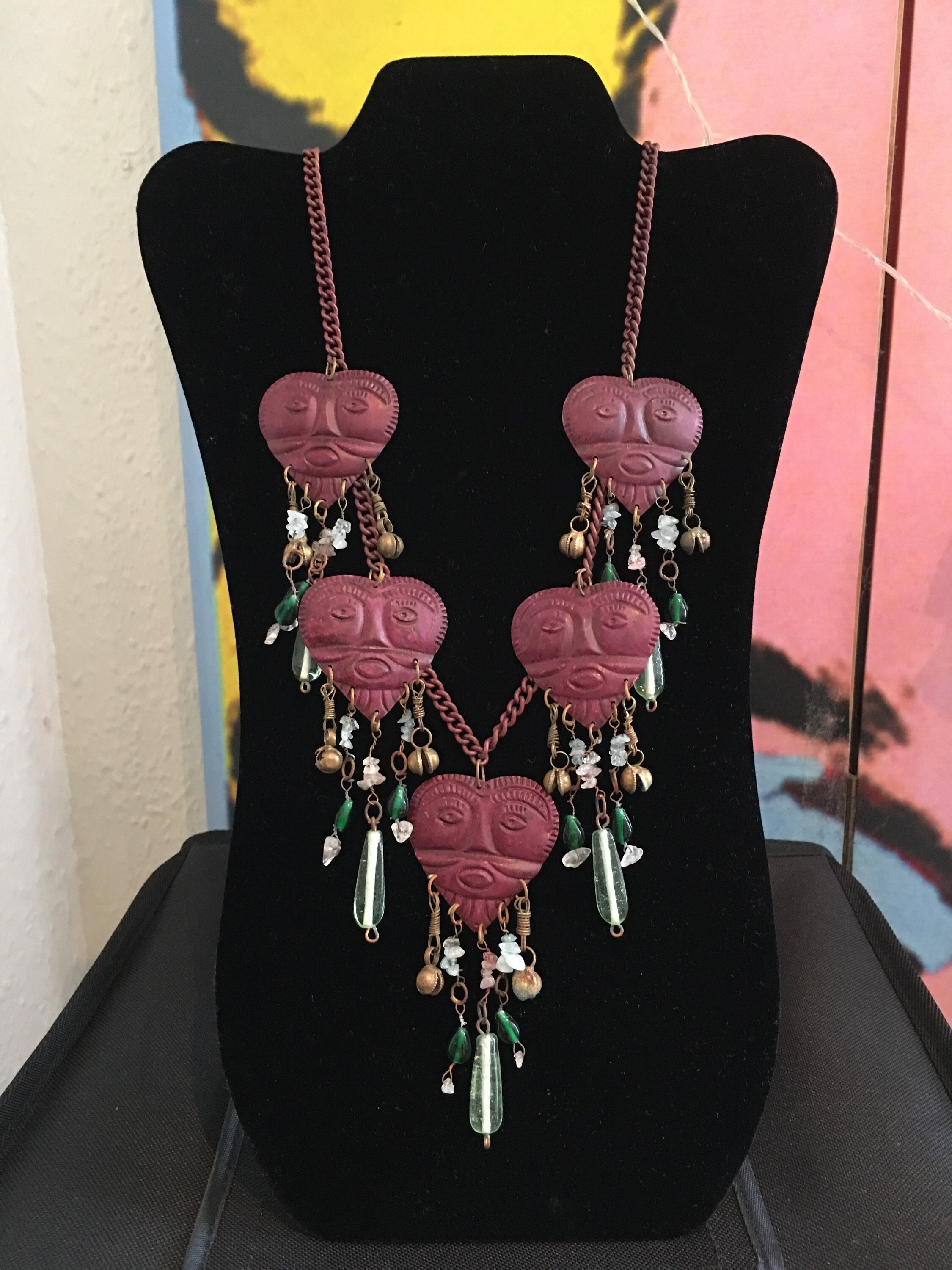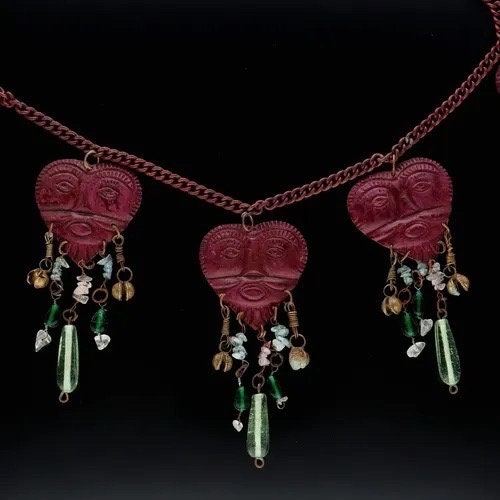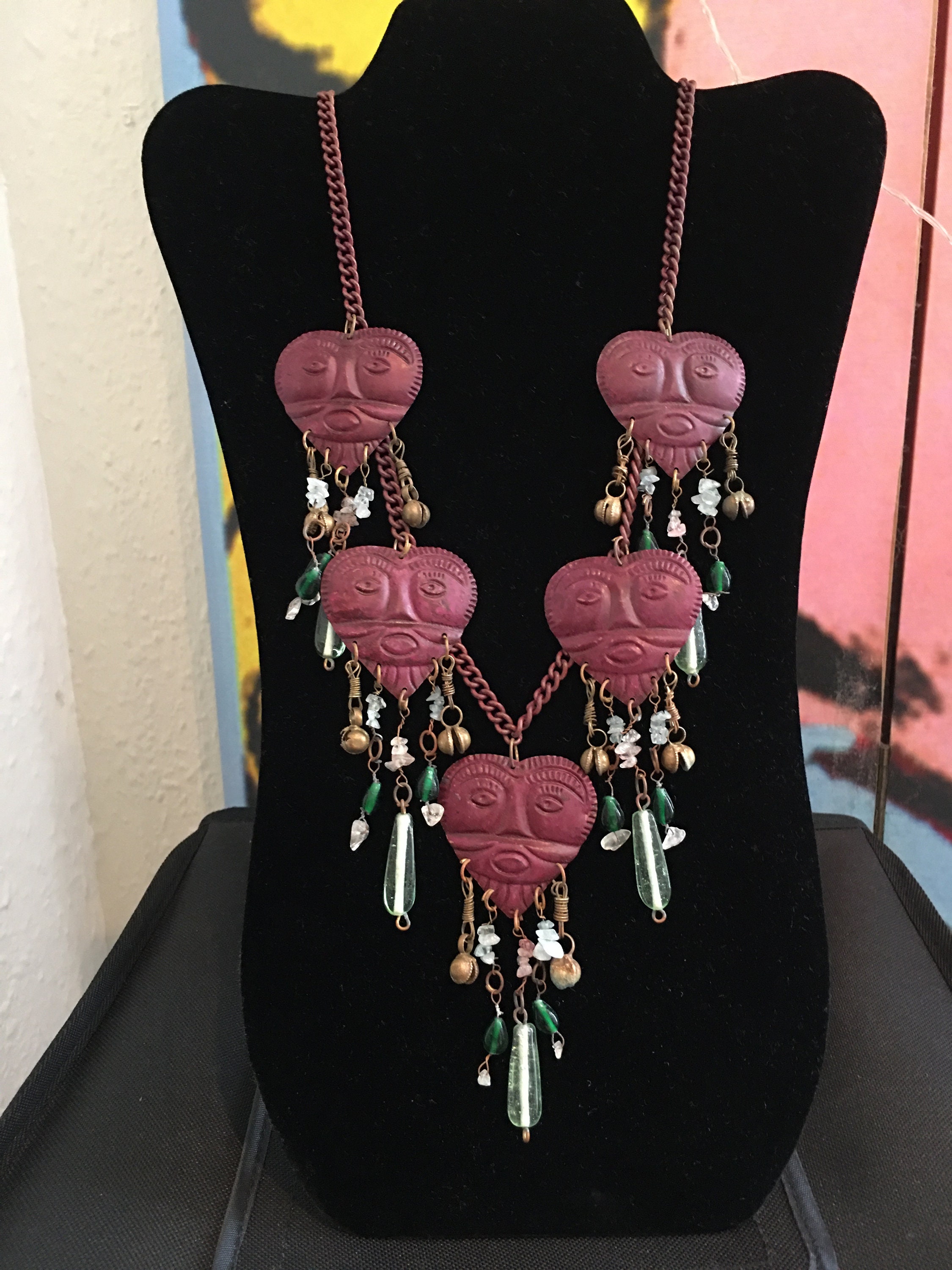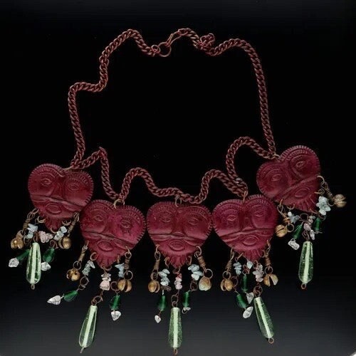 A magnificent vintage rare heart face statement necklace with fantastic design. Featuring four burgundy heart pendants with abstract style faces, decorated with crystals, glass beads and charms, on a burgundy chain. Very rare one in a million piece, makes me smile every time.