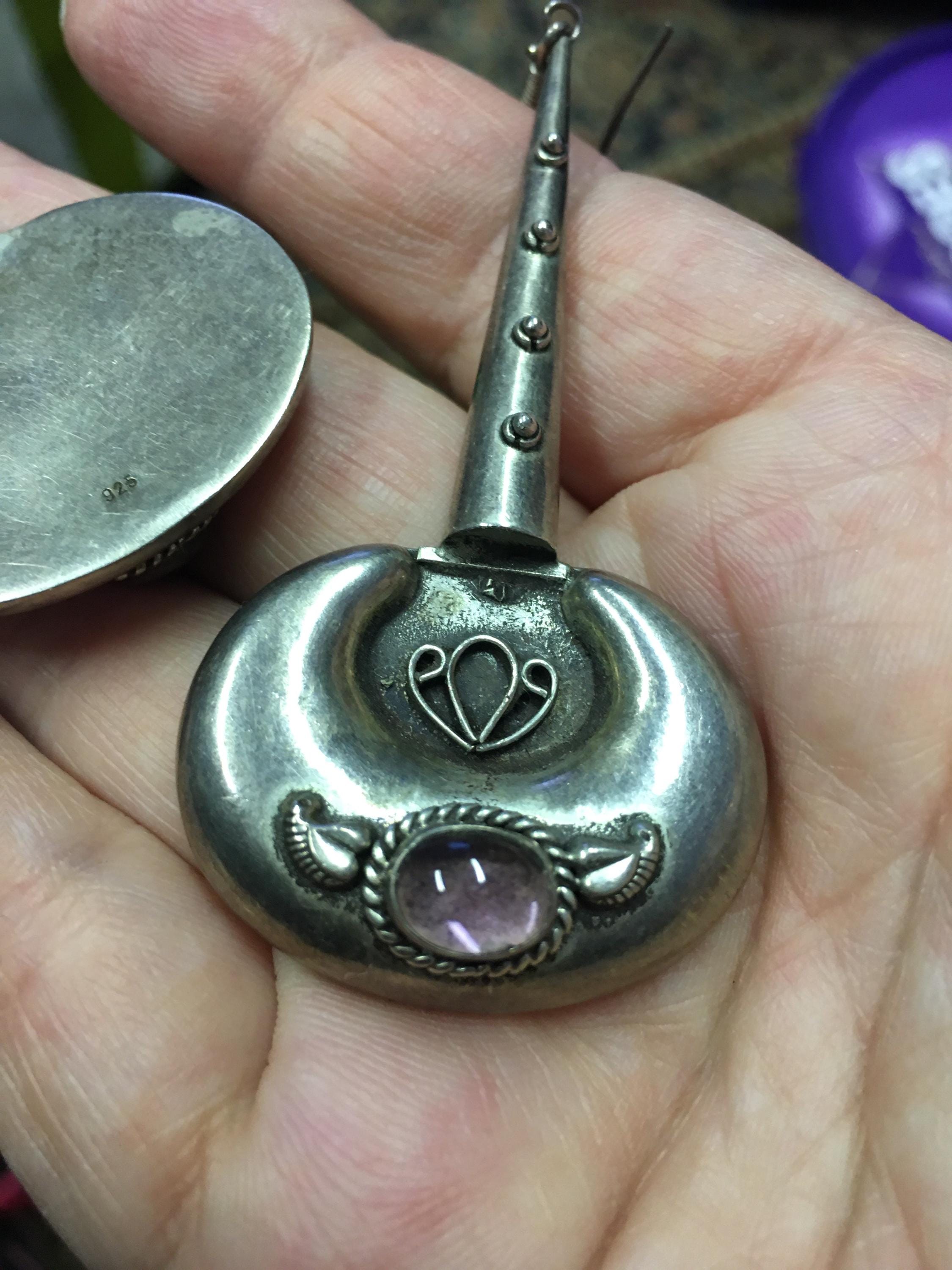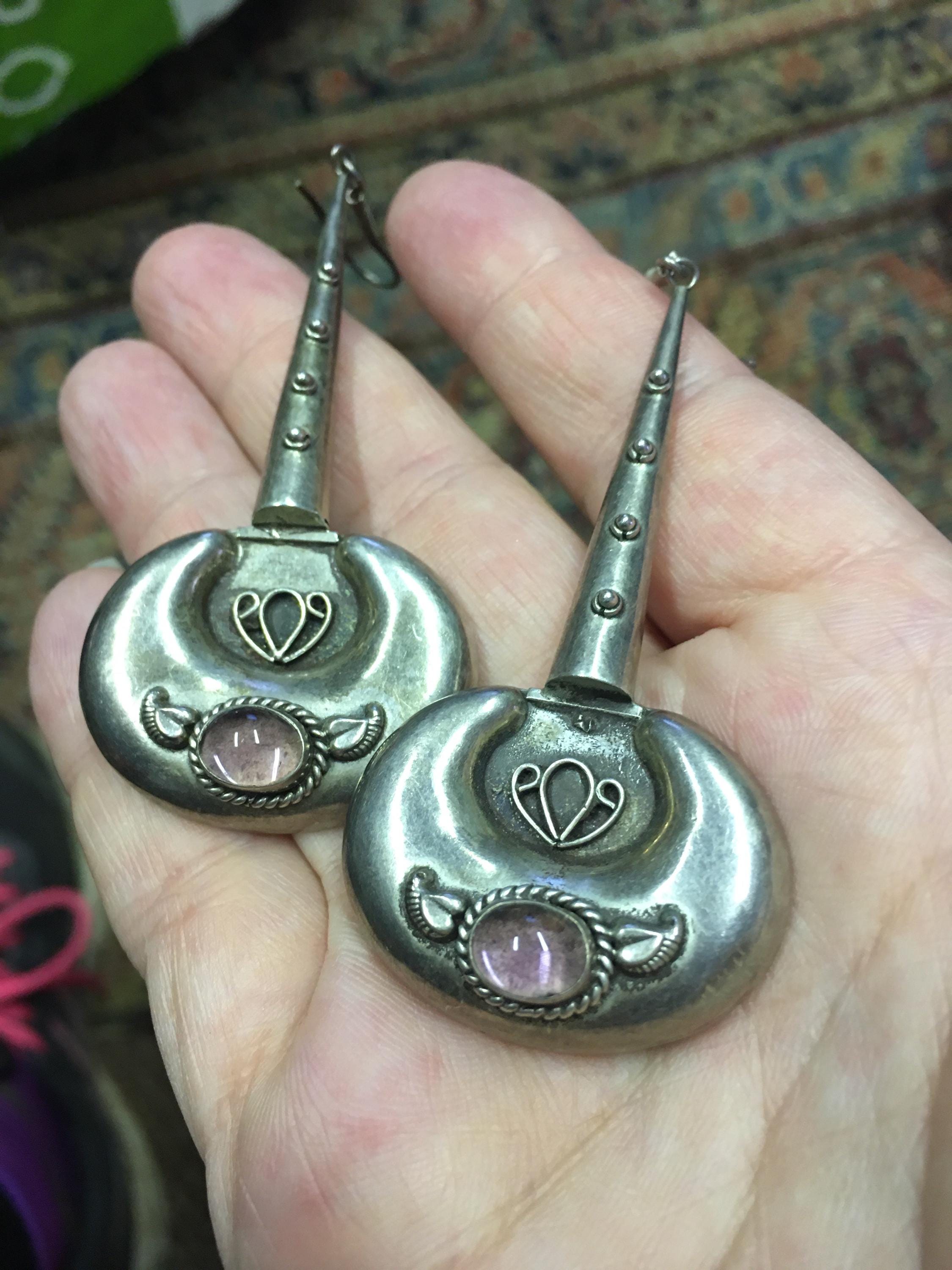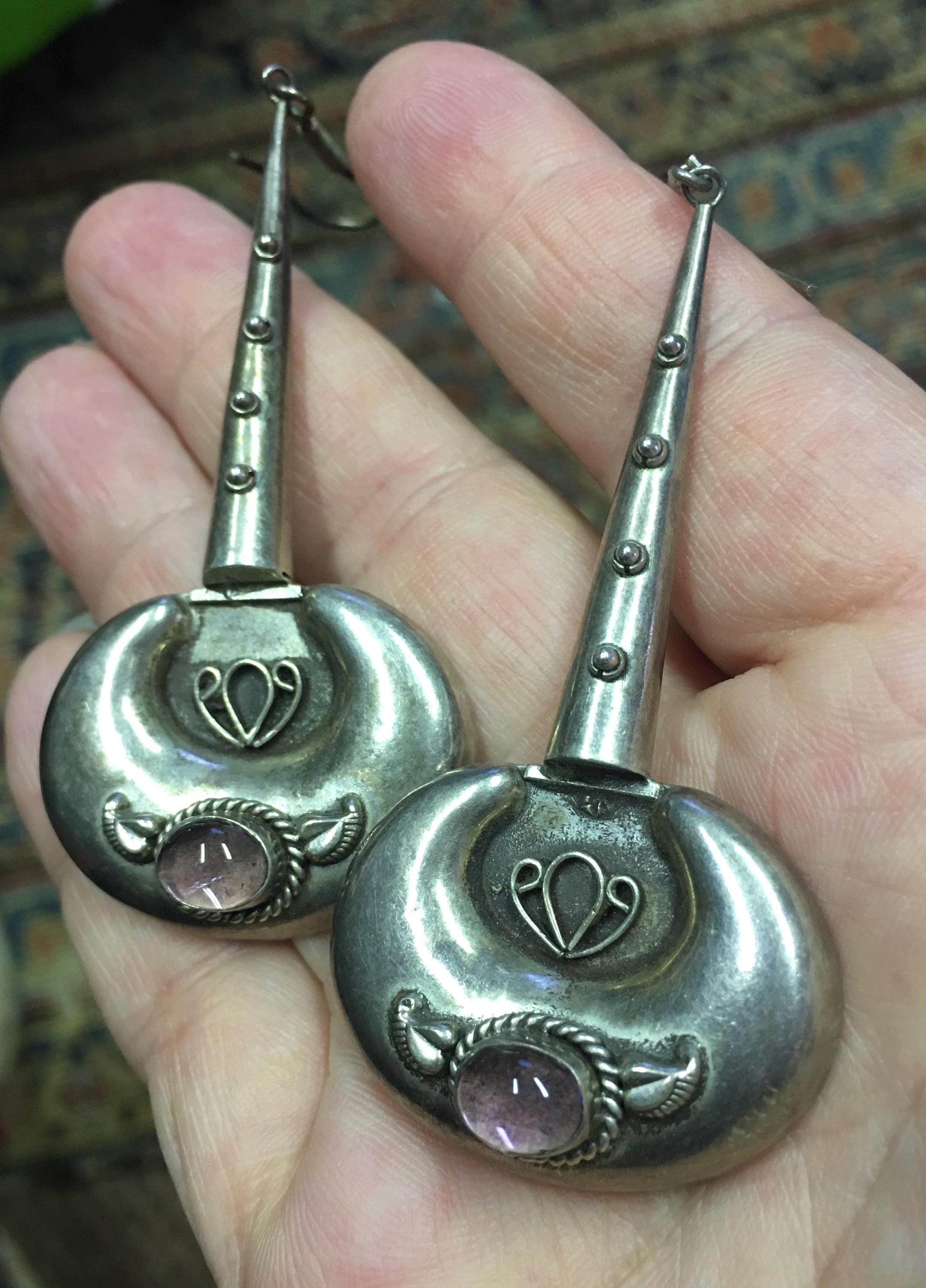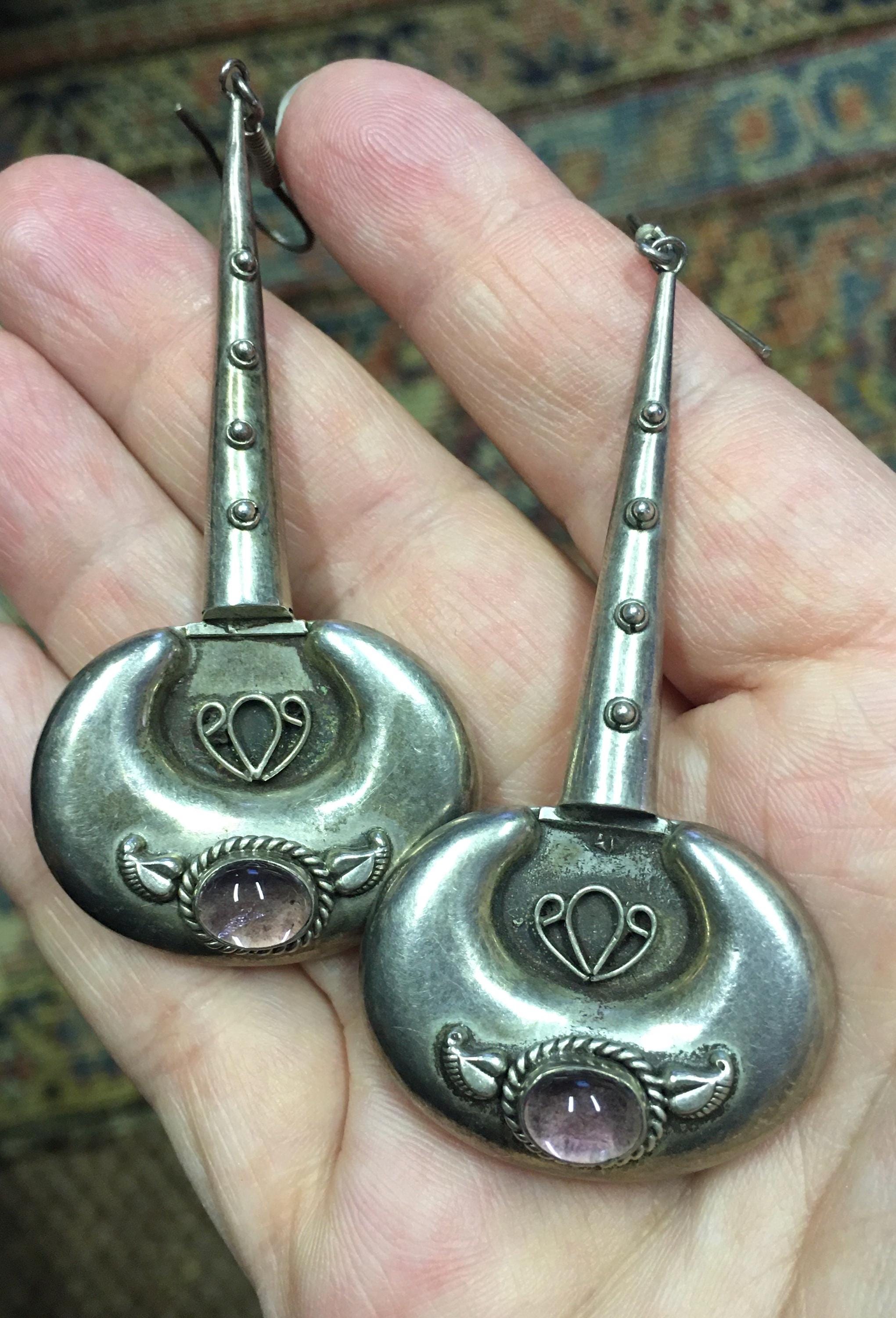 Magnificent Vintage sterling silver Earring's with wonderful design and style, rare design set with with beautiful Amethyst sparkly stone.. Very rare. Perfect to add sparkle to any outfit. Very rare stylised design pair.