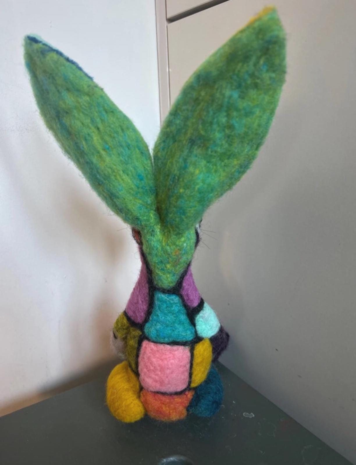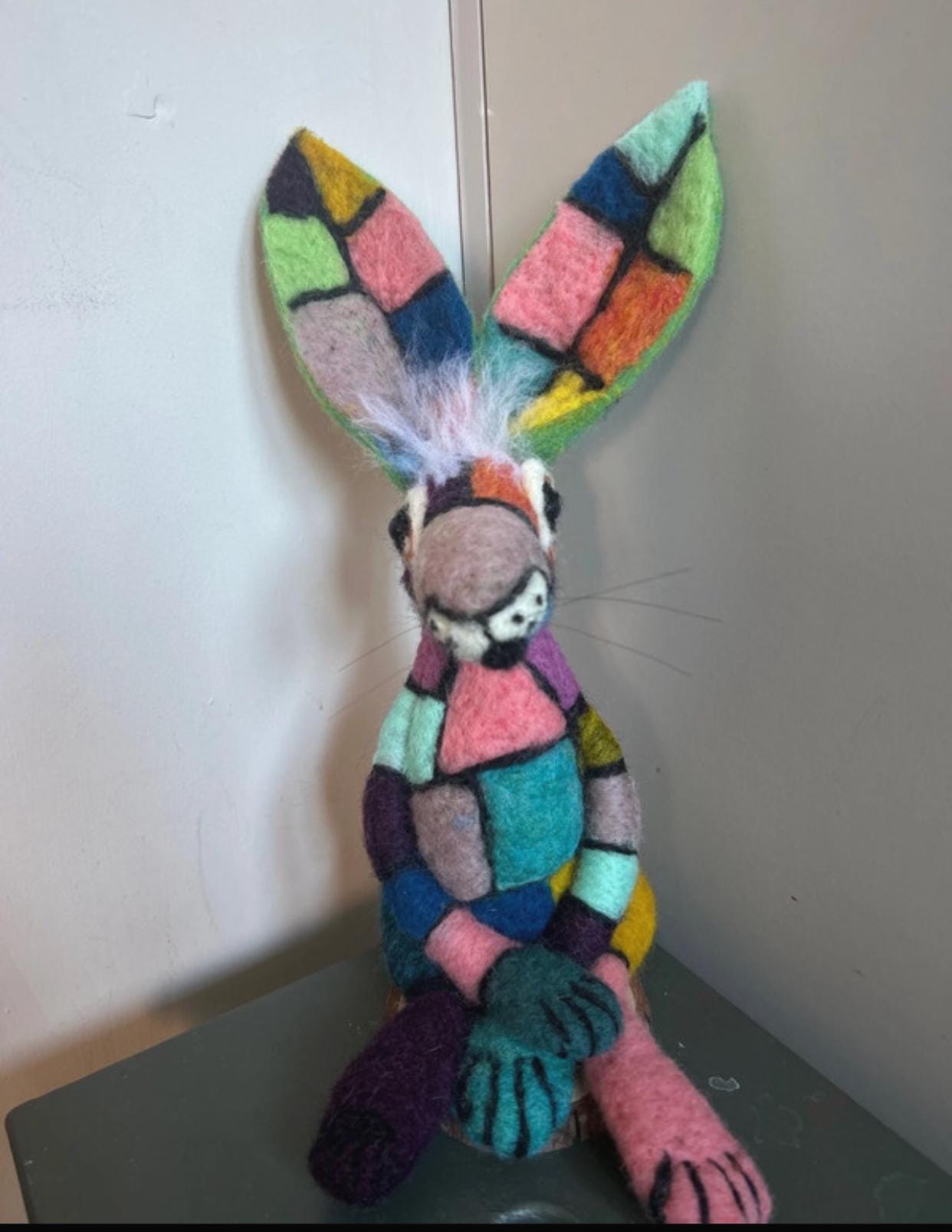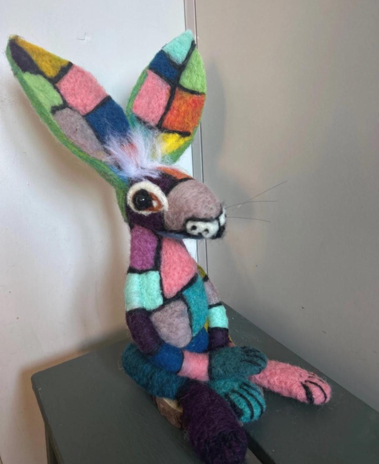 A fabulous hand made patchwork needle felted Hare with divine craftsmanship and design. The colours are delightful. Not suitable for children. LOVE LOVE LOVE this.