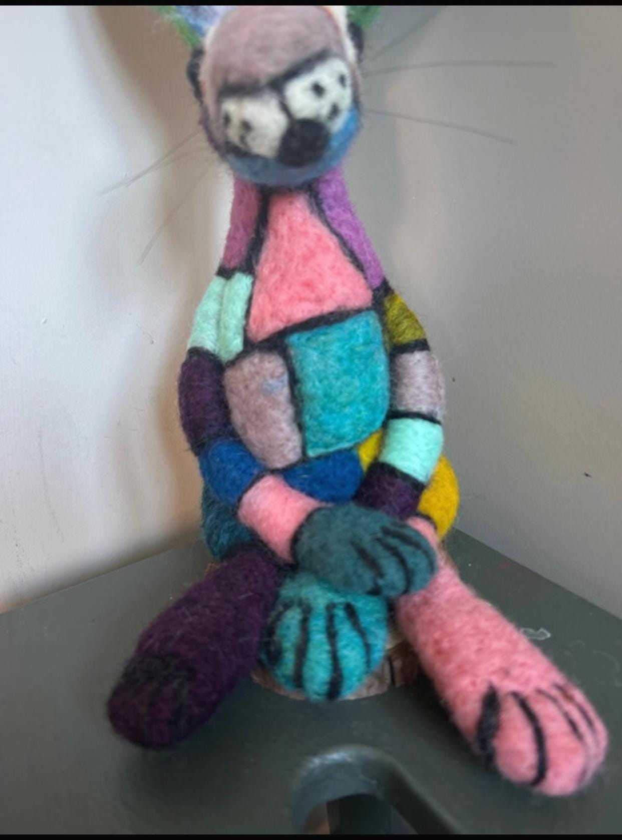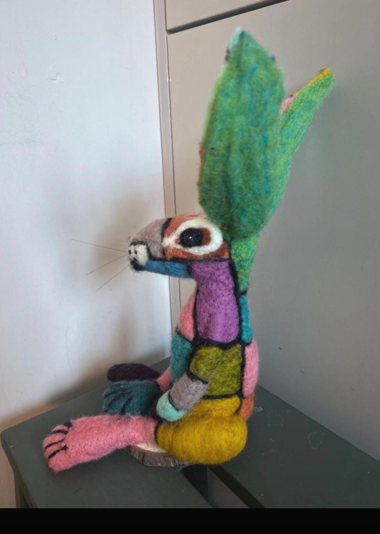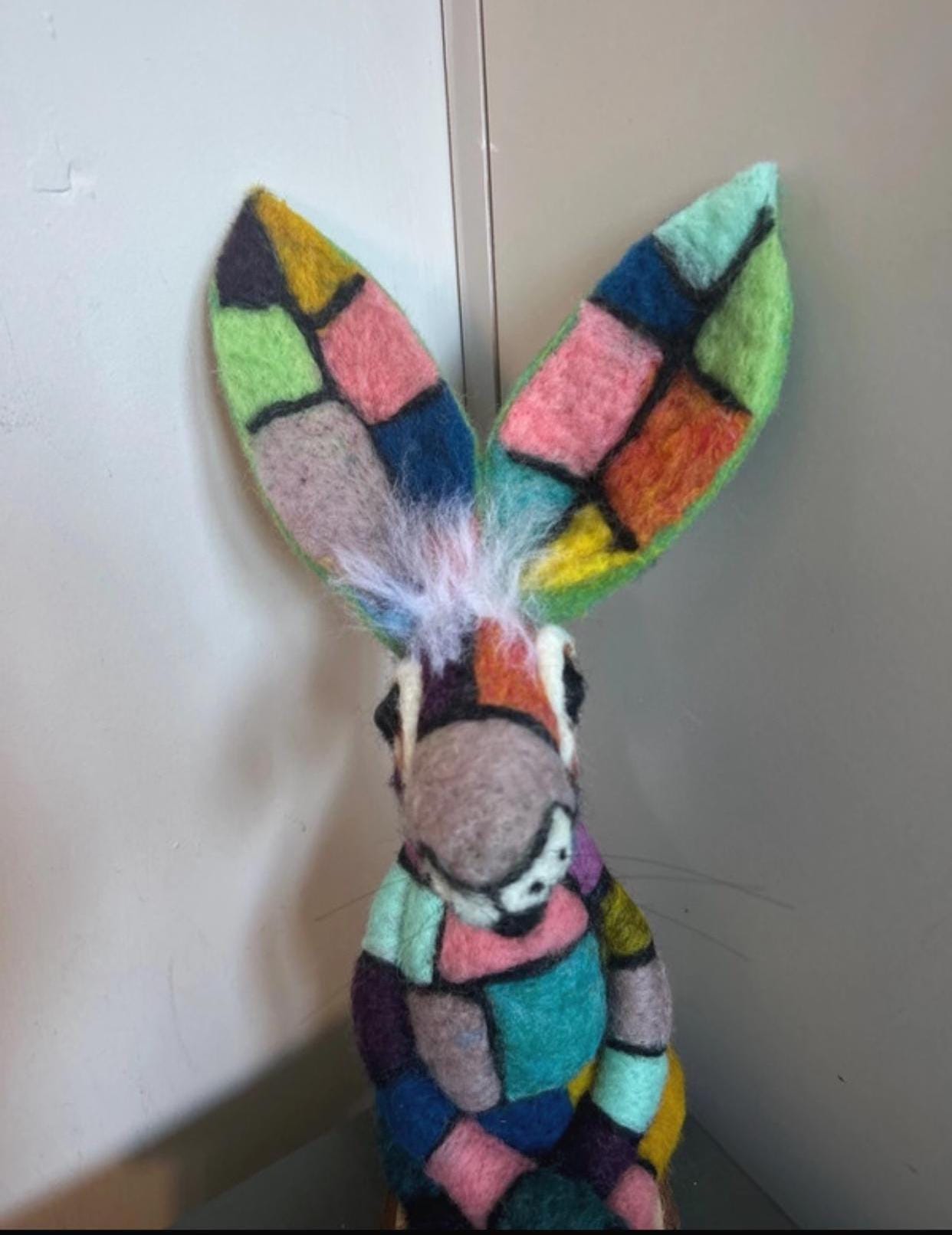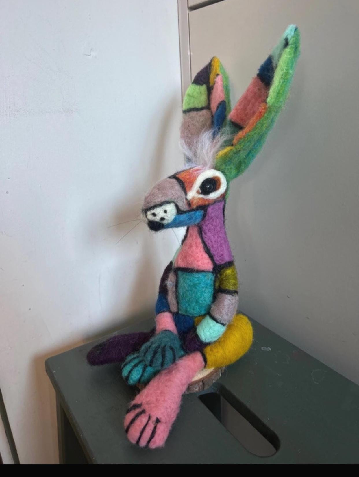 A fabulous hand made patchwork needle felted Hare with divine craftsmanship and design. The colours are delightful. Not suitable for children. LOVE LOVE LOVE this.