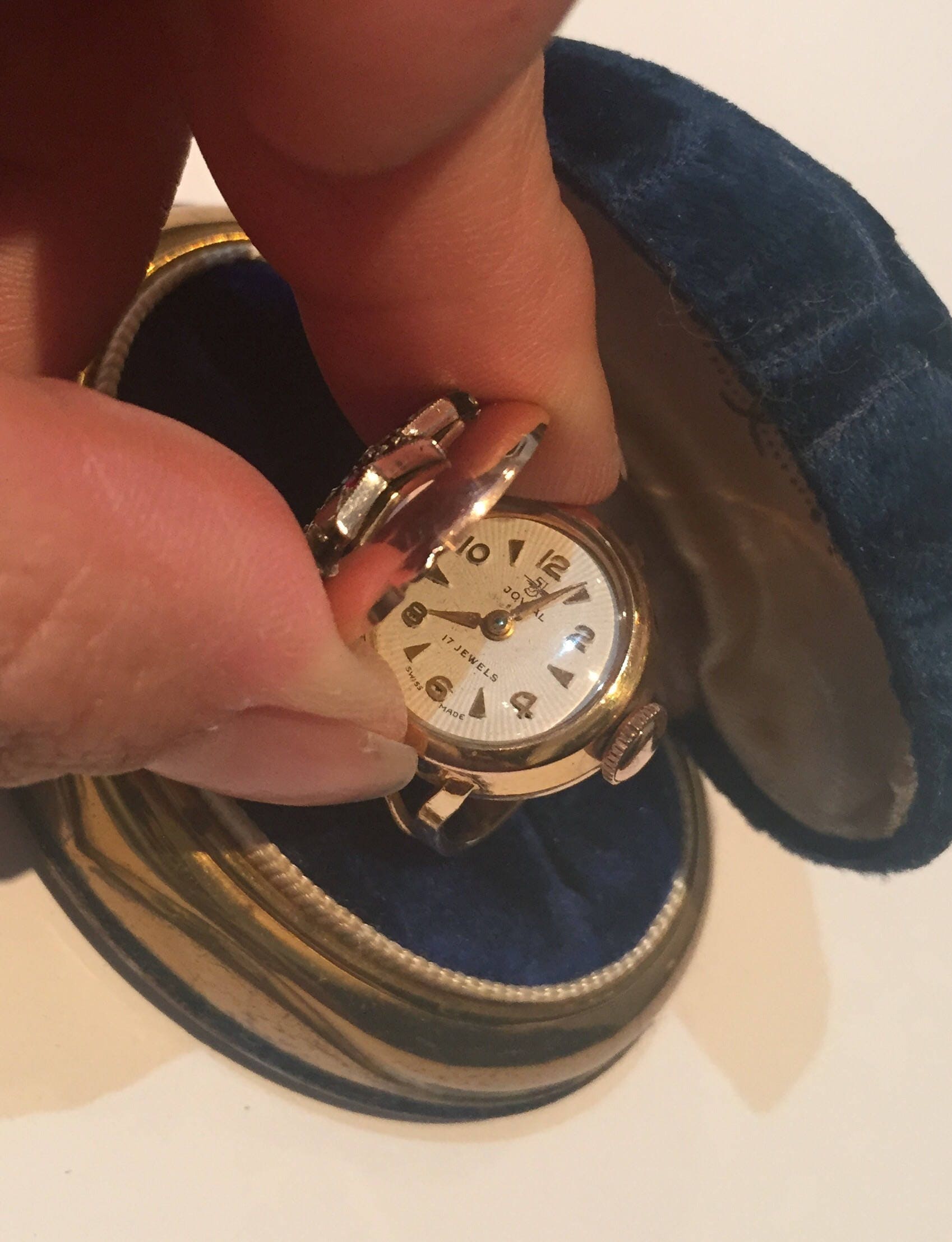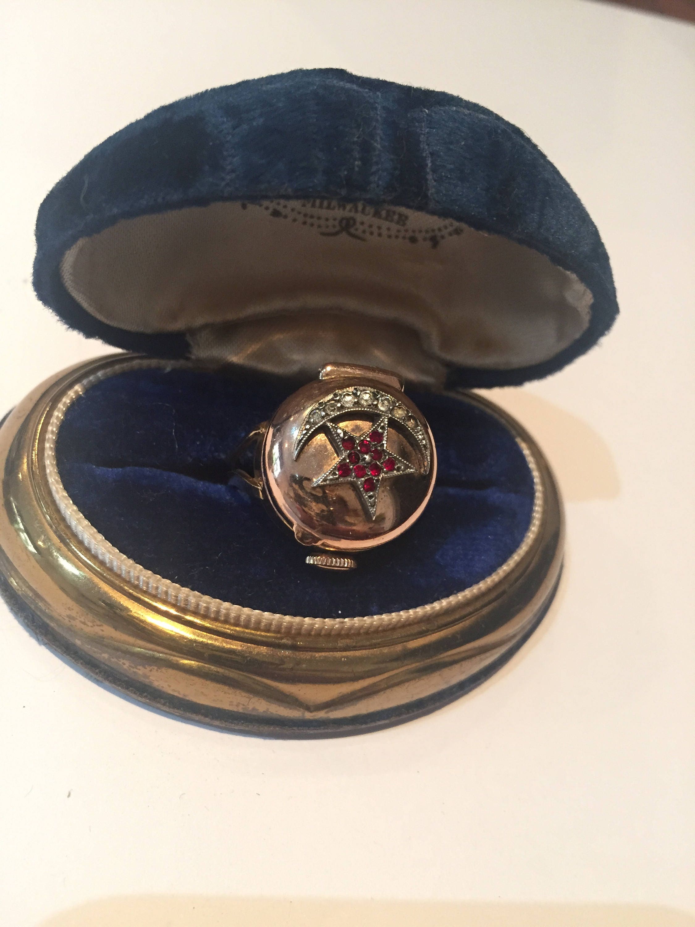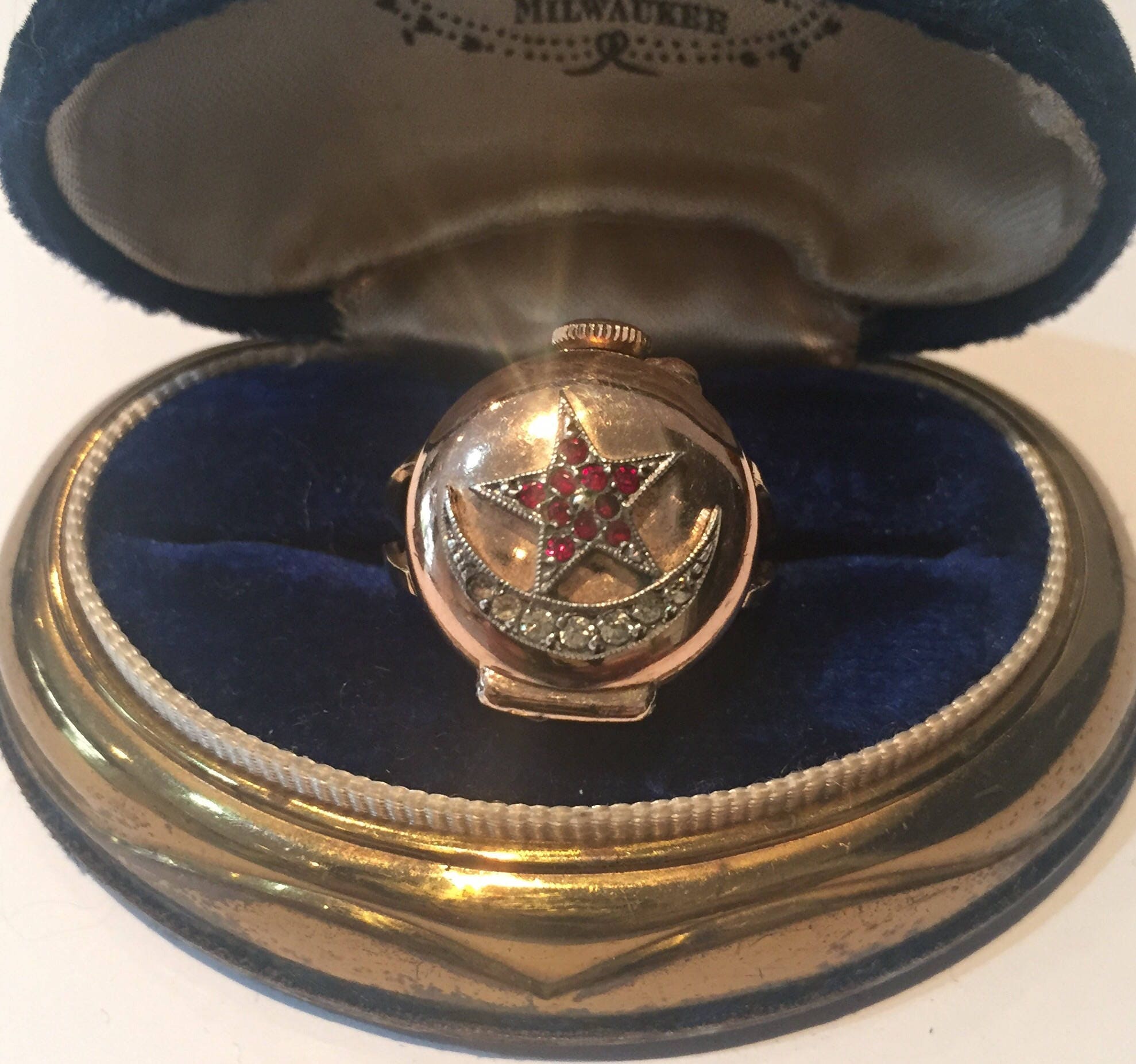 A fantastic vintage 9 carat rolled gold Watch ring with exquisite Garnet Star design and Paste Moon design. This ring is a fully working watch inside, its Swiss made and dated c.1950's, its so rare and unusual. A breathtaking piece.