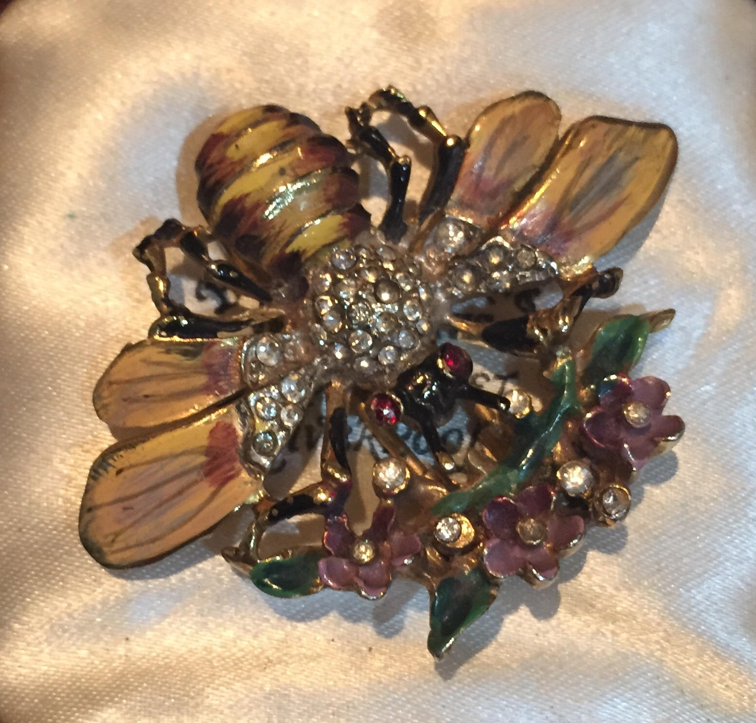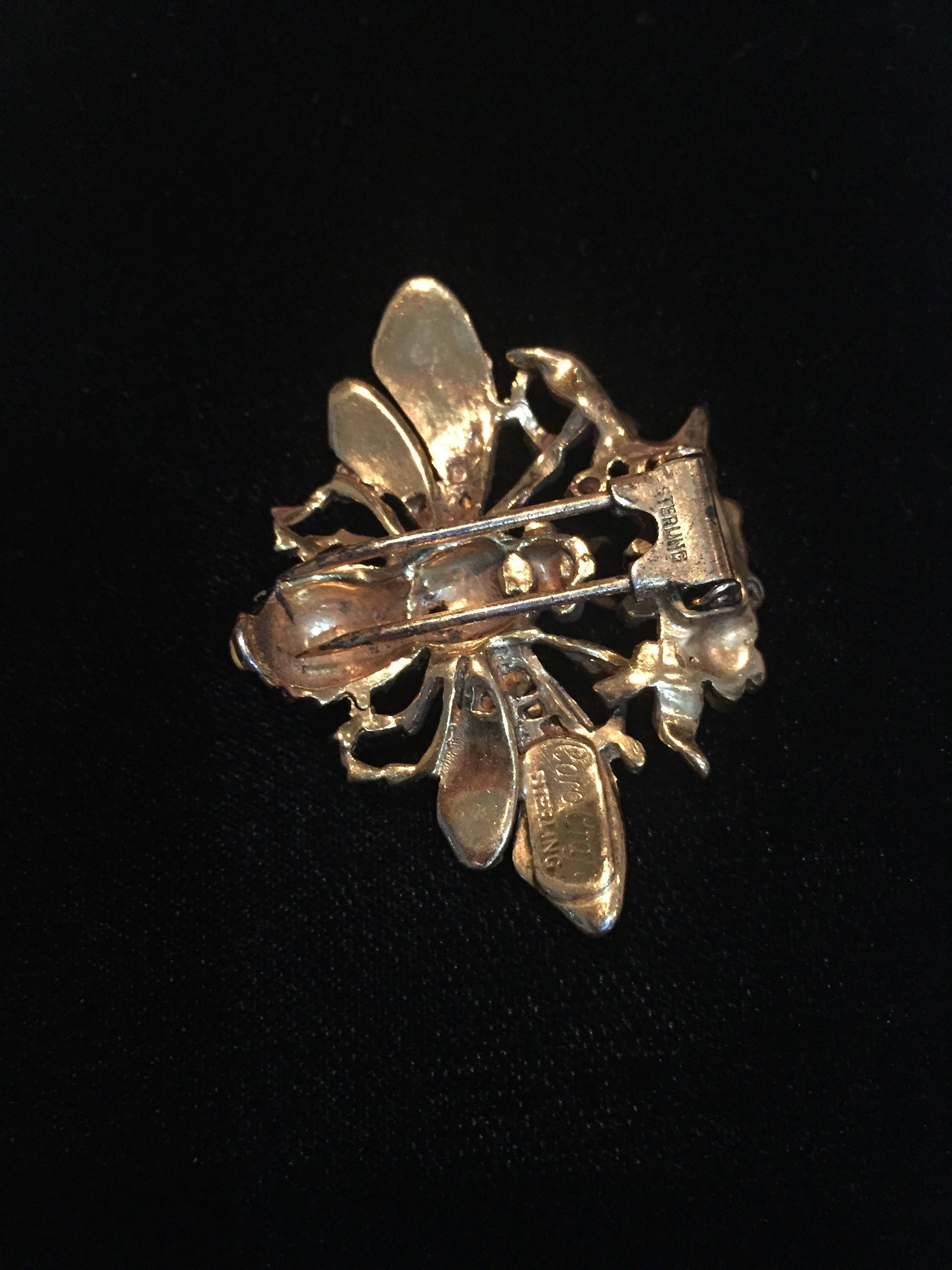 A beautiful Vintage sterling Silver enamelled Rhinestone Bee brooch pin by Corocraft. Date circa 1940's. The craftsmanship is exquisite. Gold plated. Marked Coro craft sterling. Extremely rare piece never seen before. Divine brooch. Book piece.