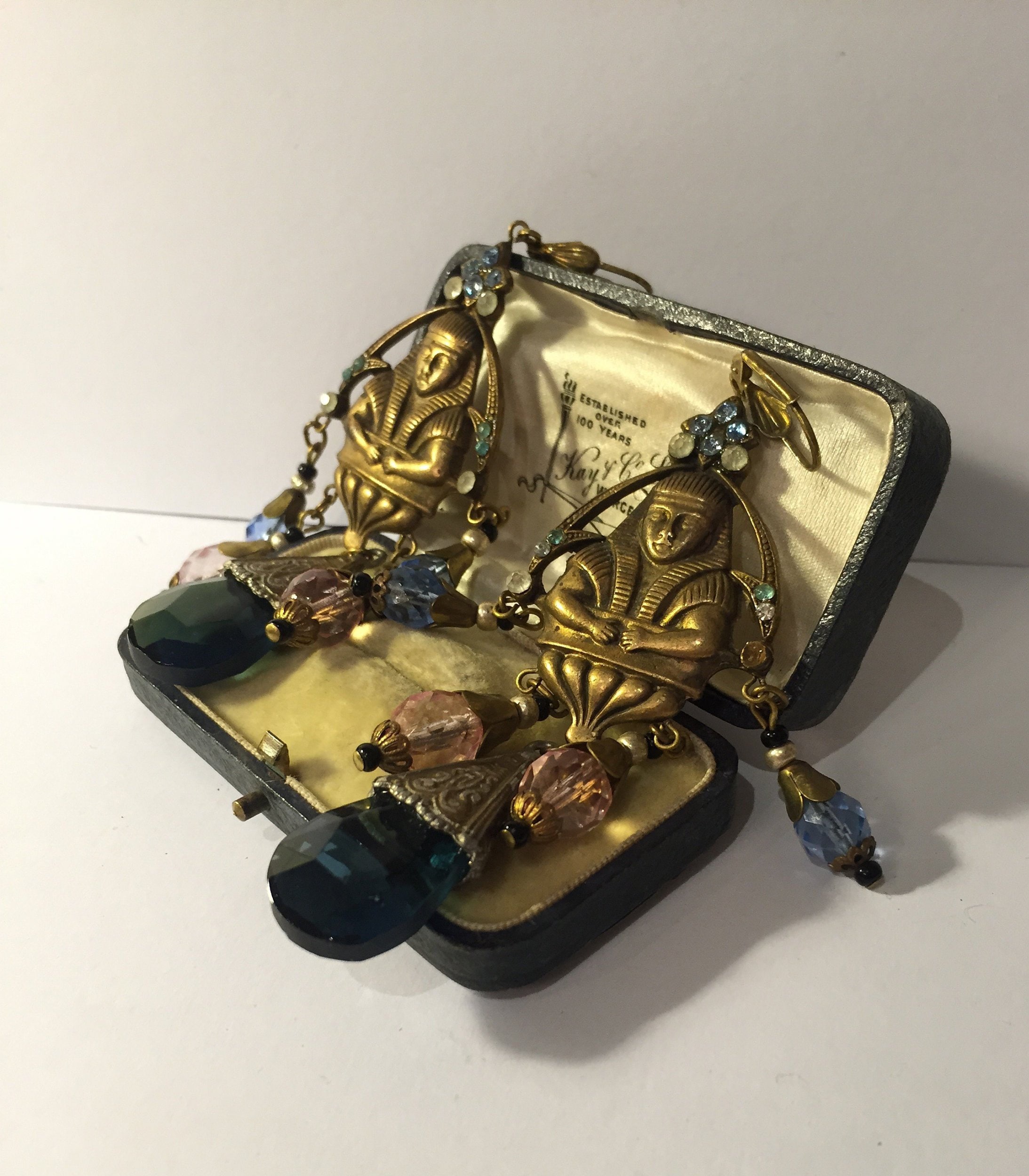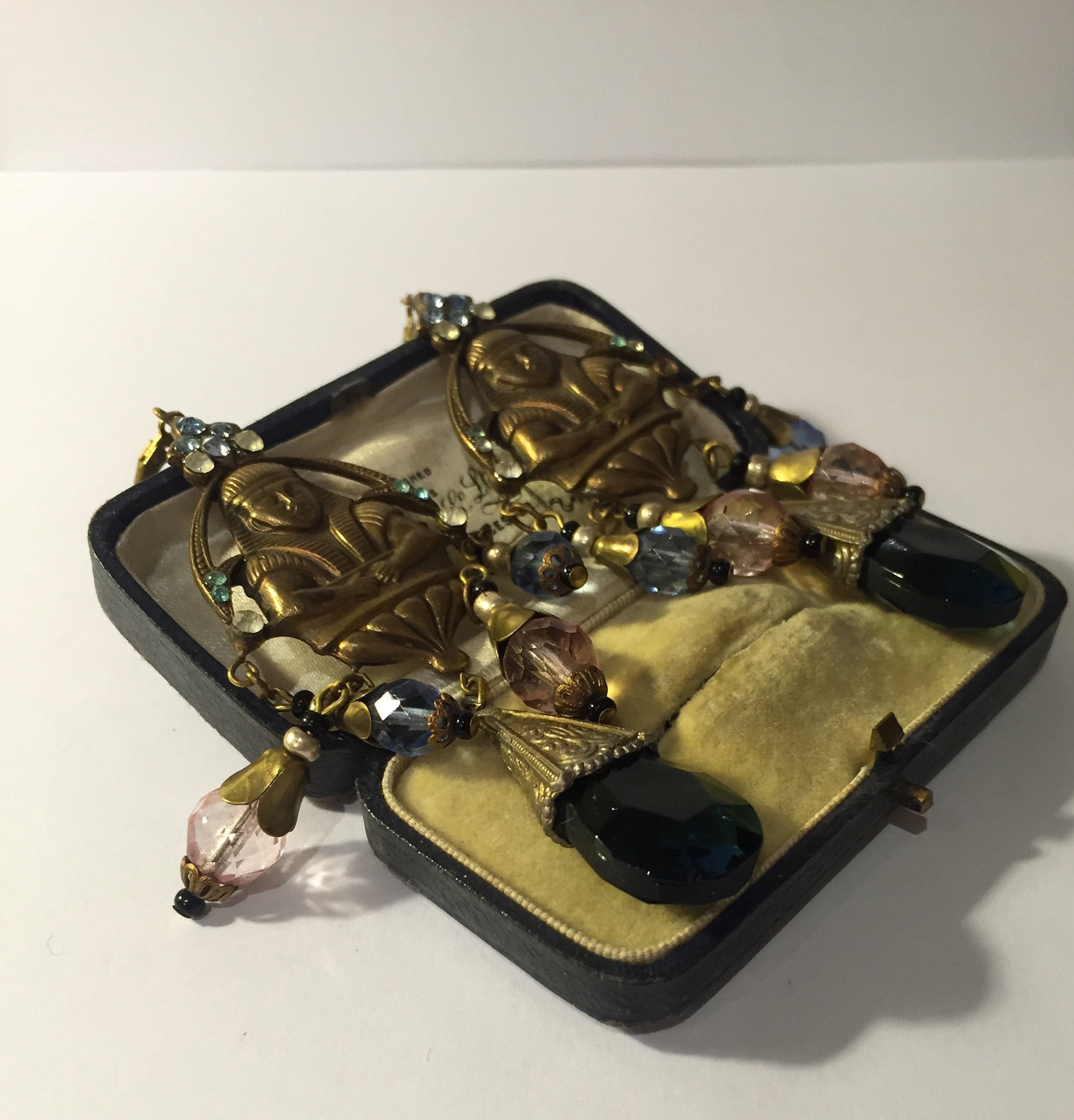 An exquisite pair of Vintage gold Egyptian earrings with divine craftsmanship set with Rhinestone detail and fantastic Czech glass beads. The colour and design is breath taking. There is one tiny stone missing on one to right of arm. Very hard to see doesn't detract. They look sublime on. Extremely rare period piece.