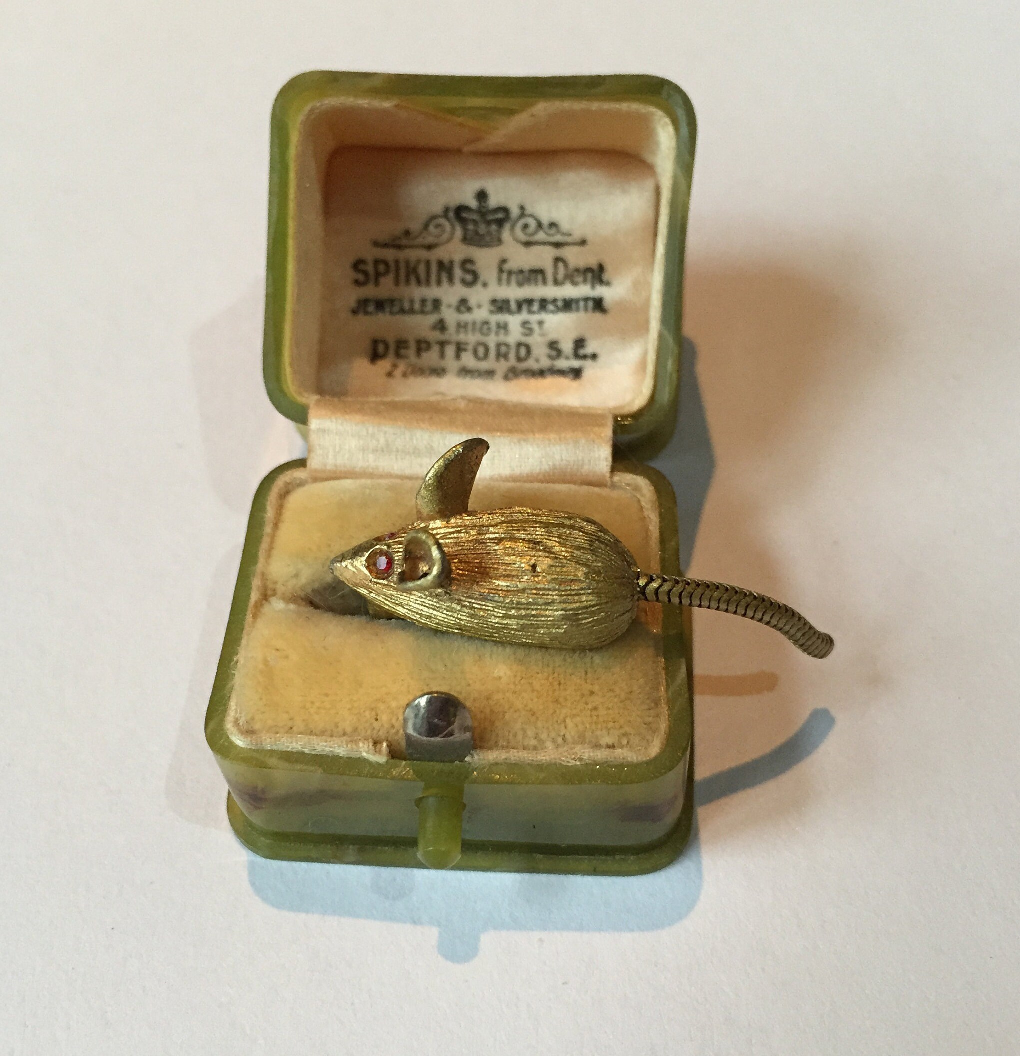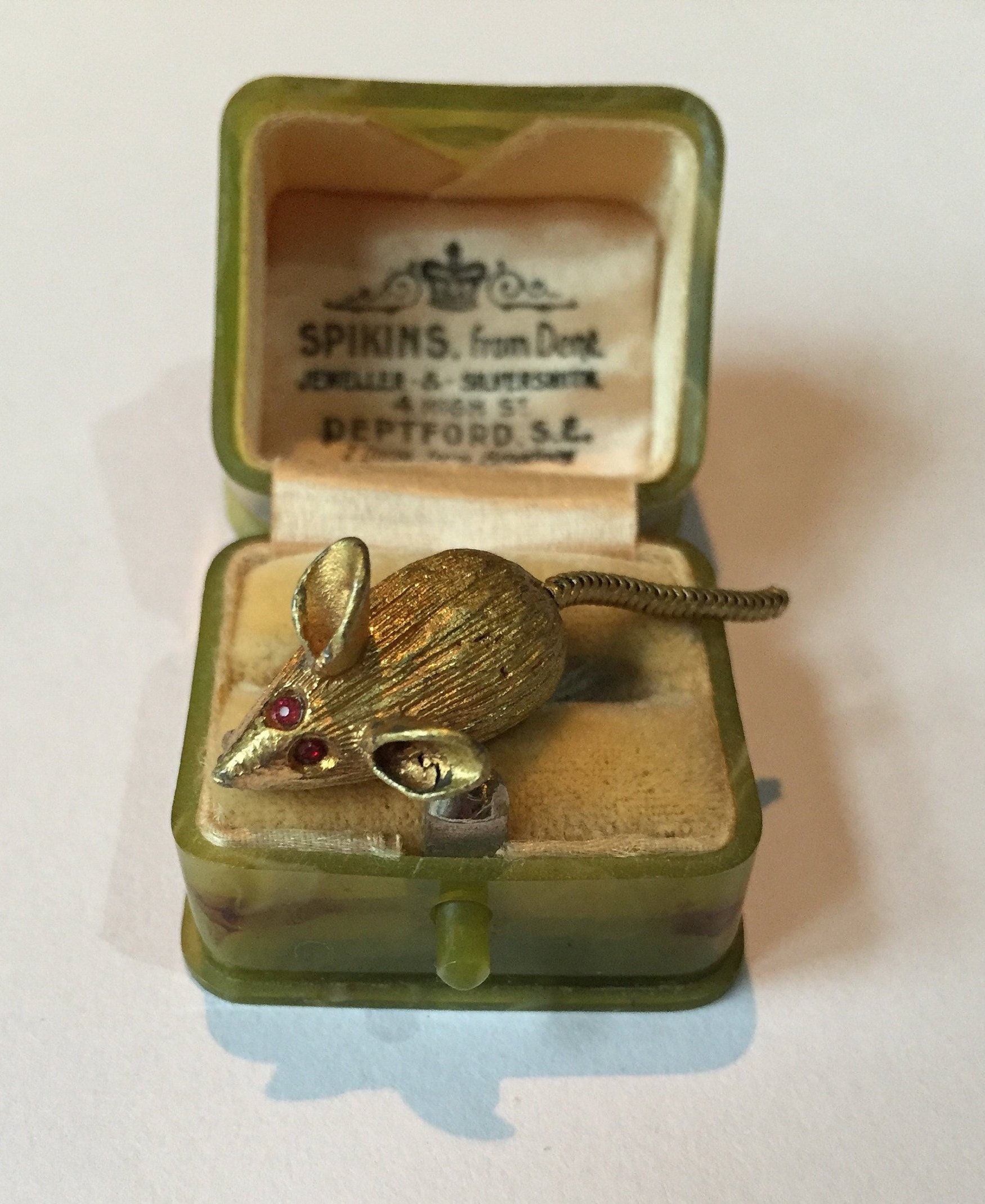 A Charming vintage gold Mouse brooch with moving tail and fantastic rhinestone cute eyes. Exquisite design and quality, love this item very unusual fun item. Very rare and unusual.