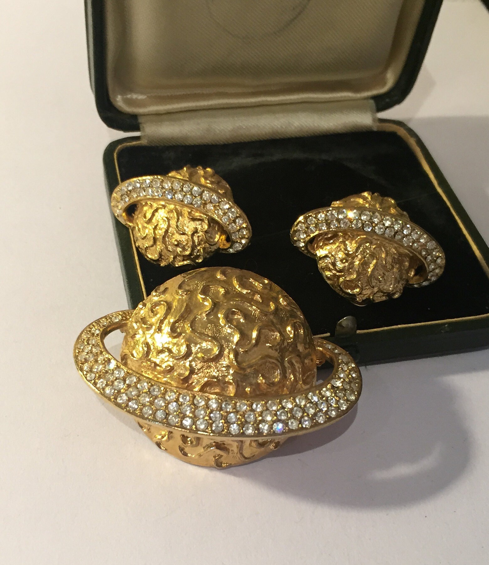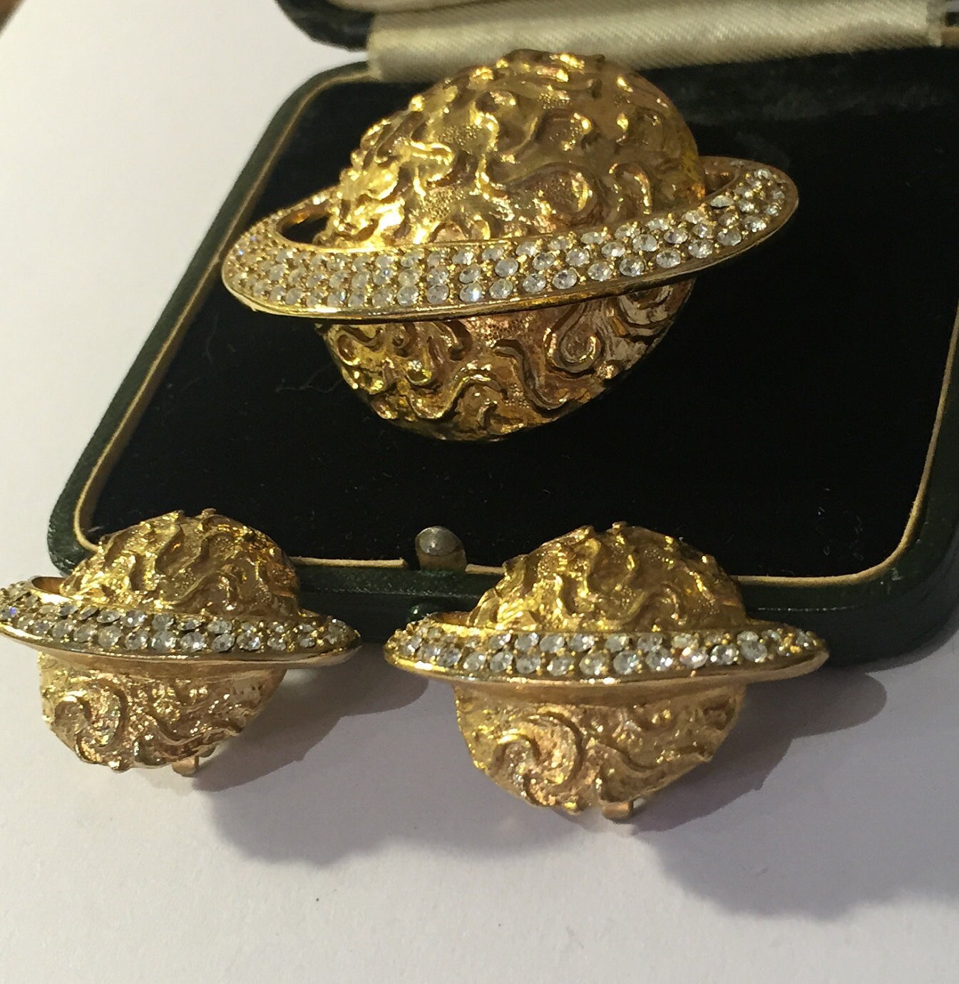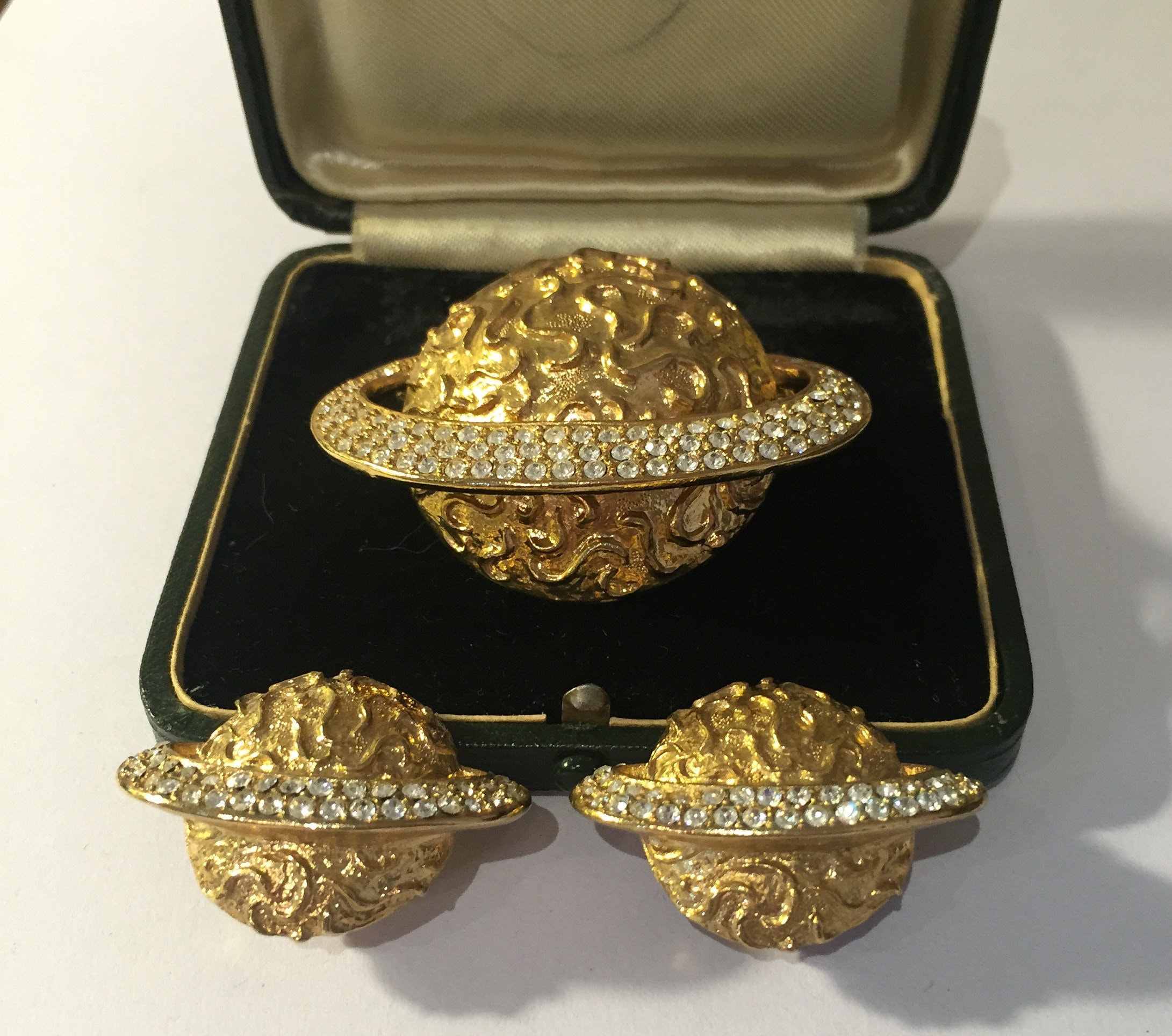 A fantastic Astrological set Depicting Saturn consisting of delightful Earrings and Brooch set with exquisite Rhinestones detail. Beautiful craftsmanship. Divine quality and design. Extremely rare never seen before. They look wonderful on.