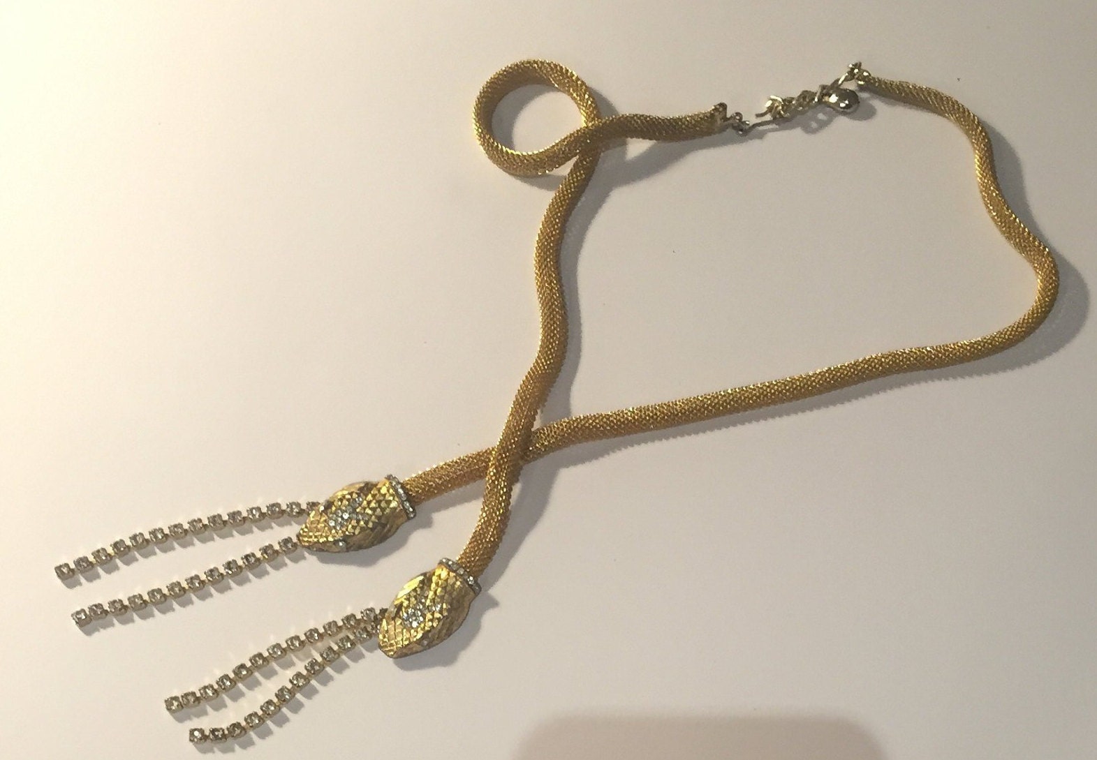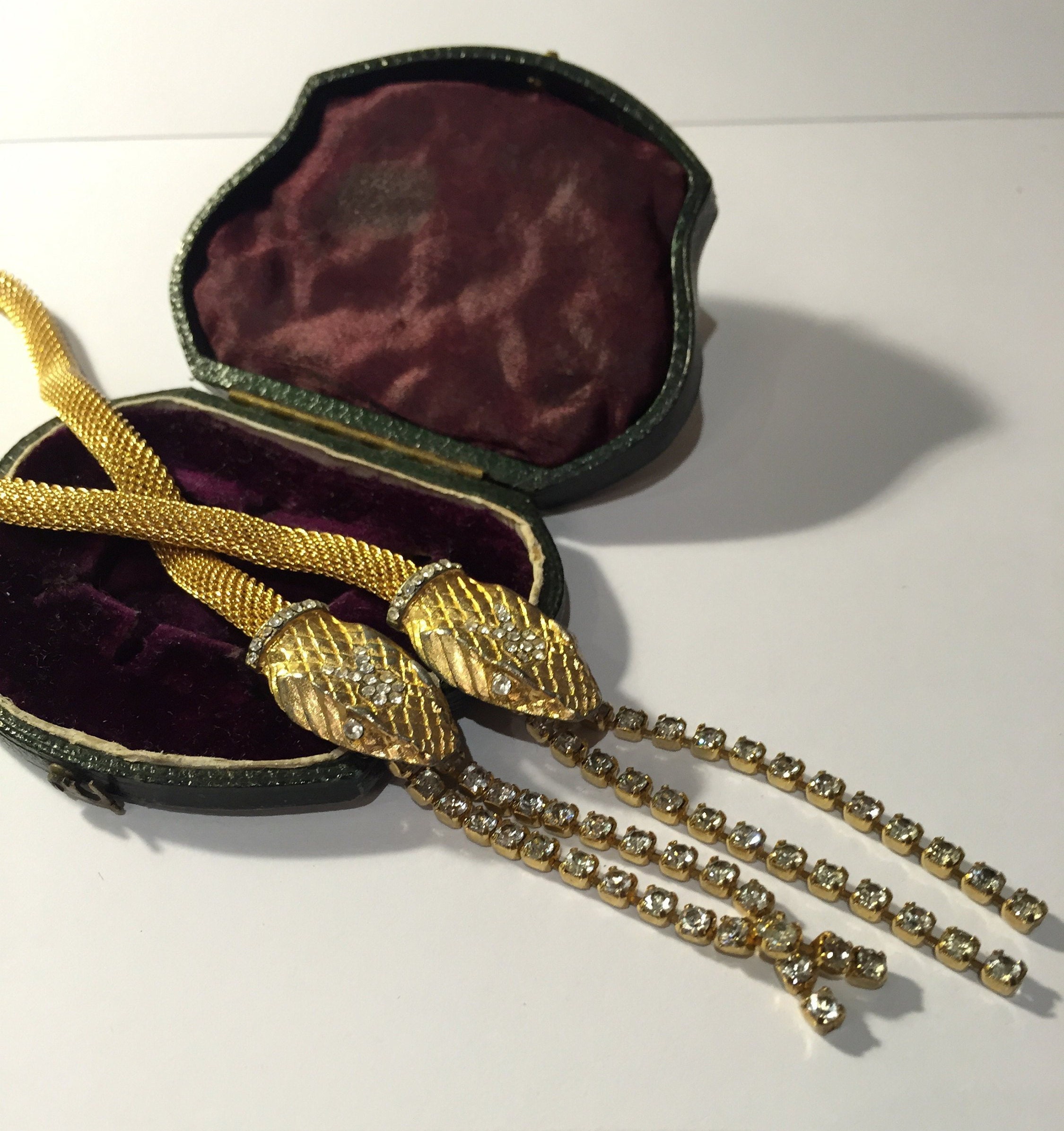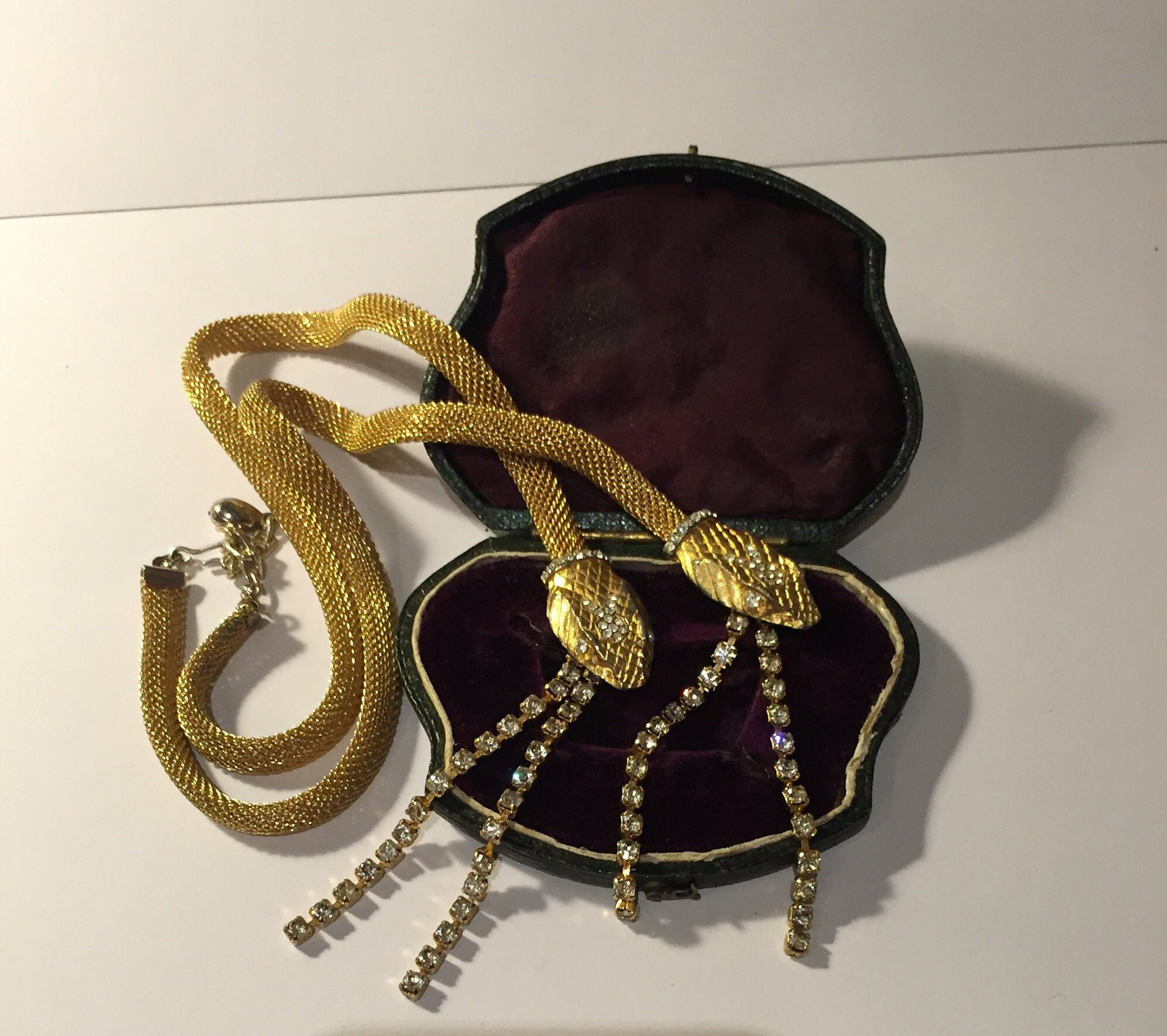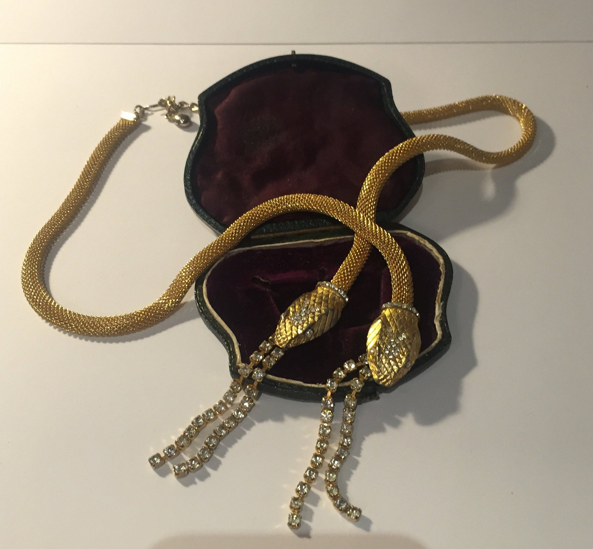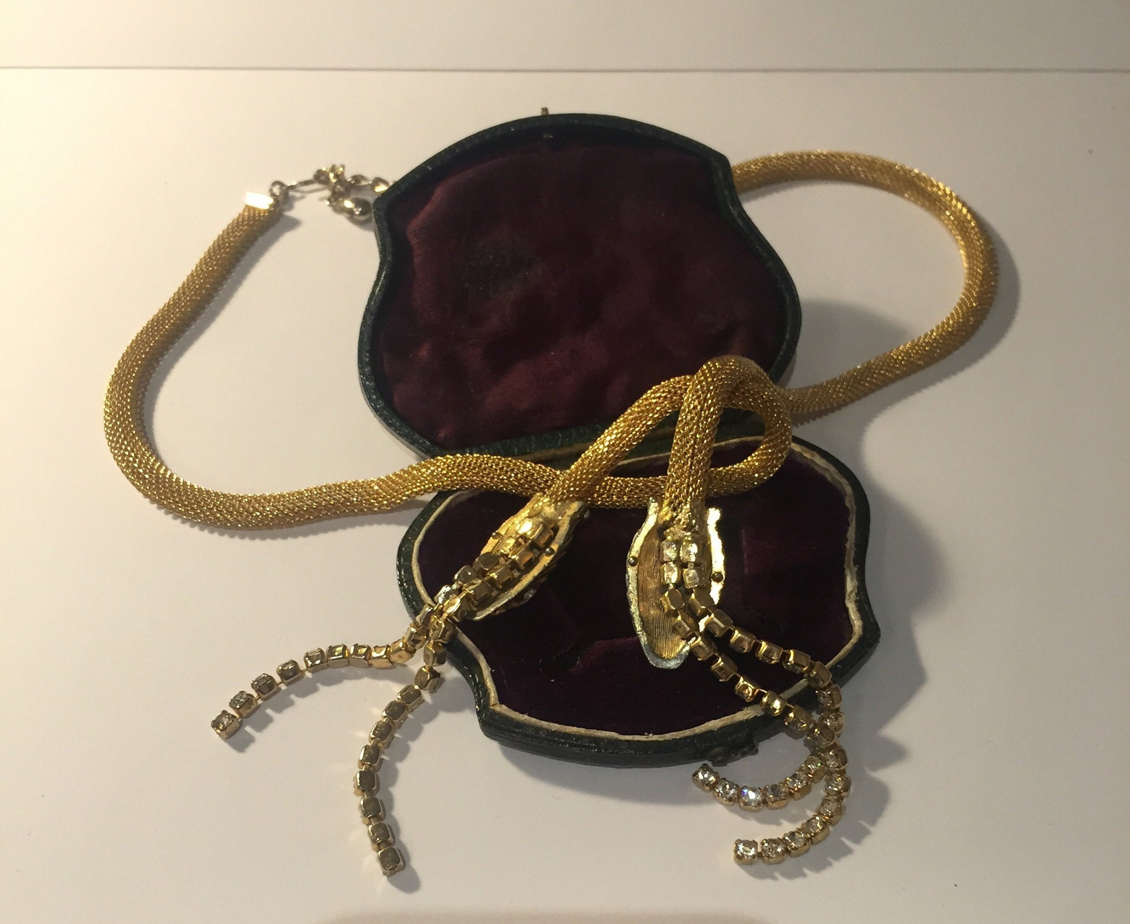 Vintage Gold Snake necklace with beautiful movement, set with exquisite Rhinestones. Divine quality and the design is sublime. Hangs beautifully. Fantastic piece. Slight Gold rubbing to snake heads and few tiny stones missing very hard to see, doesn't detract. Extremely rare. So hard to source good quality ones.
