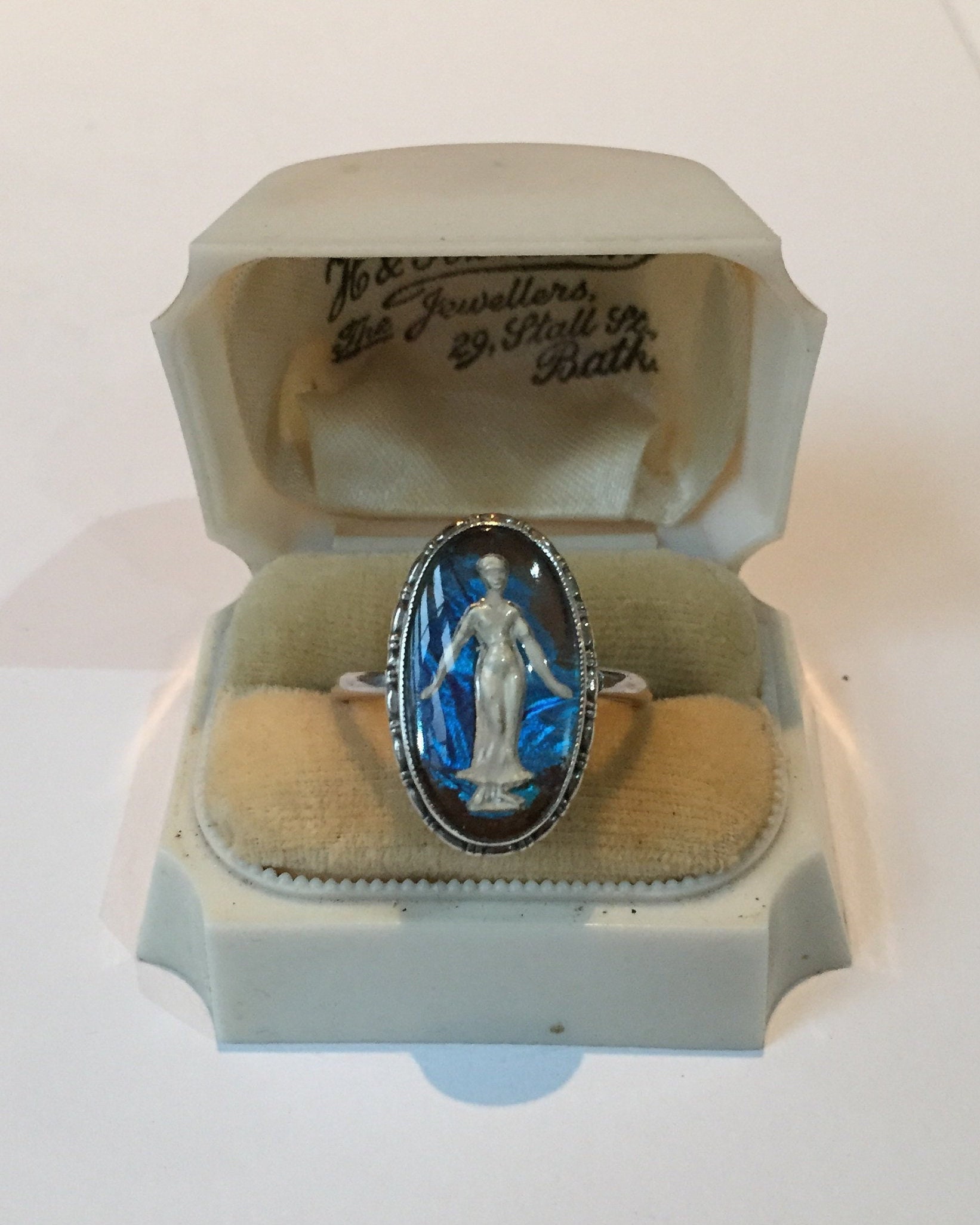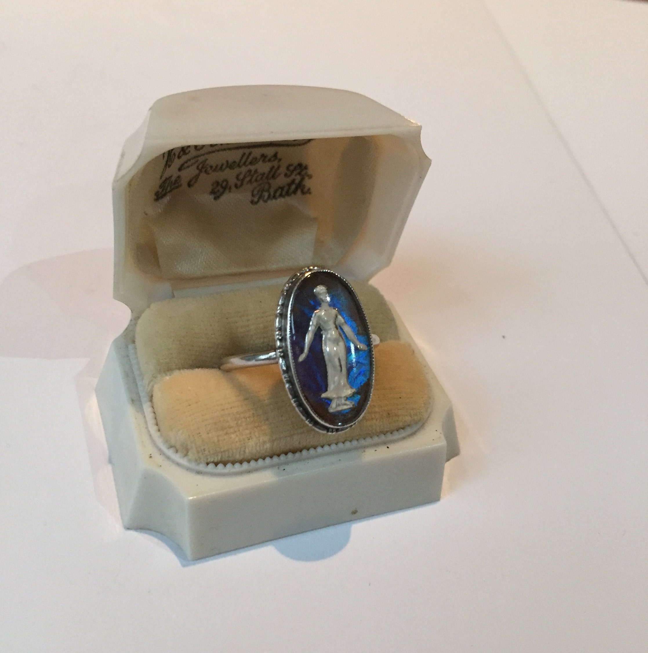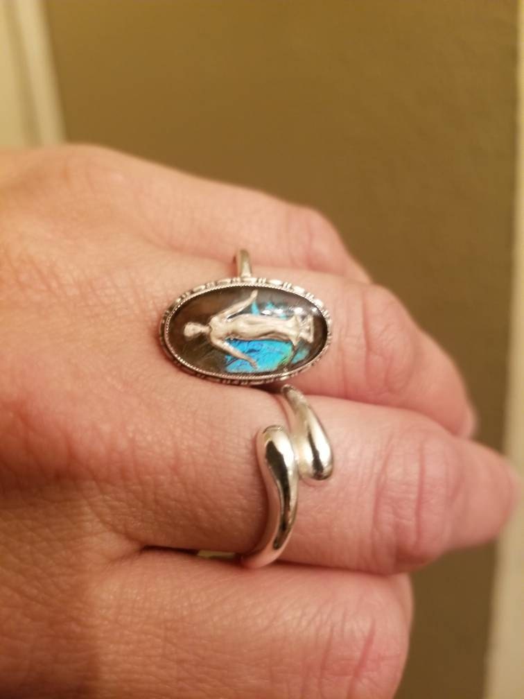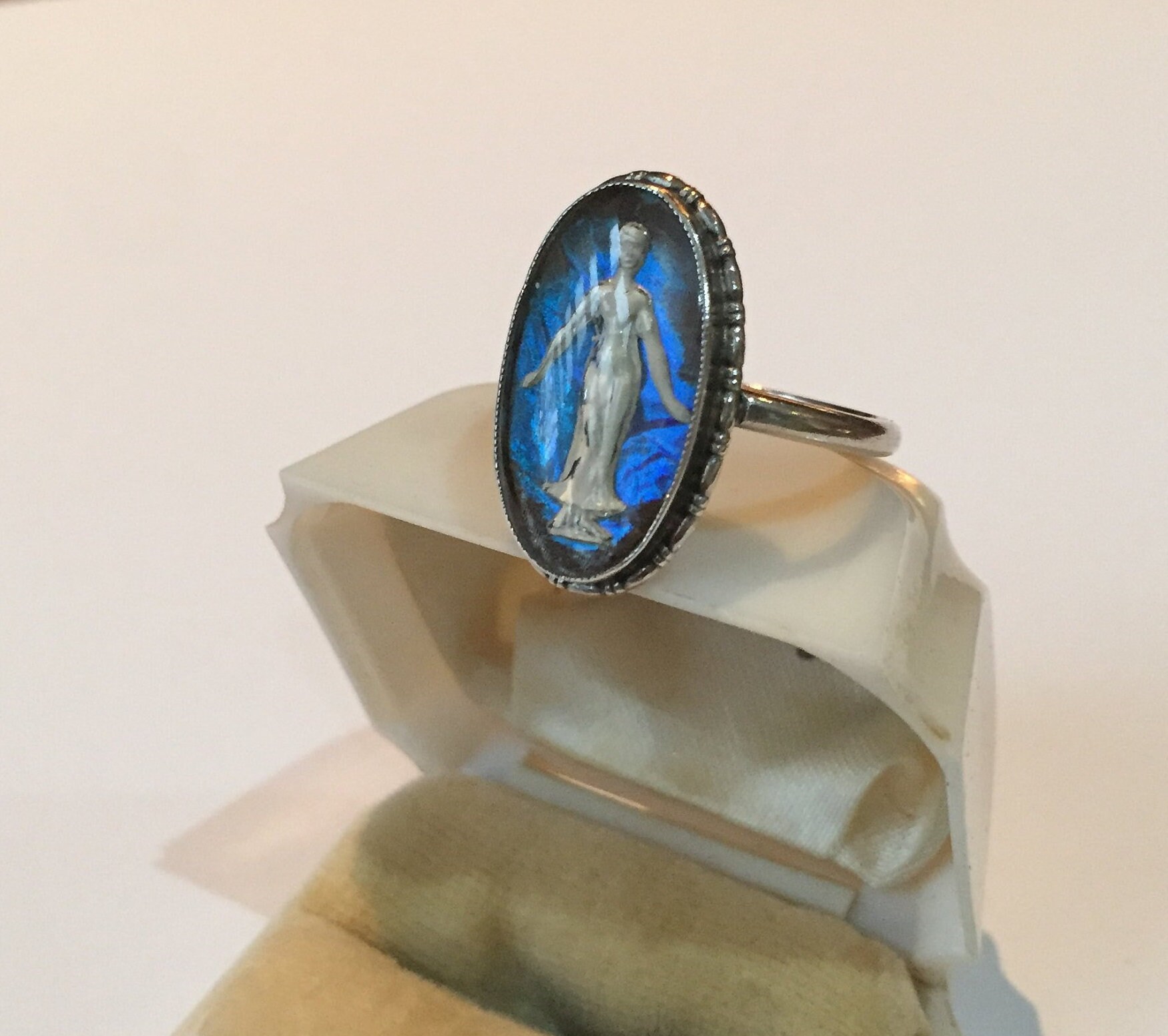 A beautiful Vintage Silver Art Deco Butterfly Wing Ring, divine electric colours with breath taking design of carved enamel lady. Very rare one in a million period piece. Looks wonderful on.