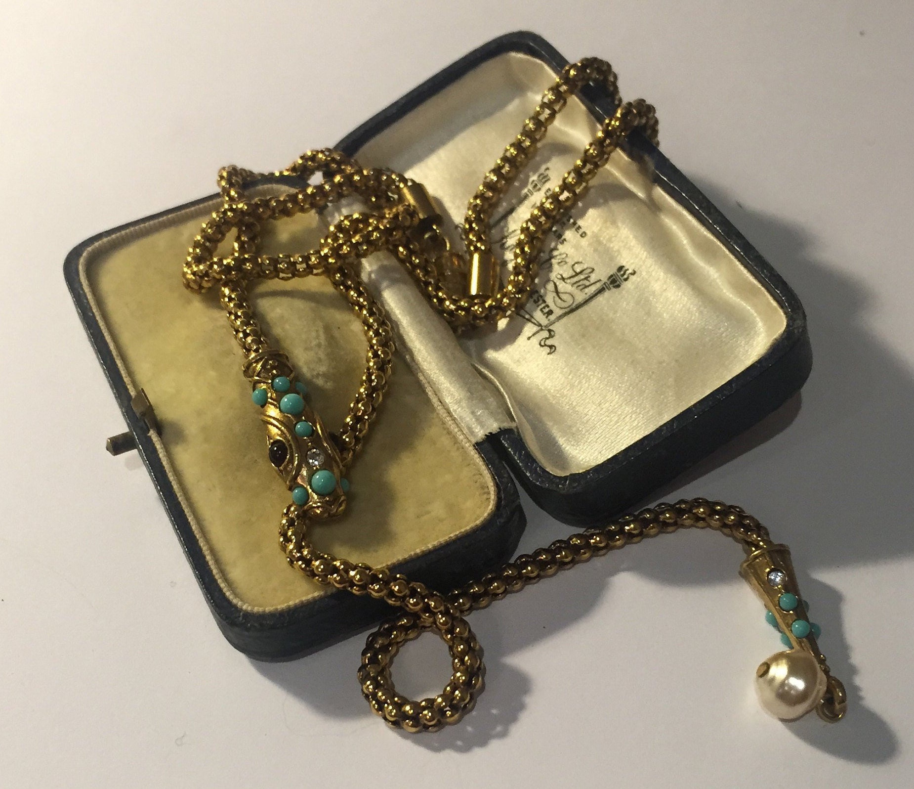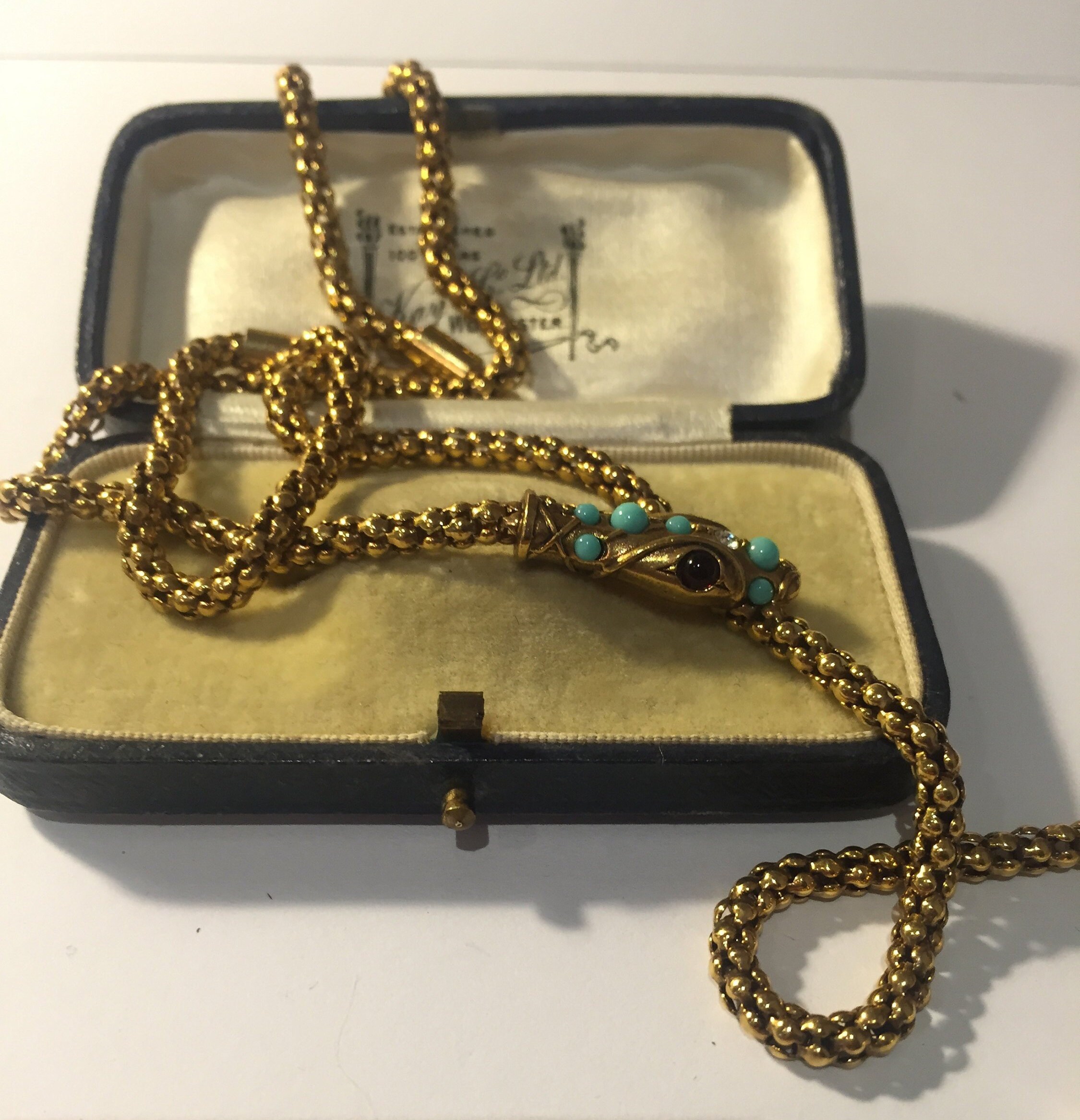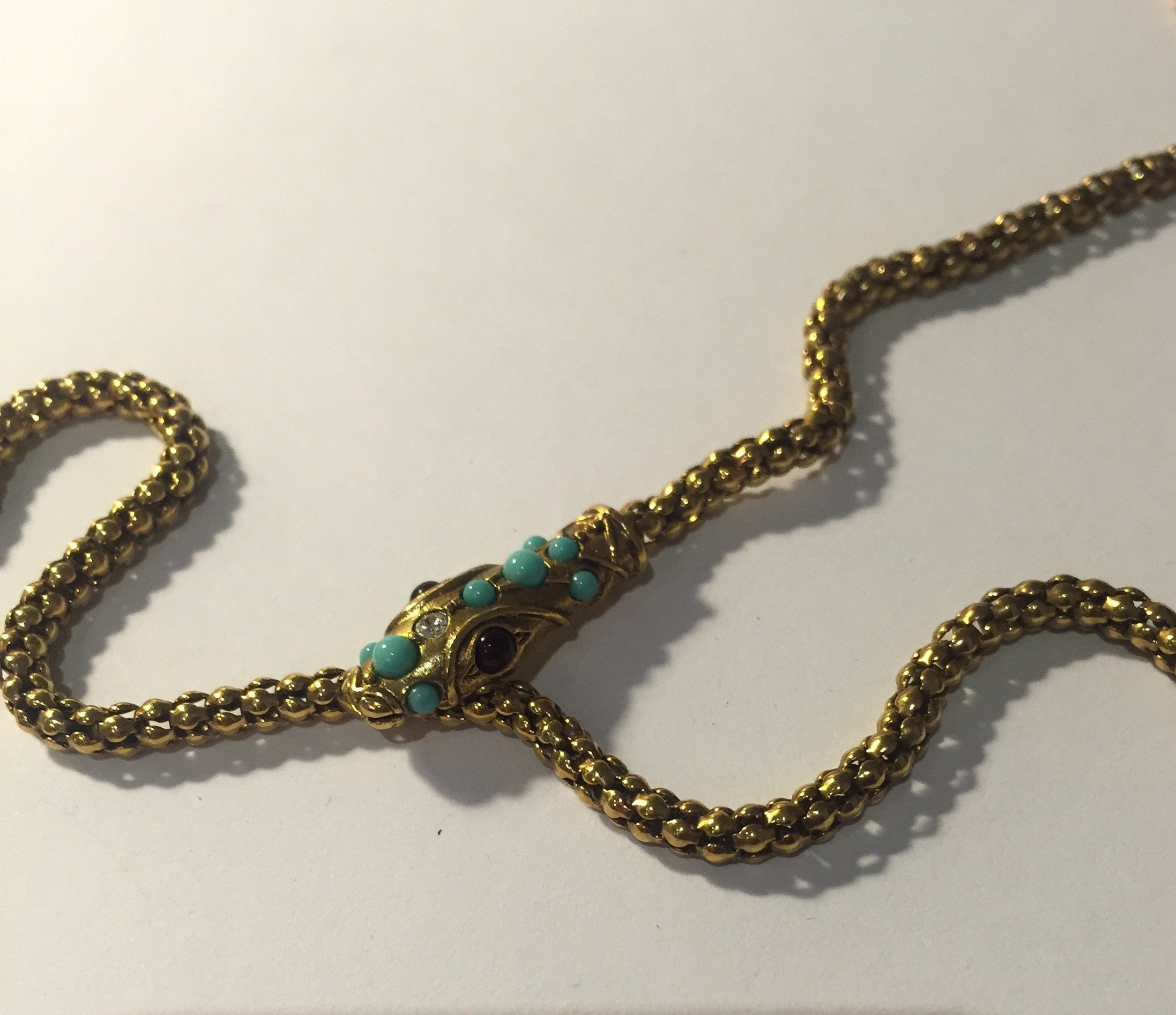 Vintage Gold Snake necklace with beautiful movement, wonderful quality and the design is sublime. Set with exquisite Garnet cabochon eyes,Turquoise stones and striking Rhinestone detail. The face has divine detail. Hangs beautifully. Fantastic piece. Extremely rare.