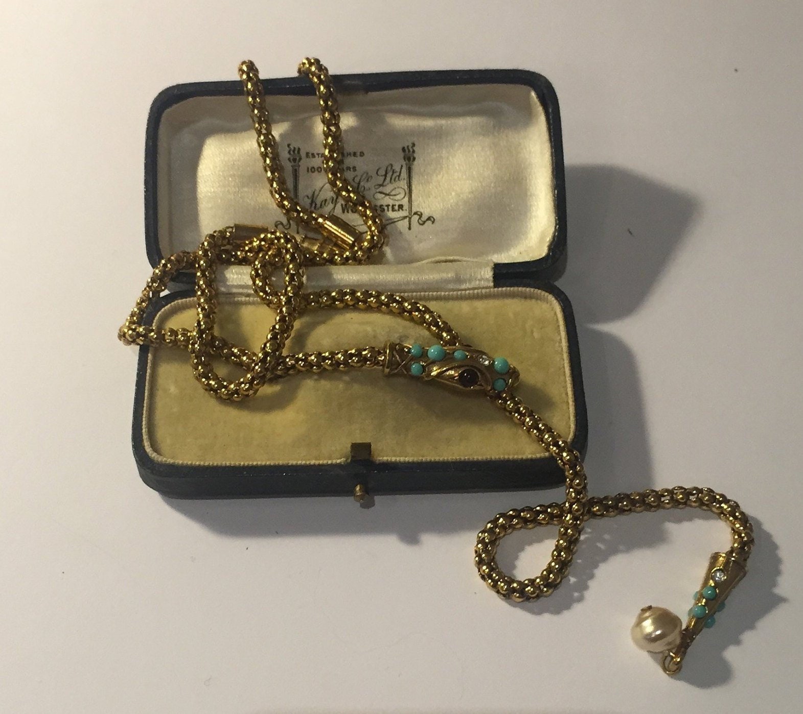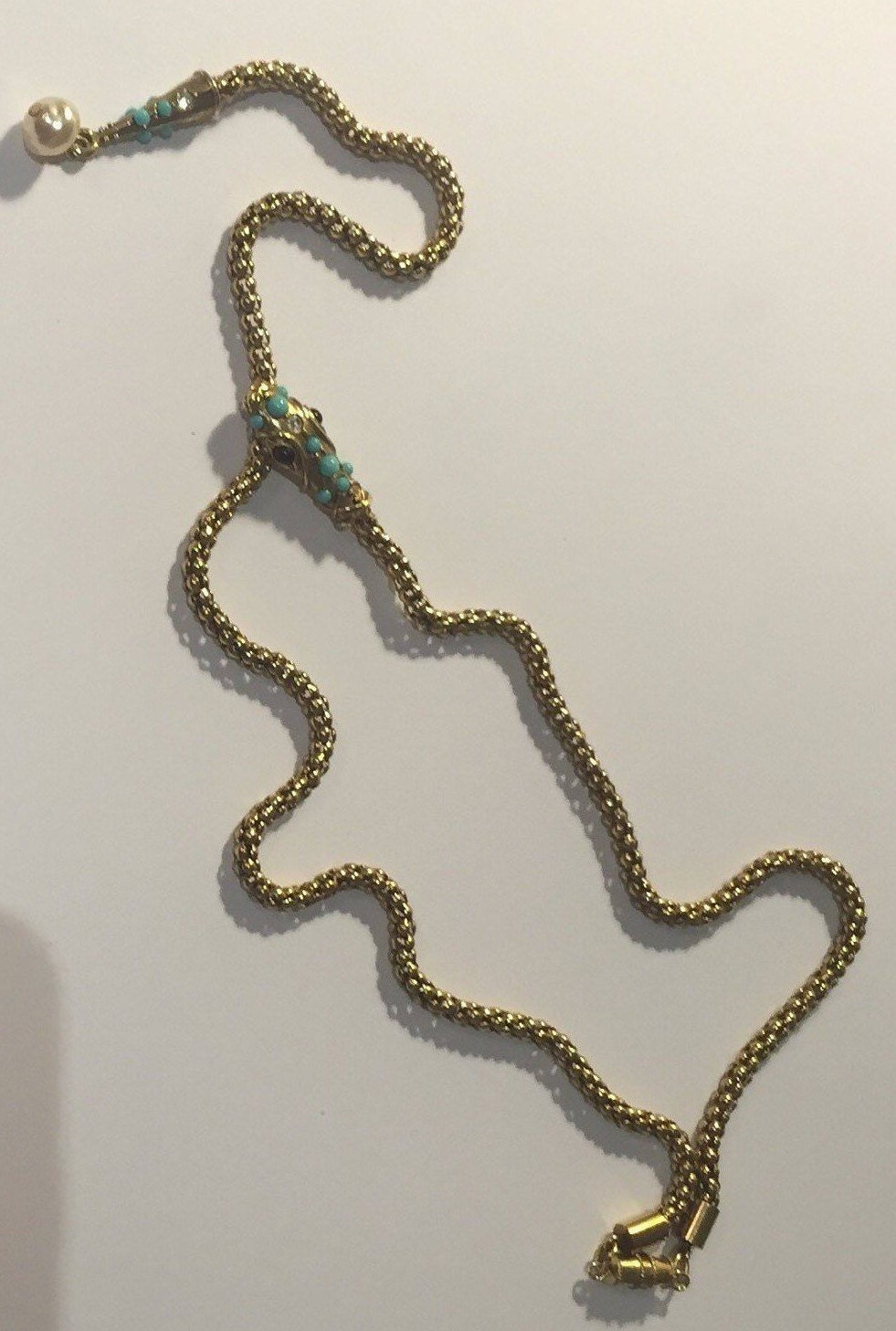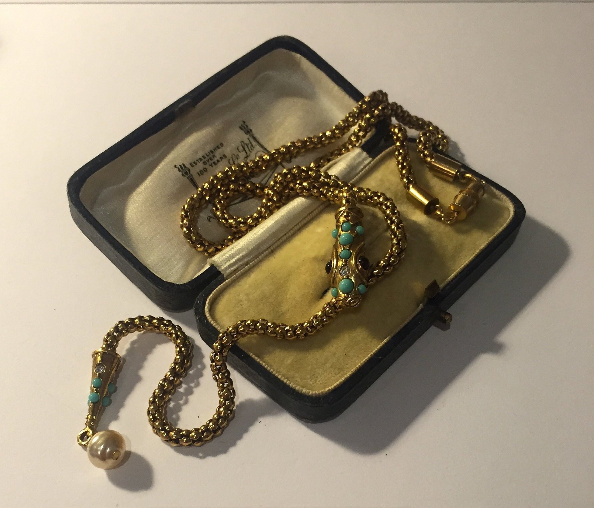Vintage Gold Snake necklace with beautiful movement, wonderful quality and the design is sublime. Set with exquisite Garnet cabochon eyes,Turquoise stones and striking Rhinestone detail. The face has divine detail. Hangs beautifully. Fantastic piece. Extremely rare.