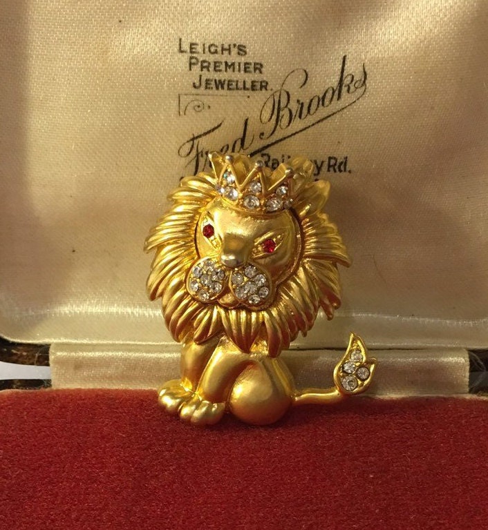 A Charming vintage gold Lion costume brooch wearing a divine regal Crown. Set with exquisite Rhinestones. Fantastic design and quality, the face is wonderful. I really love this item very unusual brooch. Makes me smile every time.