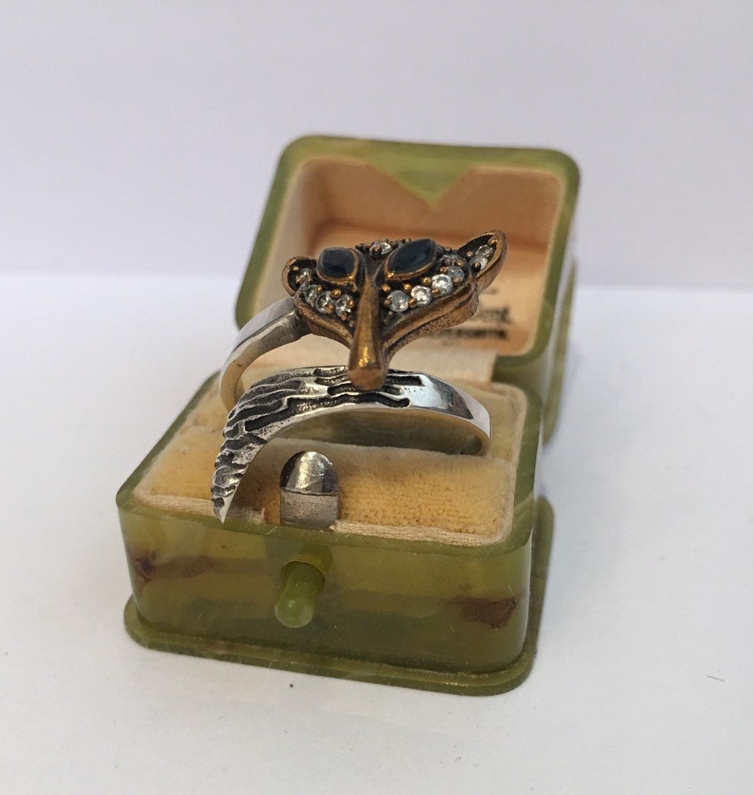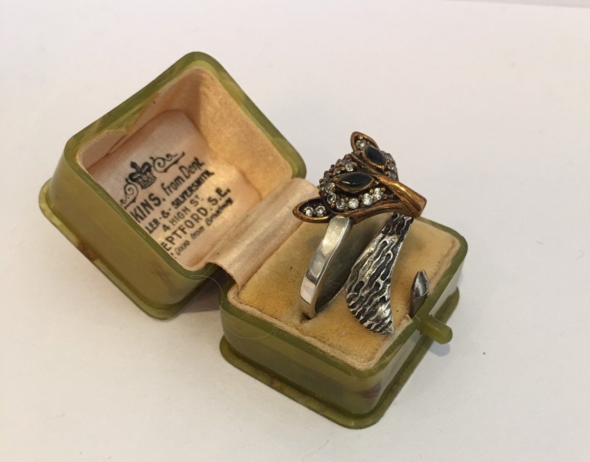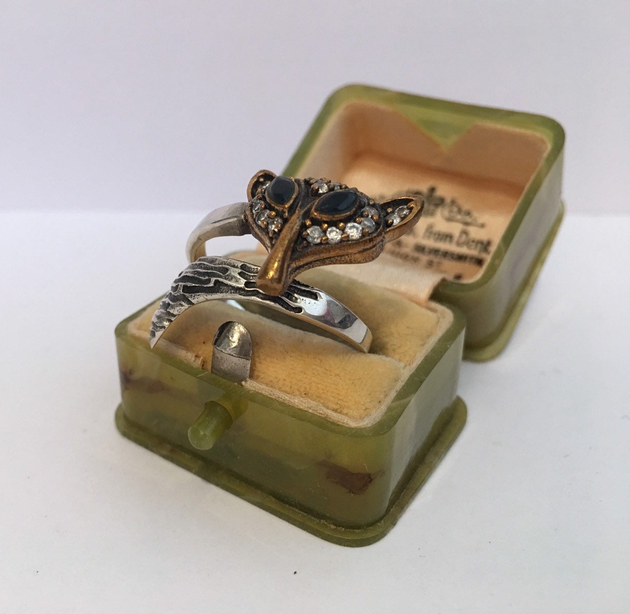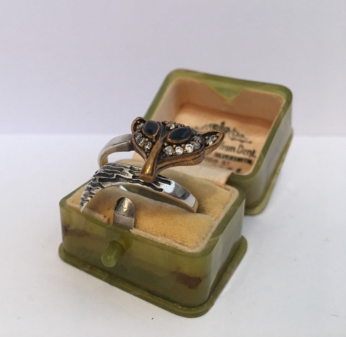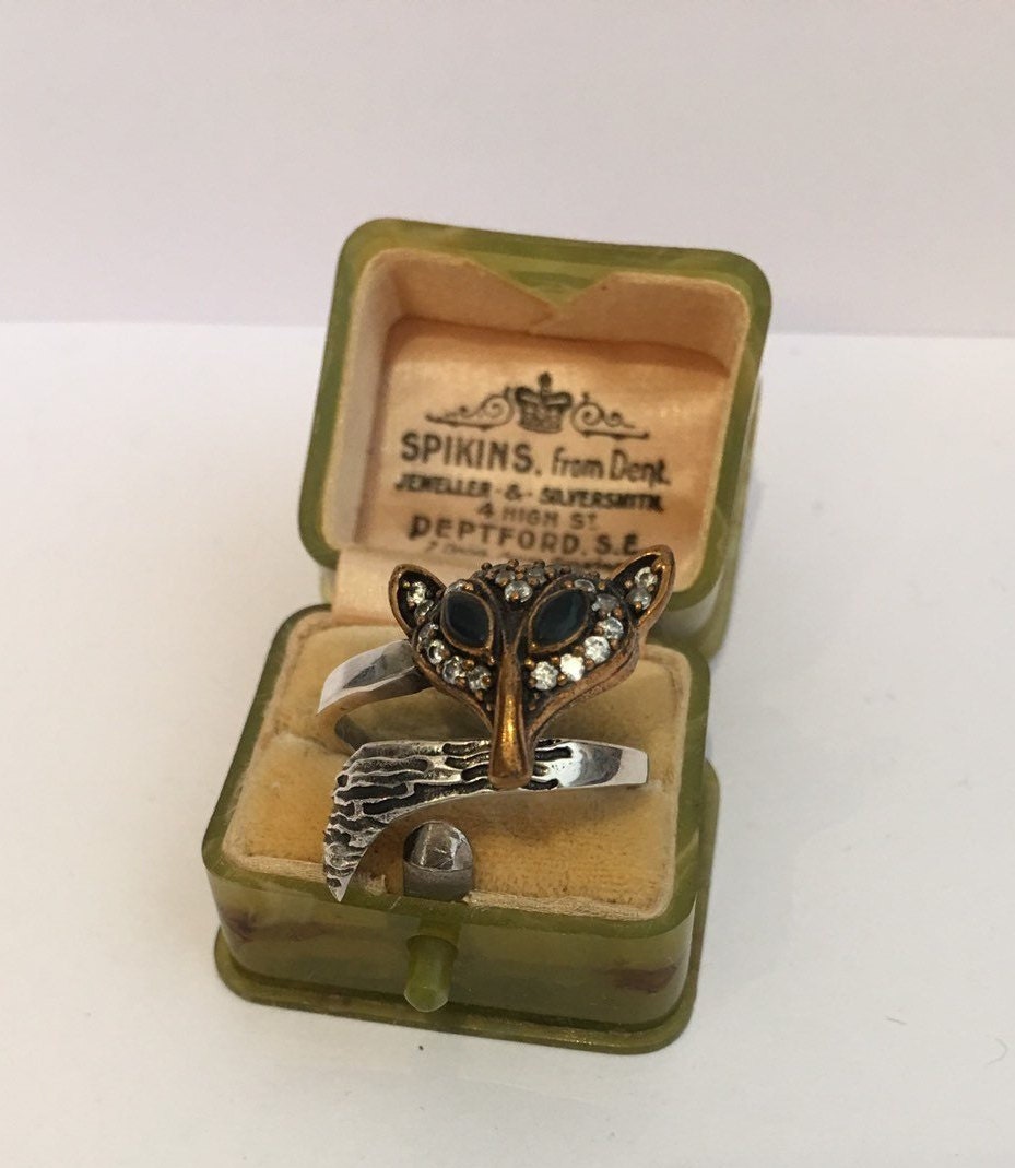 Fantastic Vintage Silver ring of delightful Fox ring with great movement and design. Set with divine Rhinestones, fine gilding and delightful Sapphire coloured eyes. Exquisite detail and craftsmanship. I have never seen before very rare one in a million piece.