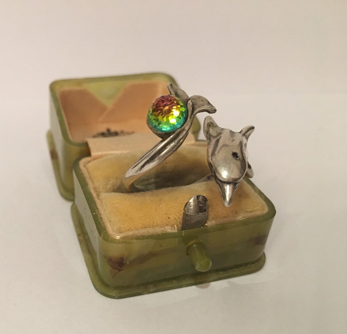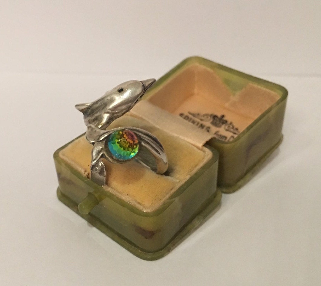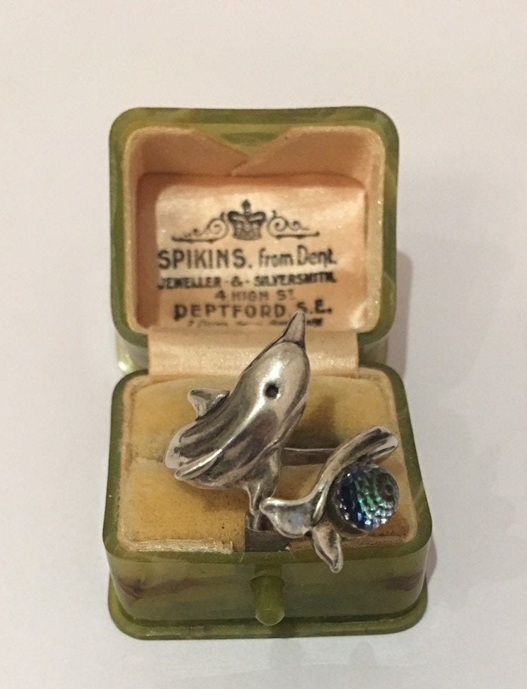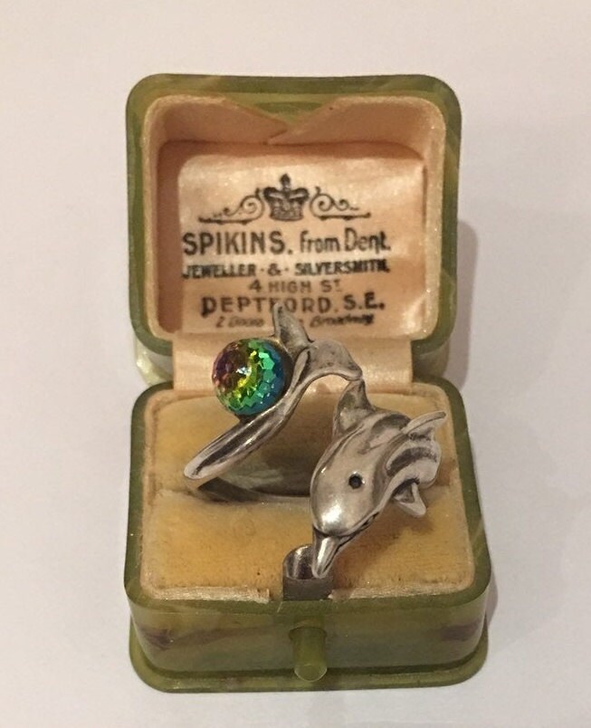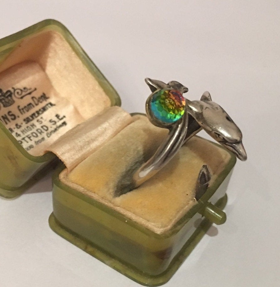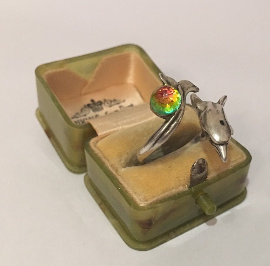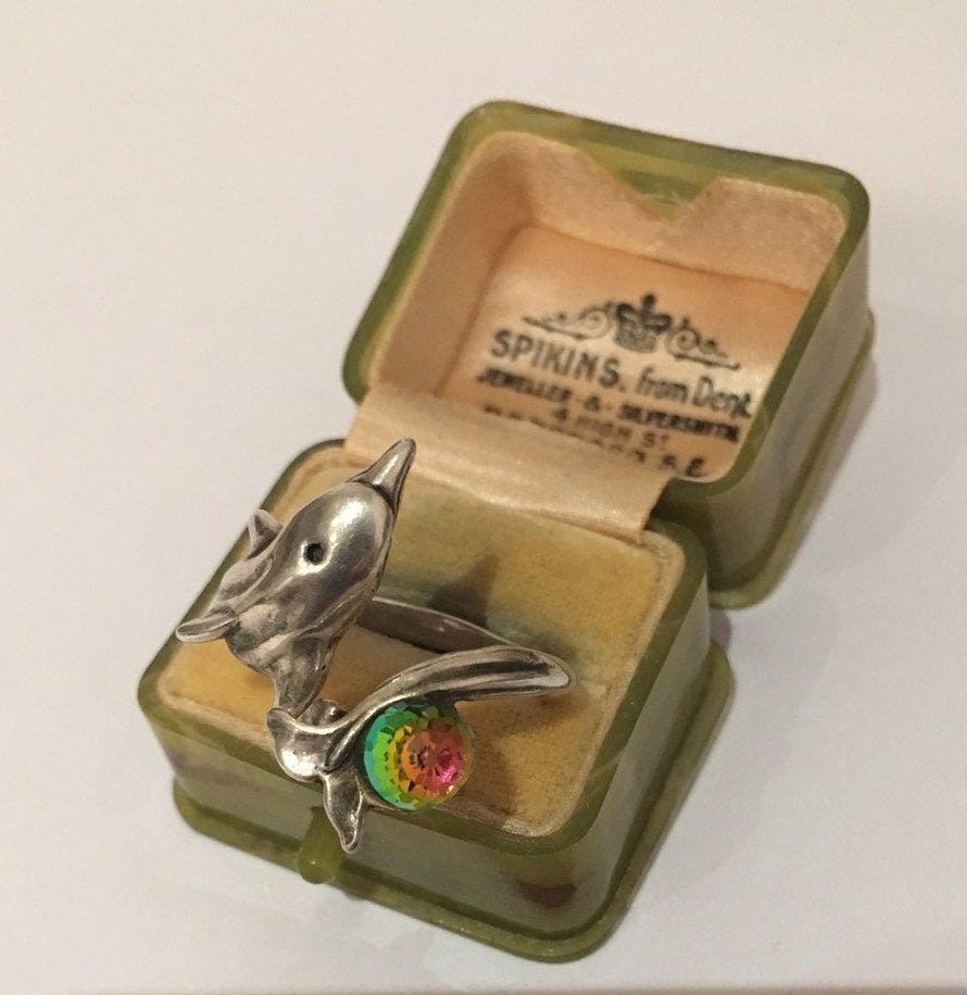 A fantastic Vintage sterling Silver ring of Dolphin, divine quality and great design. Set with a wonderful rainbow crystal ball. The movement is excellent and the detail is amazing. Extremely rare I have never seen before.