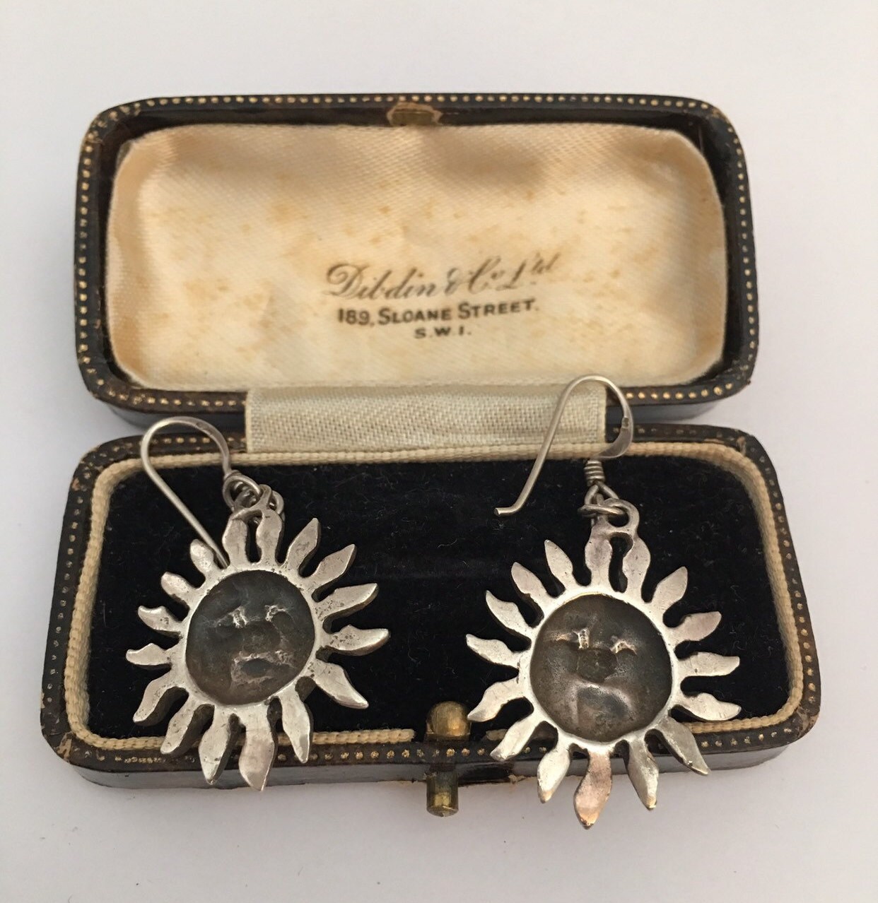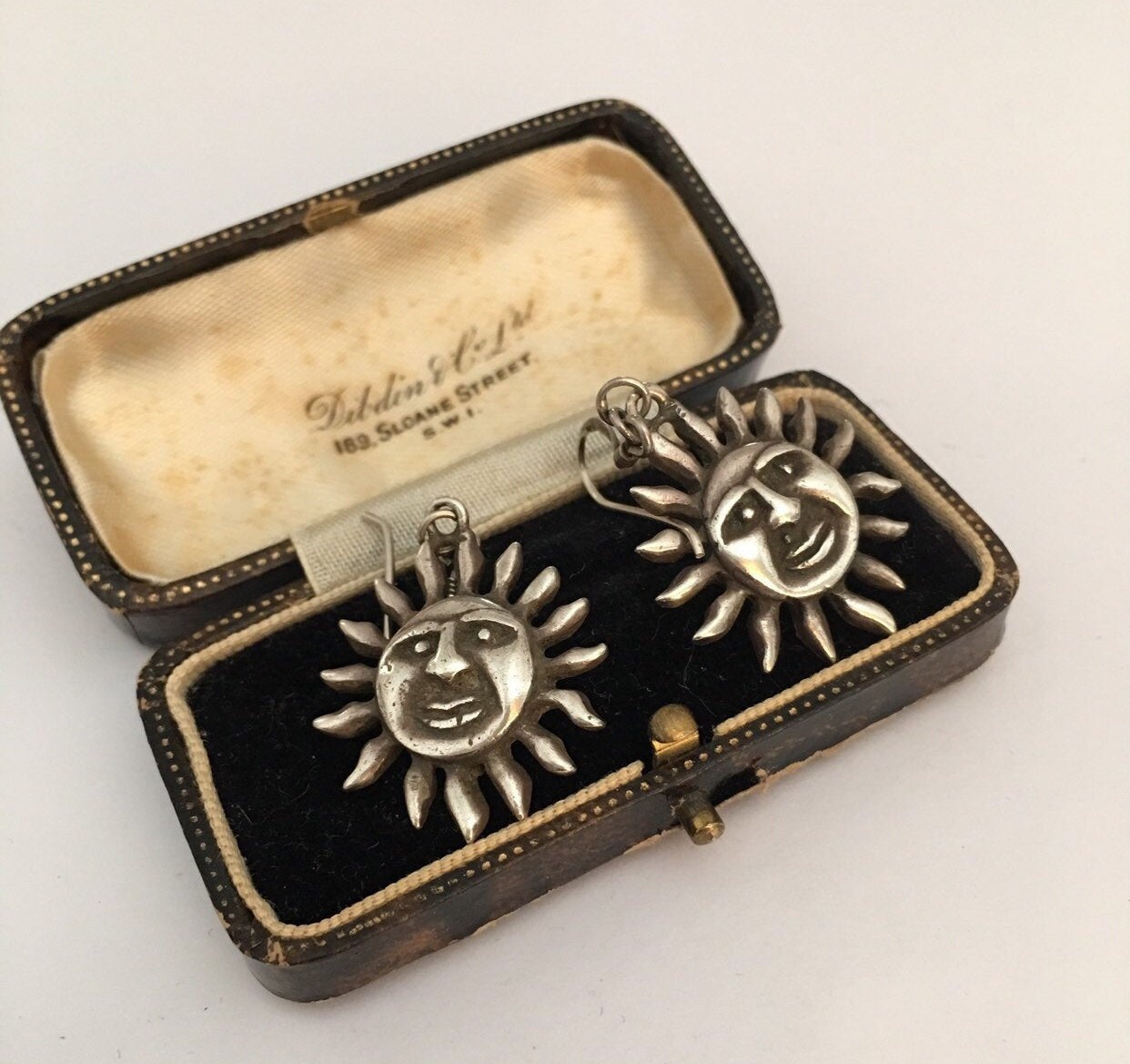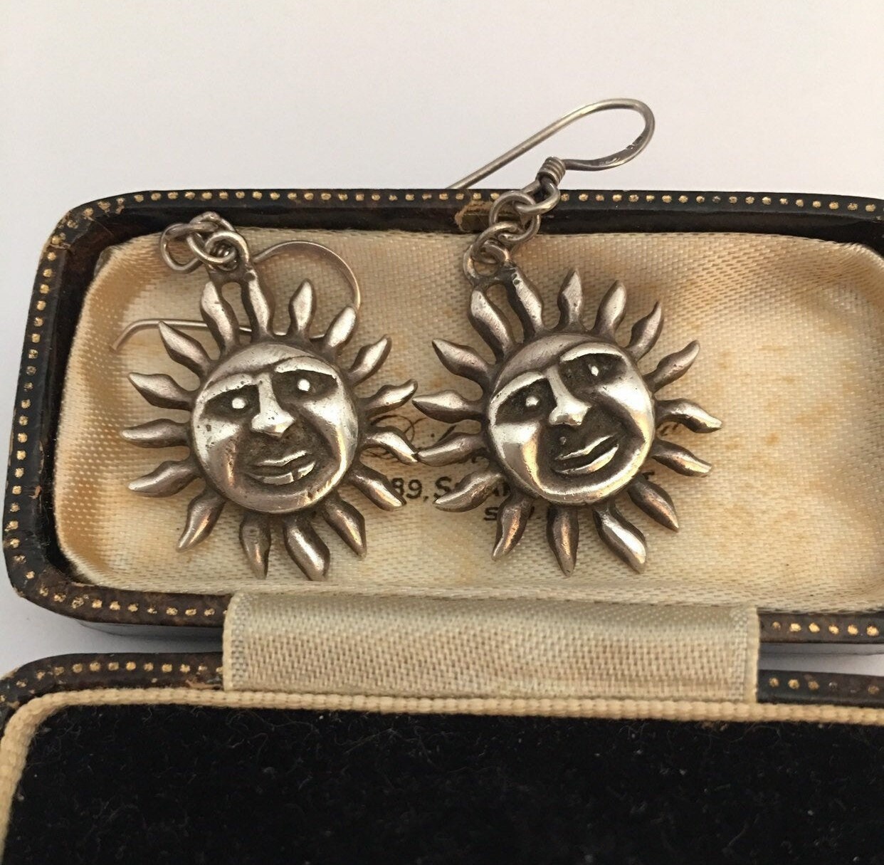 Vintage Sun Earrings, Silver Sun Earrings, Sun Jewellery, sterling silver, divine smiling face.