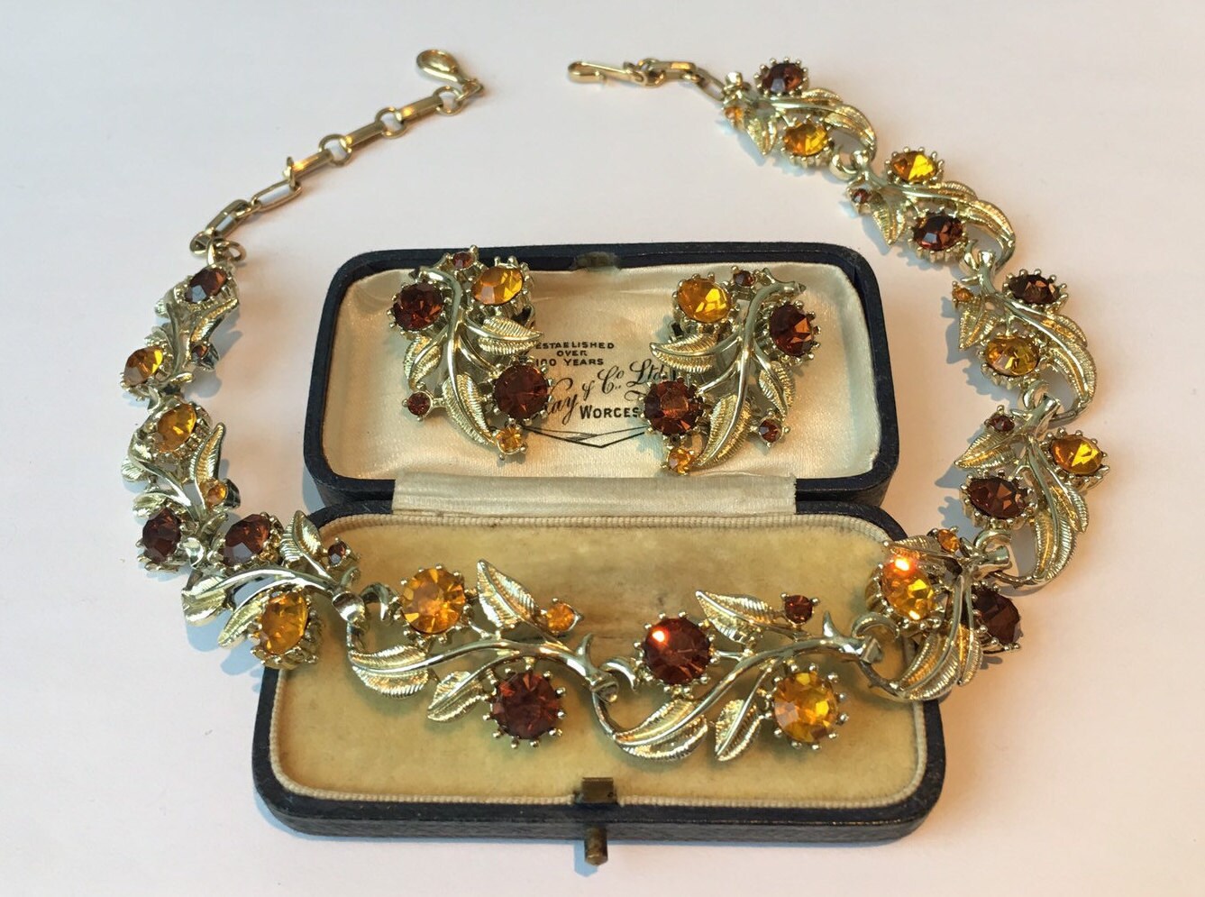 Vintage Gold Costume Necklace and Earring Set with beautiful Autumnal leaf design. By the famous designer Coro. Exquisite quality set with striking honey colour Rhinestones. Fantastic rare statement set. Looks wonderful on.