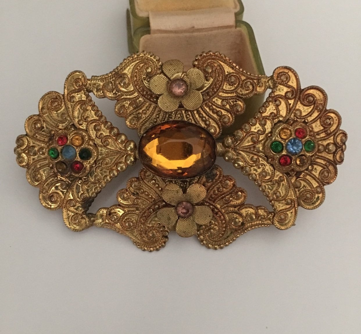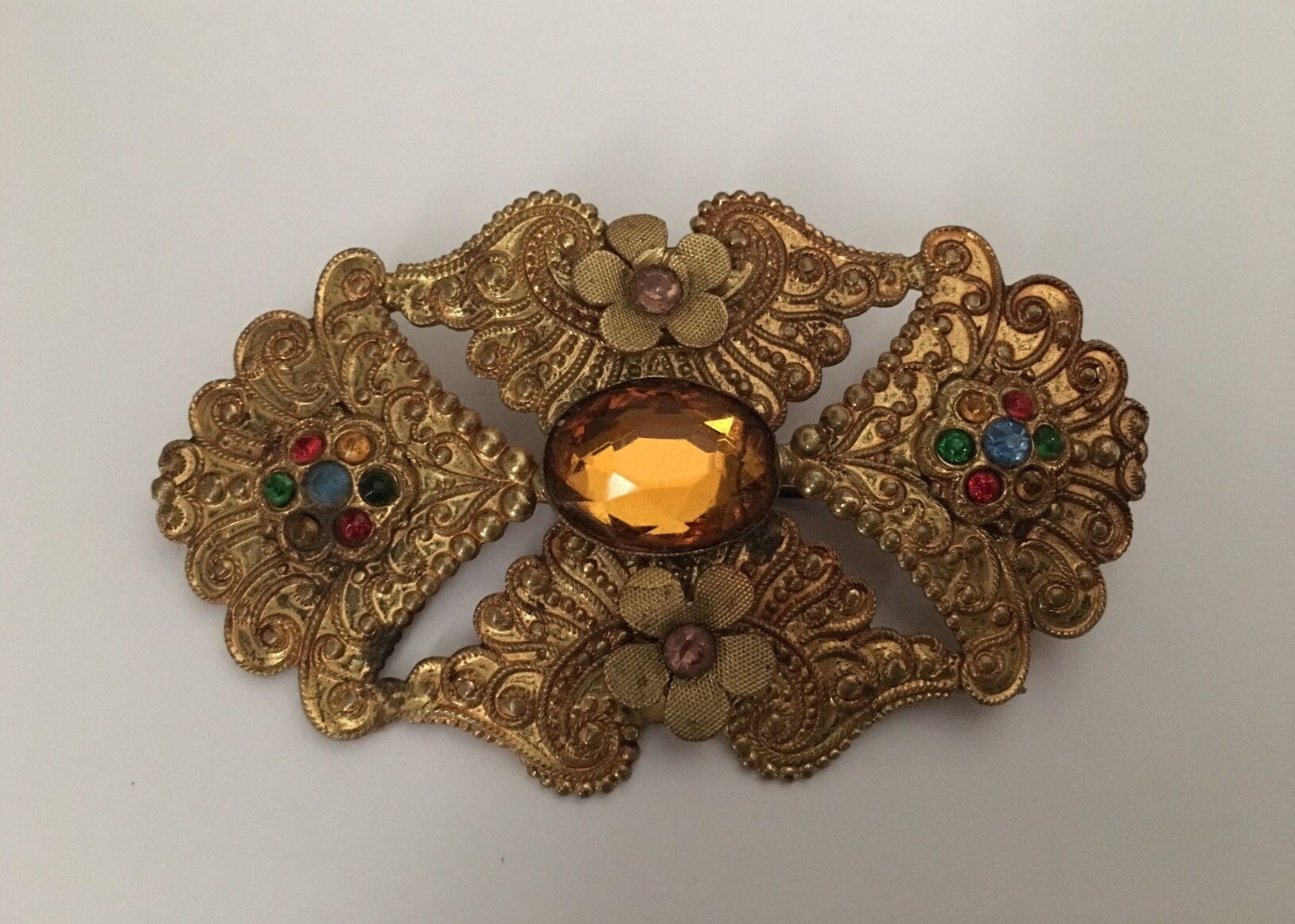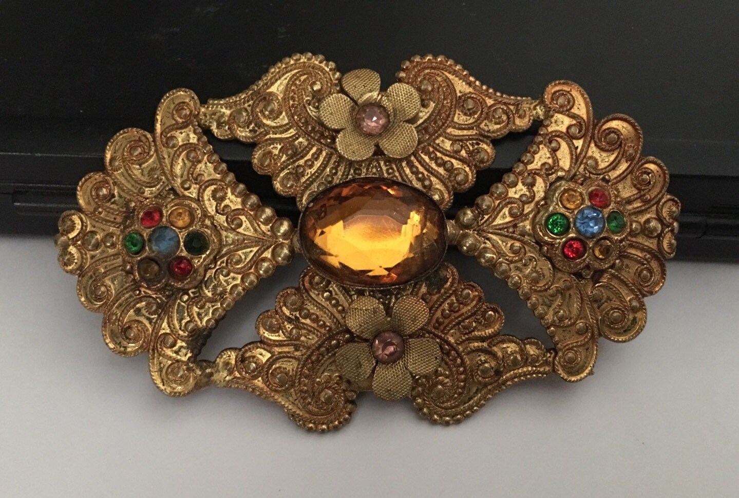 Fantastic Vintage Czech Renaissance style brooch with beautiful quality and highly detailed pressed metal flower design that is adorned with faceted amber and multi coloured Czech glass stones. The colour is breath taking. Divine craftsmanship it looks fabulous on.