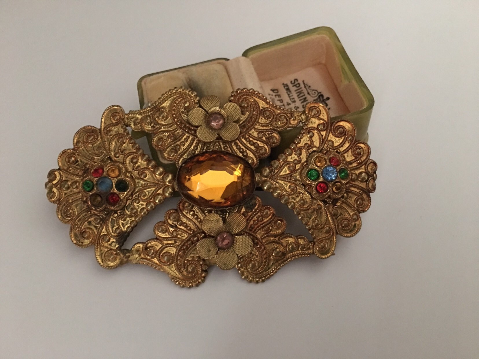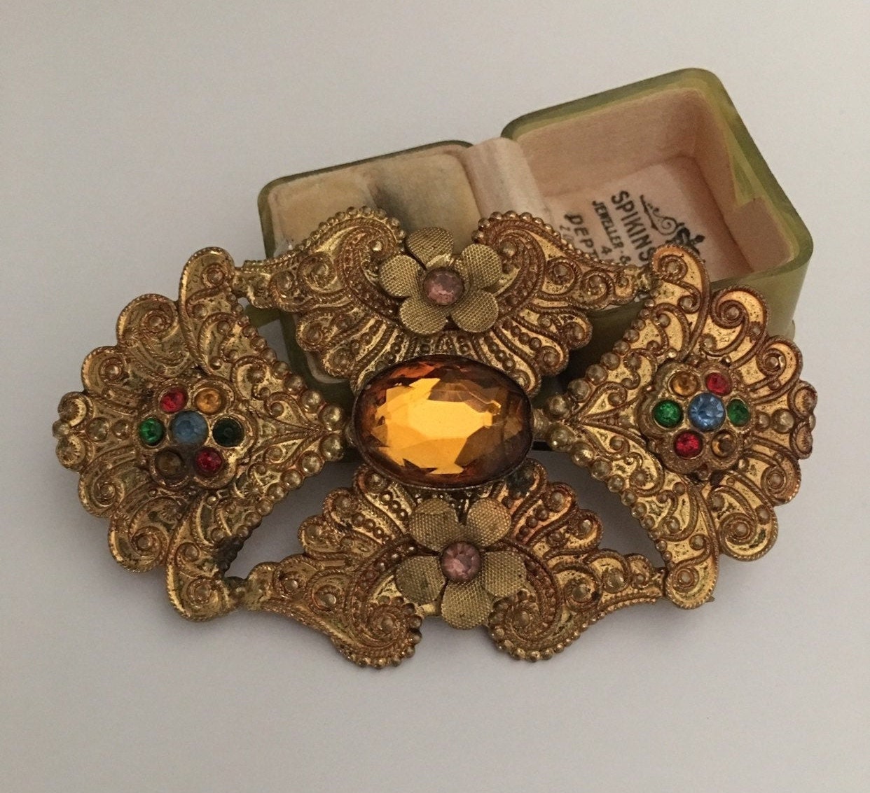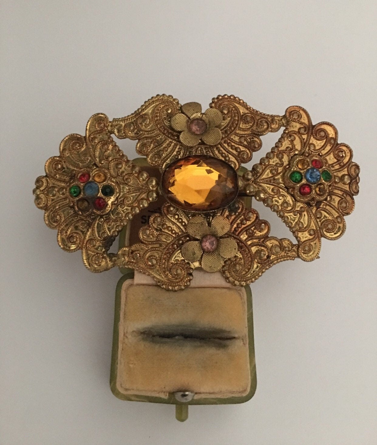 Fantastic Vintage Czech Renaissance style brooch with beautiful quality and highly detailed pressed metal flower design that is adorned with faceted amber and multi coloured Czech glass stones. The colour is breath taking. Divine craftsmanship it looks fabulous on.