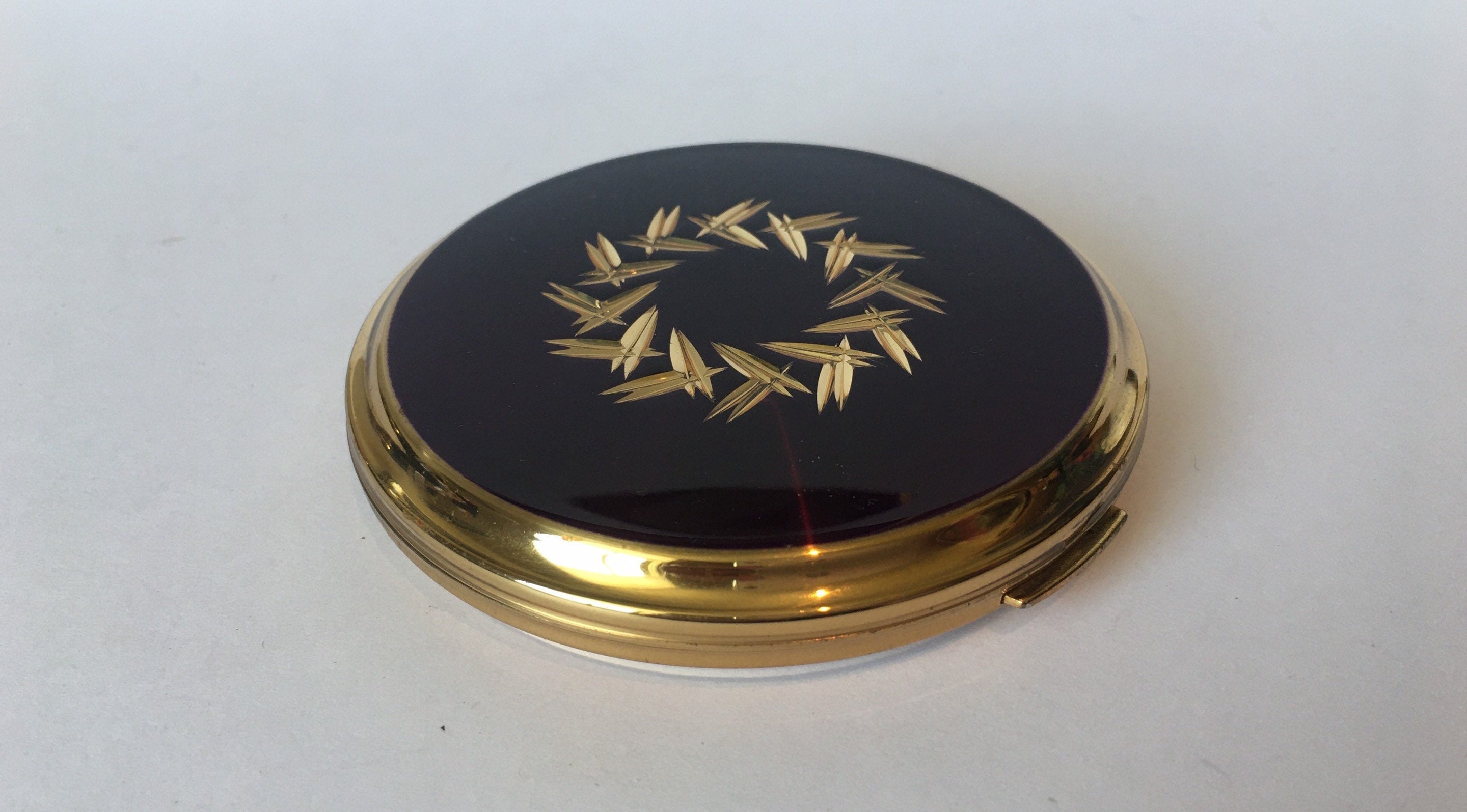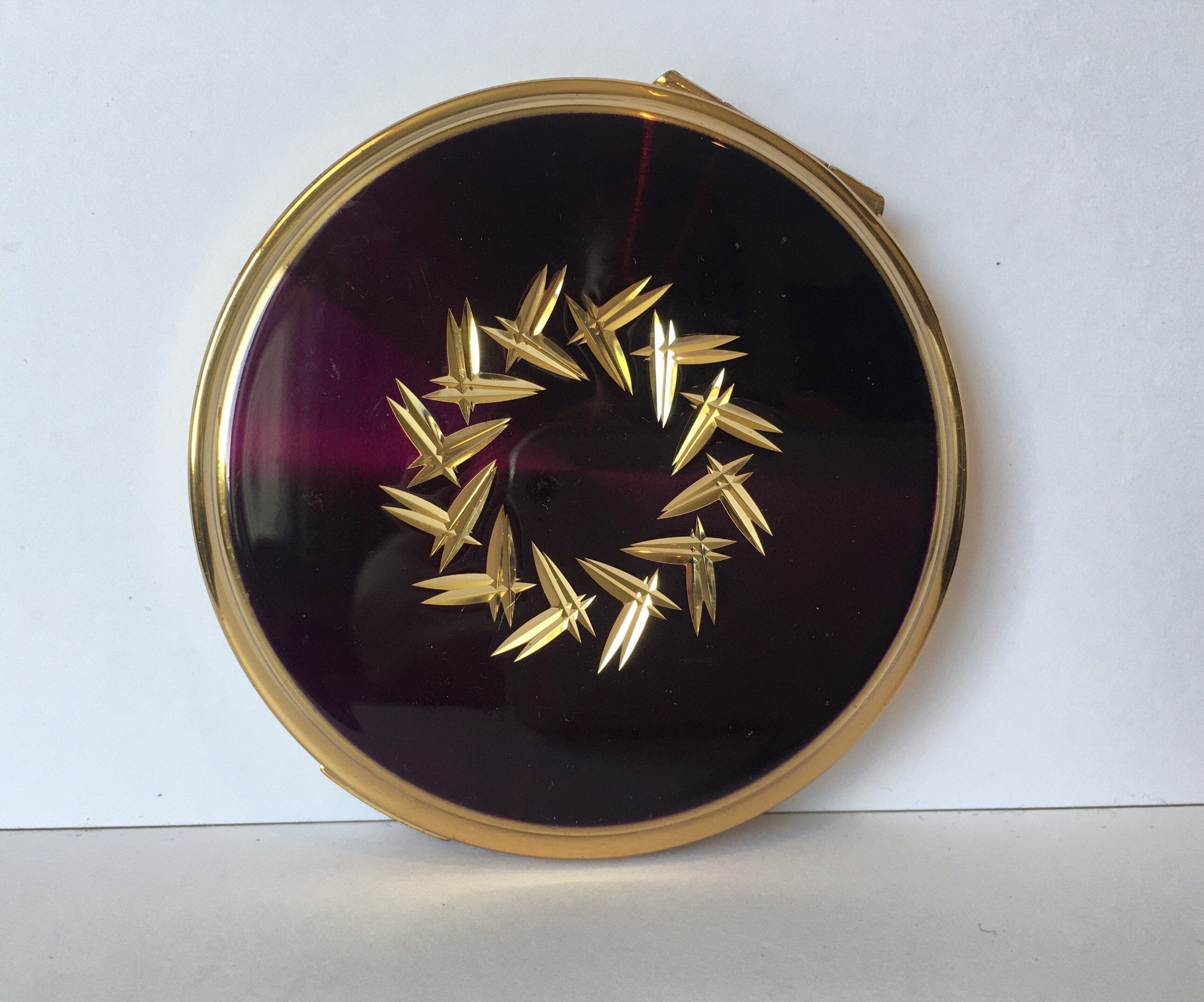 A wonderful Vintage Stratton Powder Compact with divine decorative gilt detail with exquisite iridescent Purple enamelling. Extremely rare item. A fantastic collectors piece. This item will not be shipped until 5th November, sorry for the delay. Thank you very much.