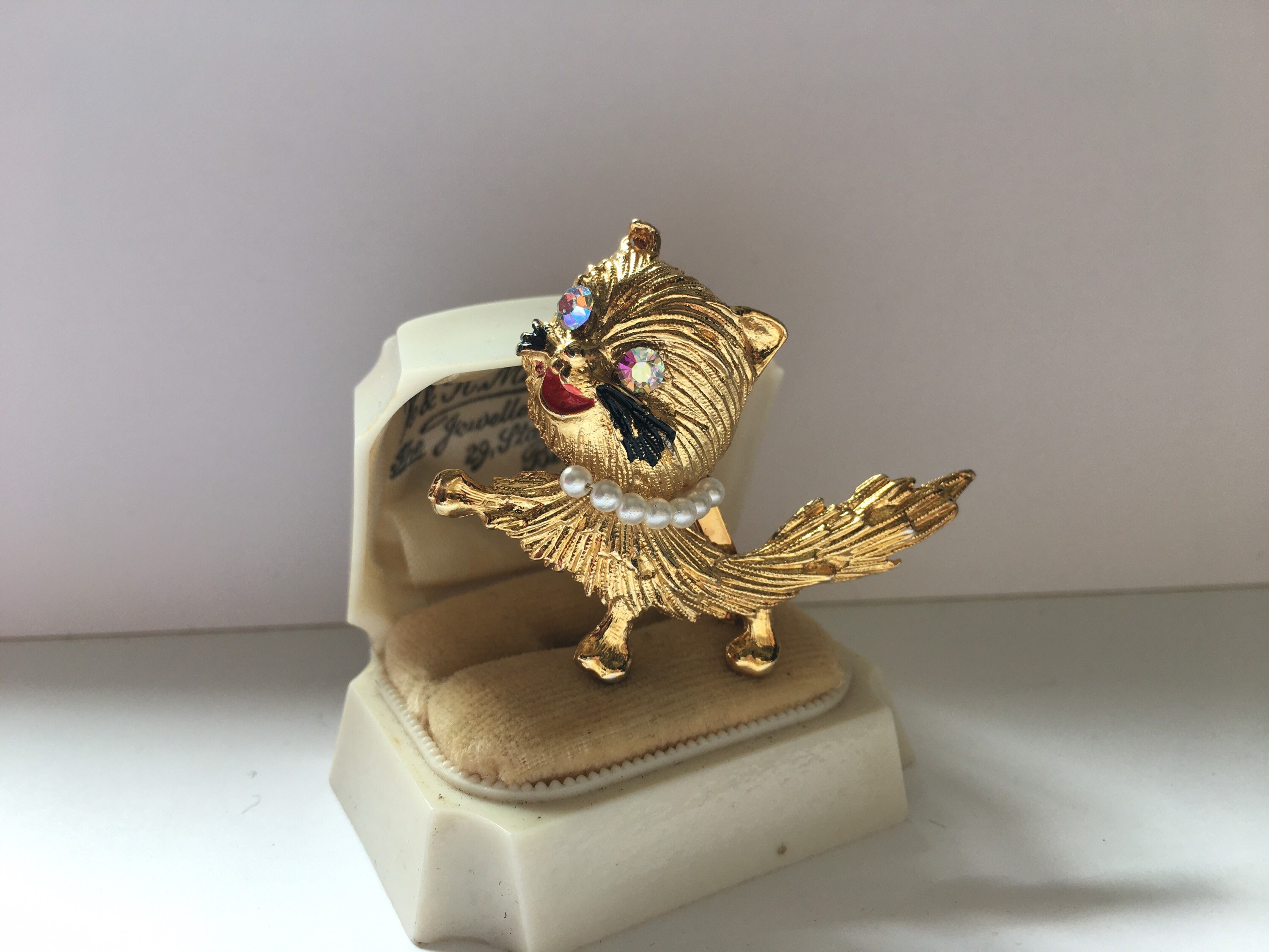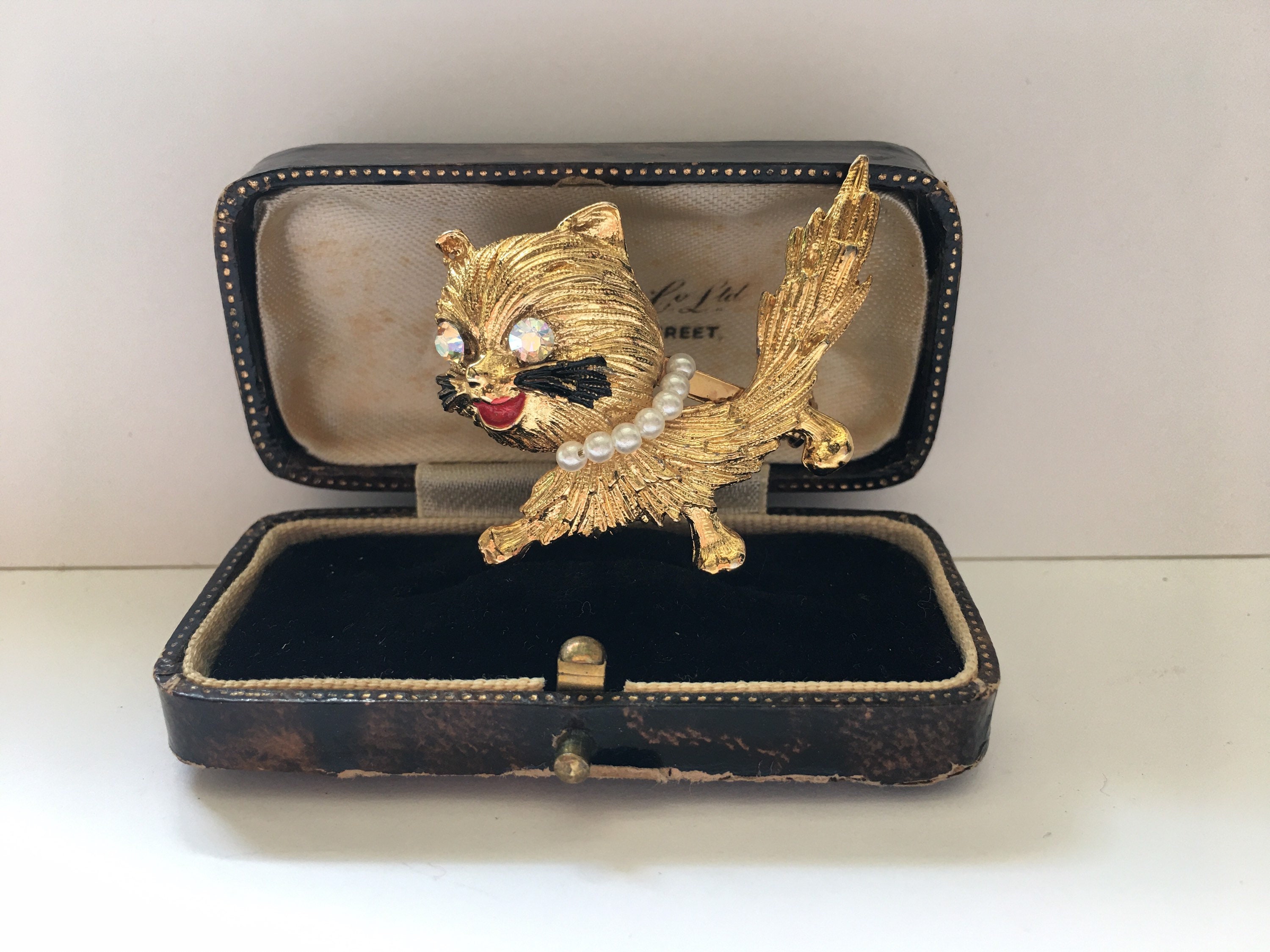 A fantastic Vintage Gold Cat brooch with beautiful detail and exquisite faux pearl collar. Super quality, very quirky rare period piece.