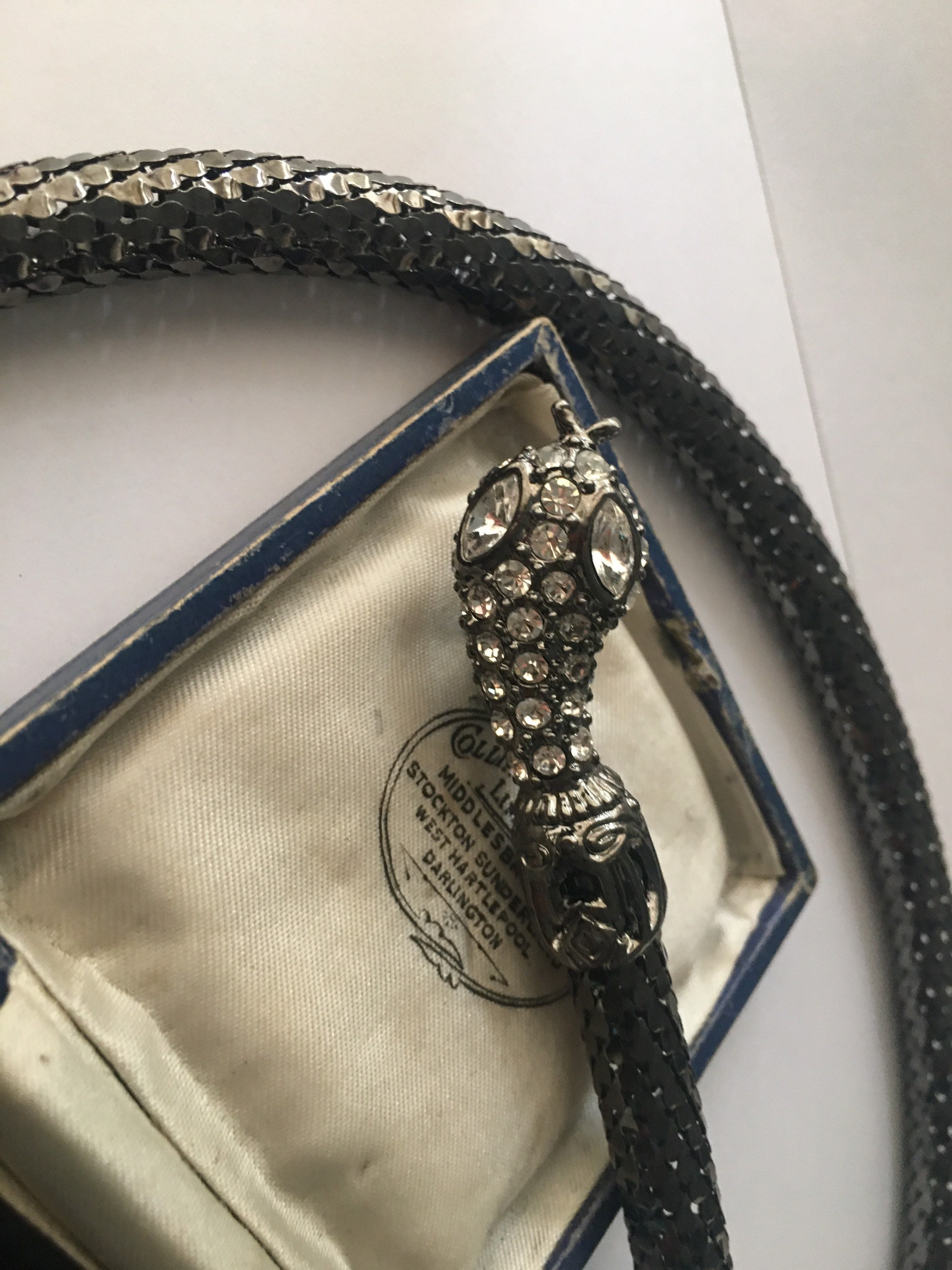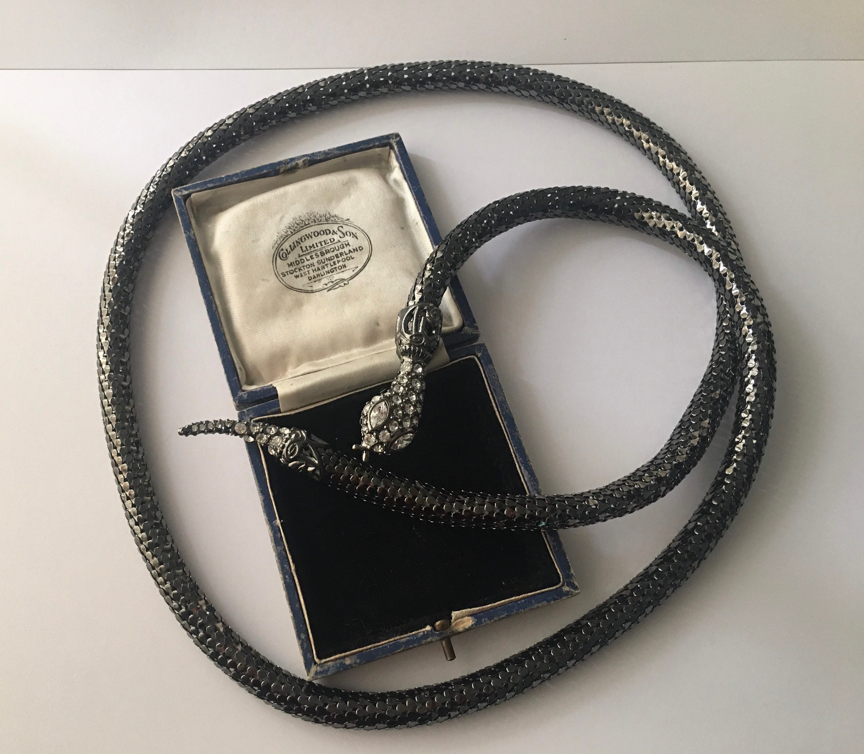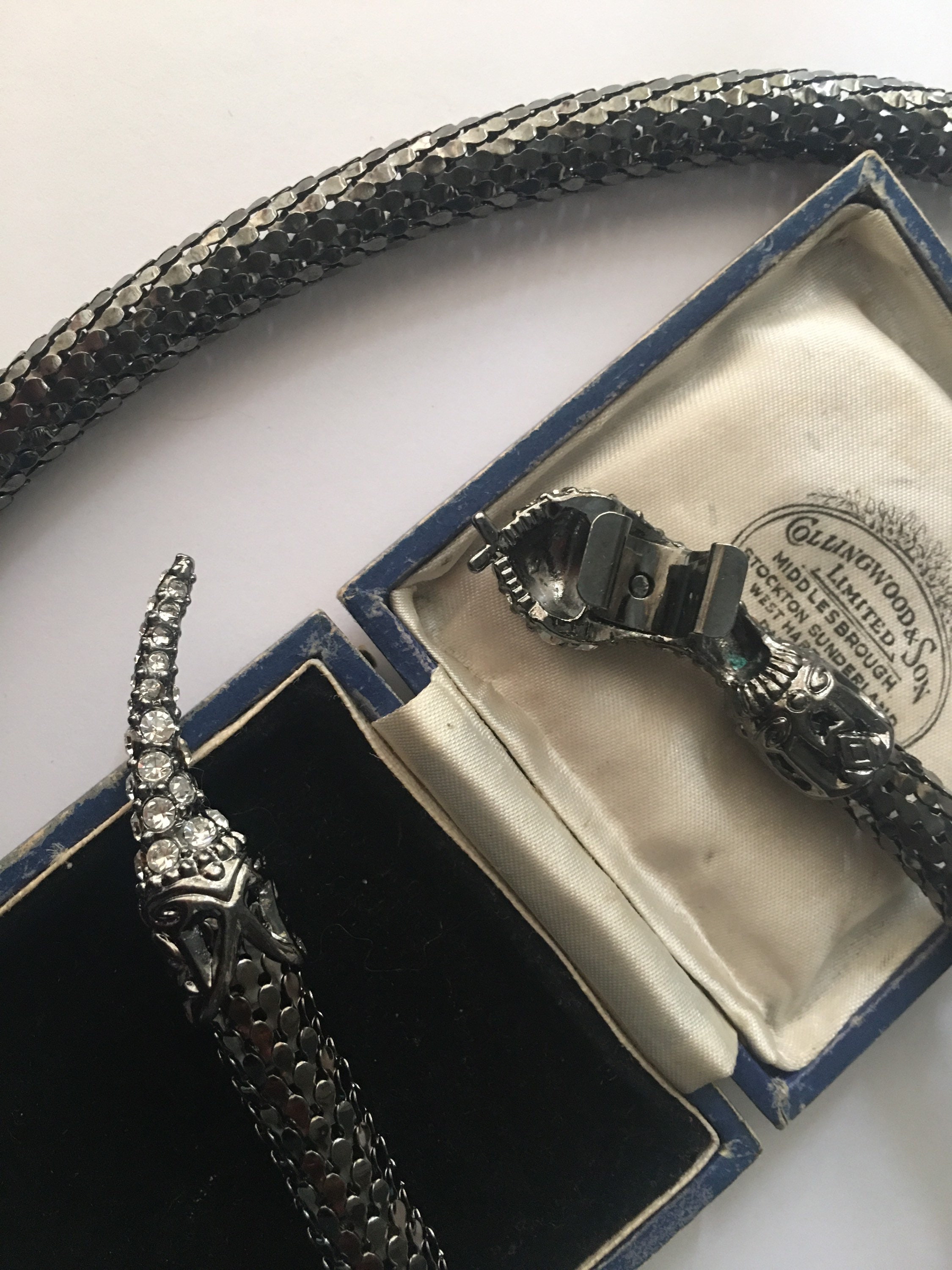 A wonderful Vintage Snake necklace with beautiful articulated movement set with divine Rhinestone eyes, this is great quality and the design is sublime. You can clip it to suit any length, hangs beautifully. Fantastic piece.