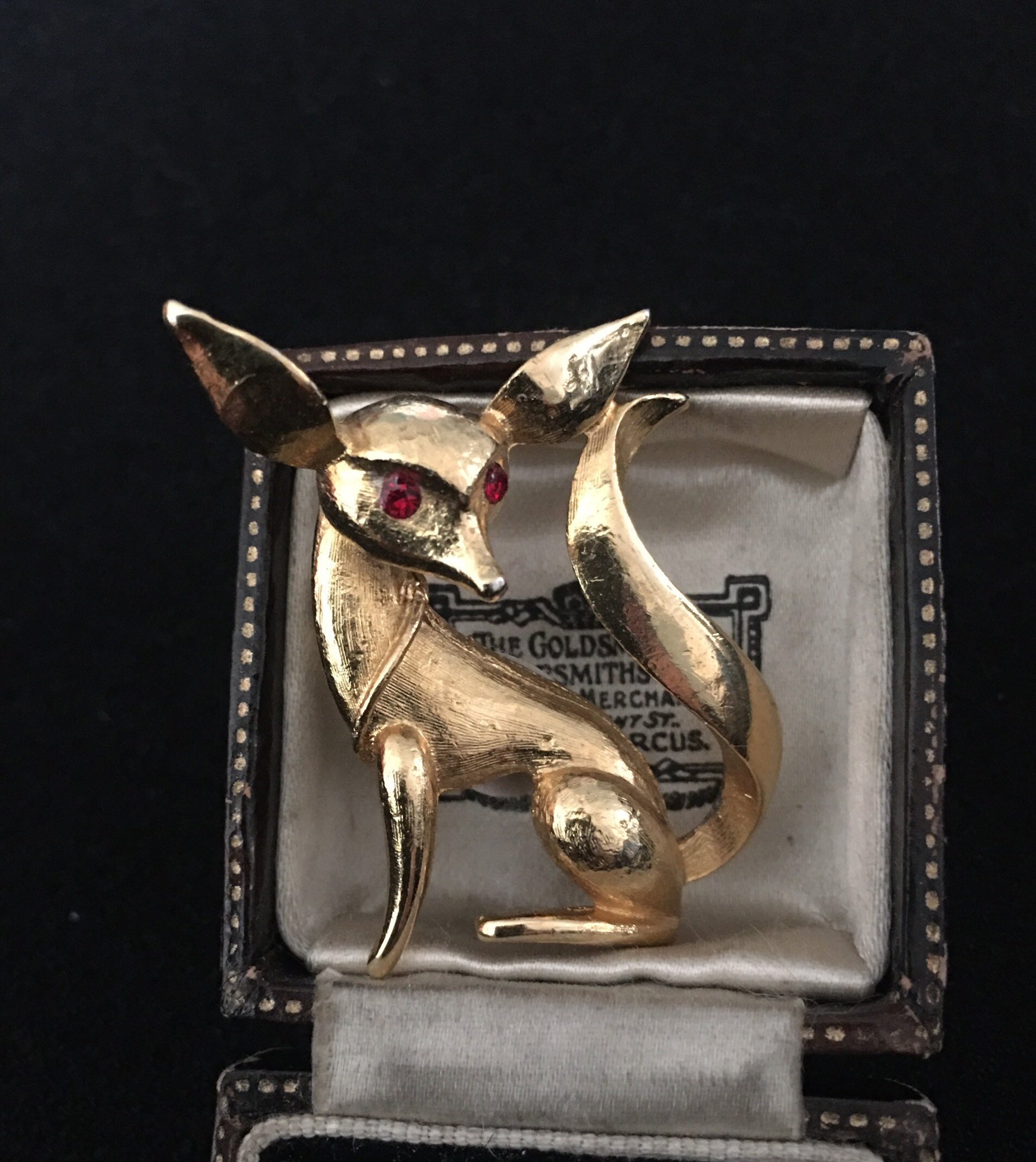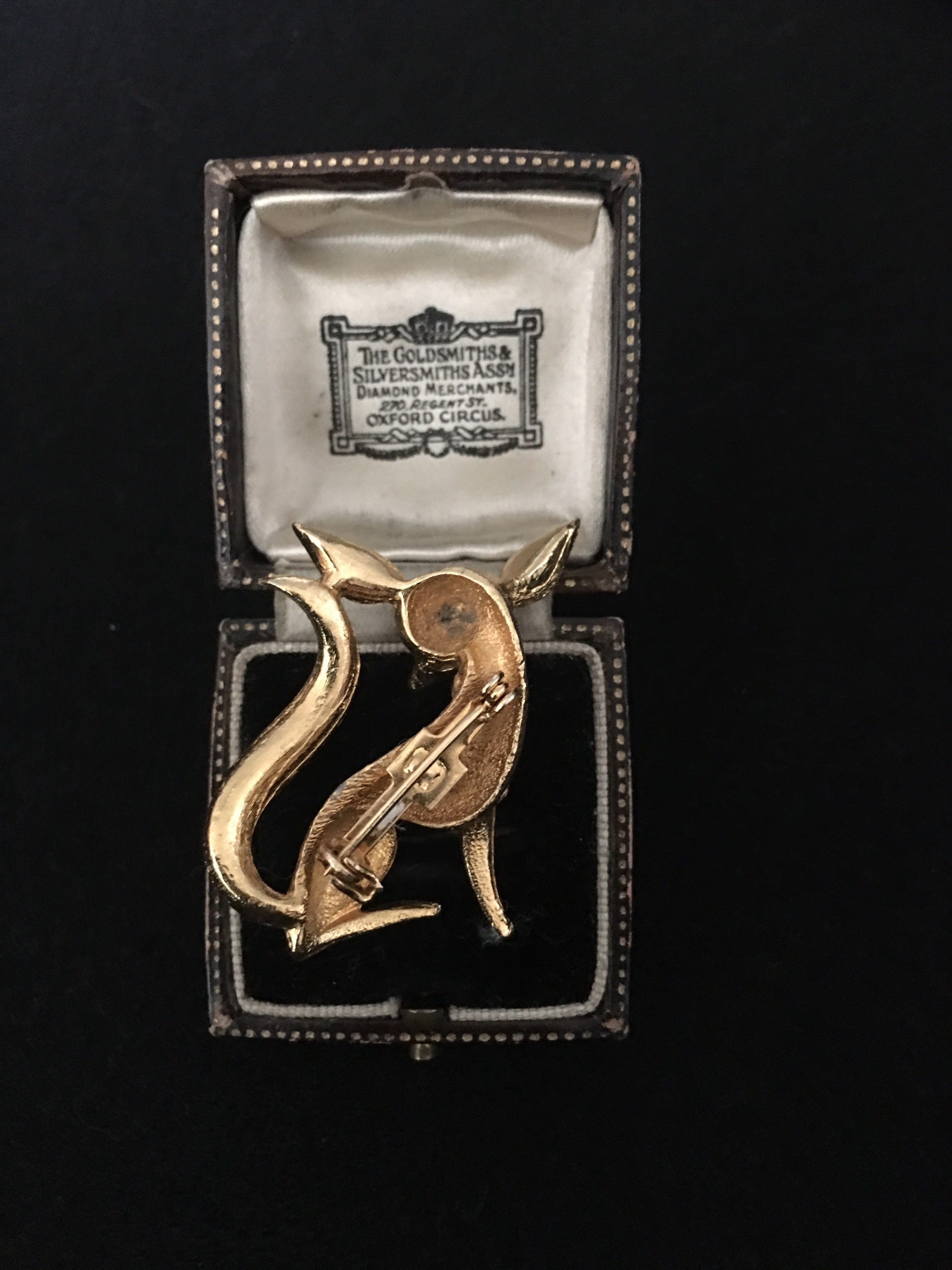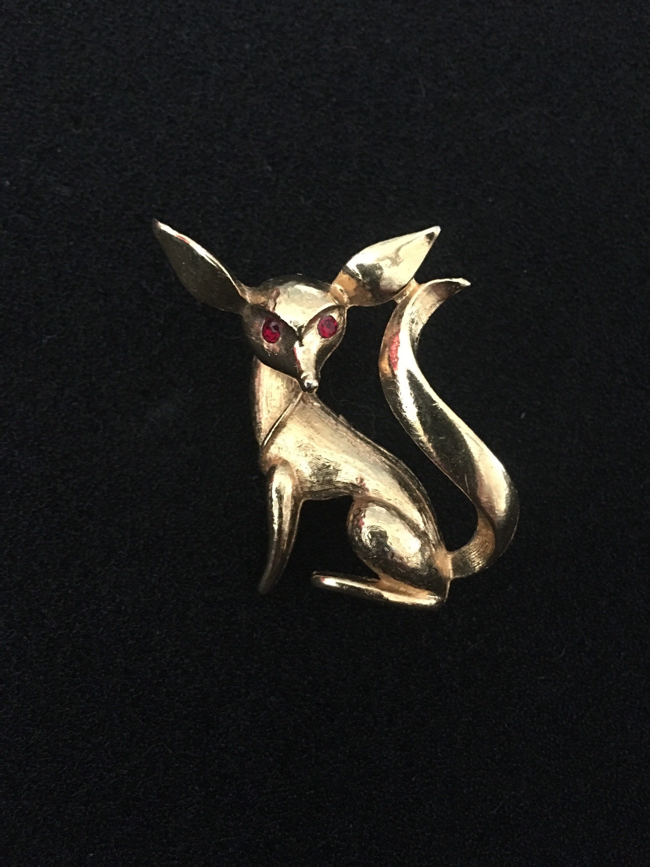 A Charming Vintage Gold dog costume brooch with beautiful Rhinestone detail and stylised design. Set with striking Rhinestone Eyes. Superb statement piece for any doggie lover.