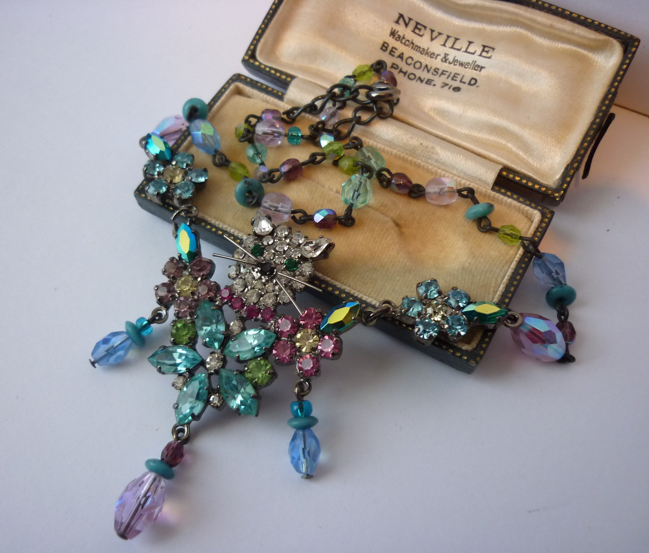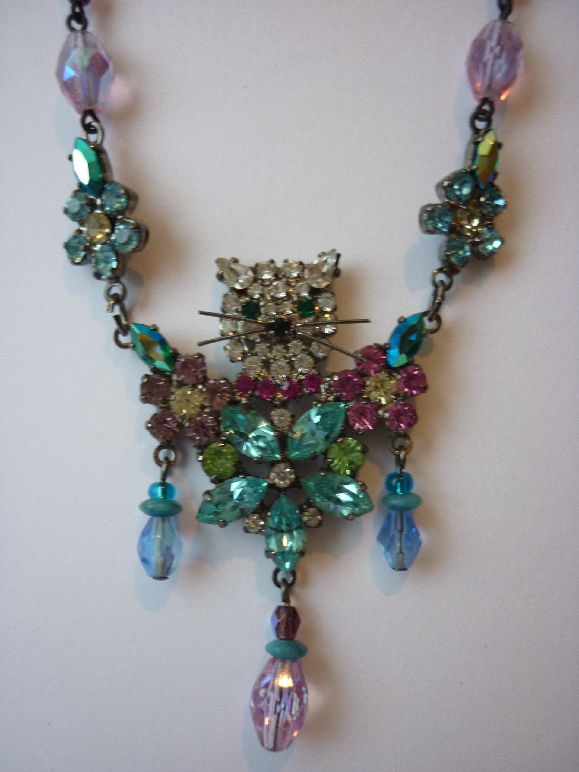 A magnificent Vintage Butler and Wilson delightful Cat necklace with gorgeous Rhinestone flower and bead detail. Fantastically made and extremely rare. Very interesting quirky design. Divine statement piece with beautiful colour. Makes me smile every time. Hard not to keep this collectors piece.